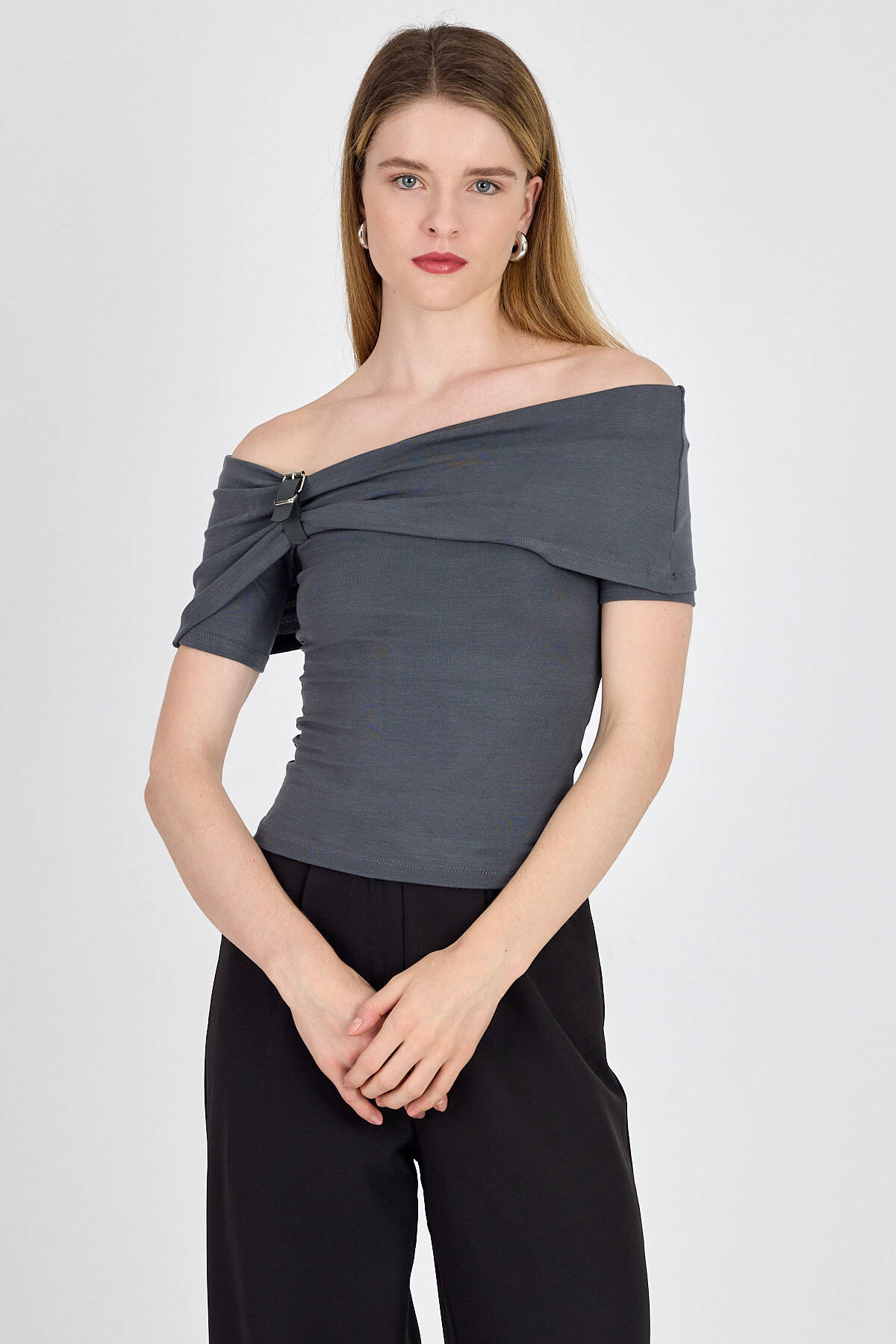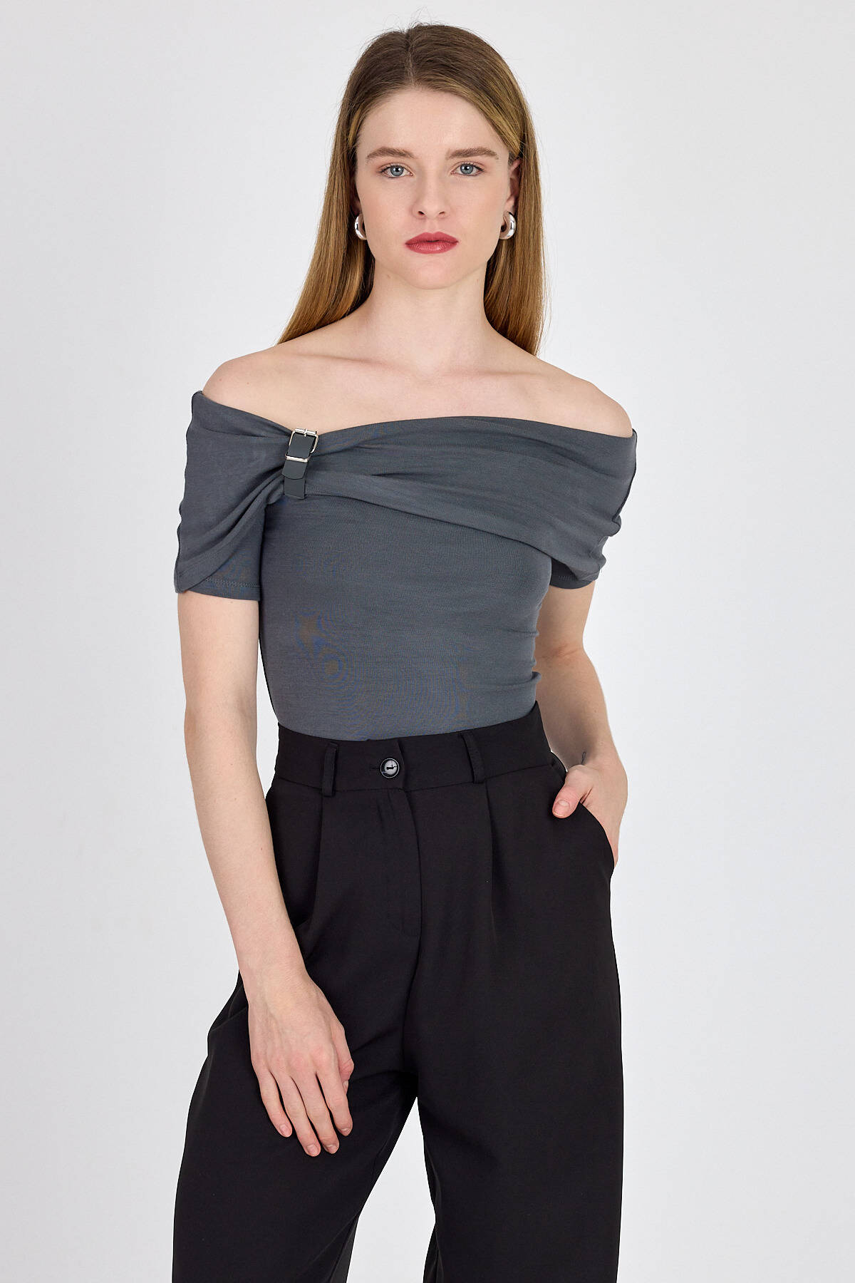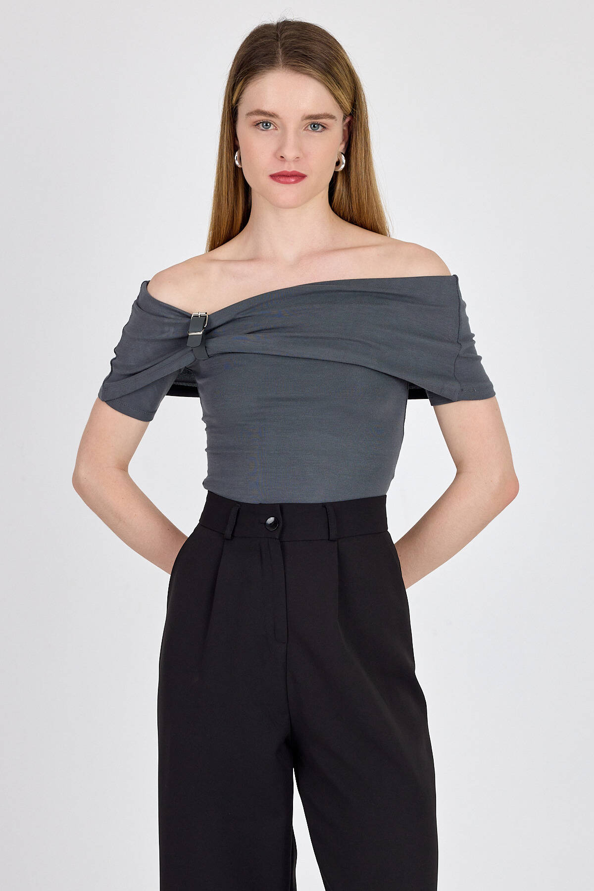 Antrasit Viskoz/Yumuşak Kumaş Madonna Yaka Toka Detaylı Bluz 1475