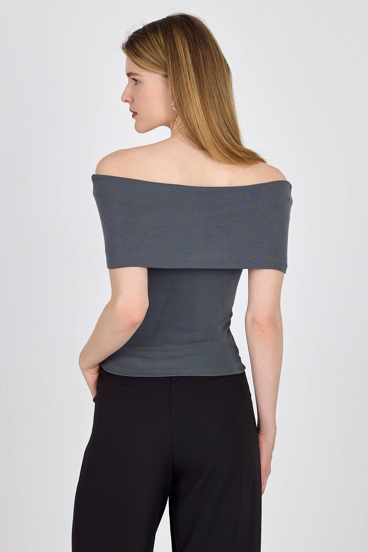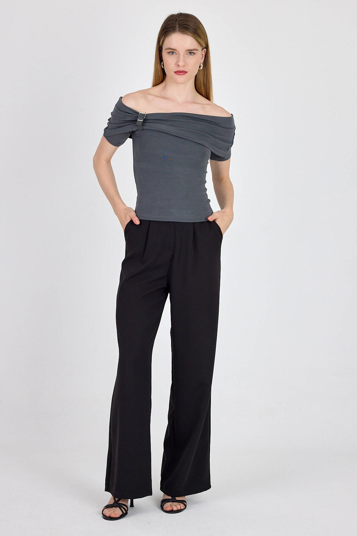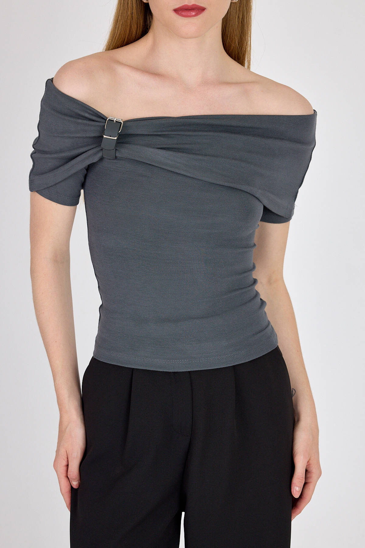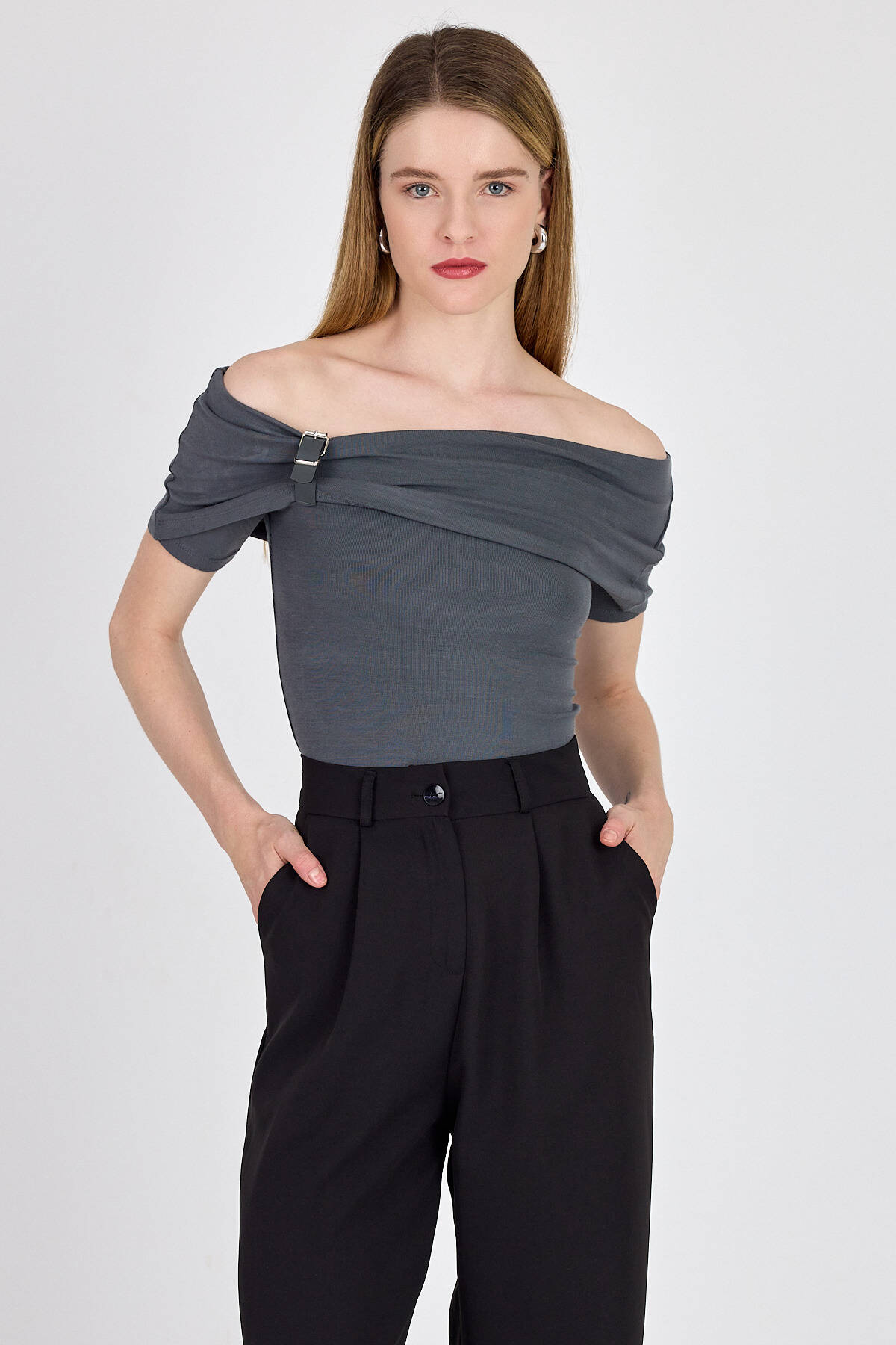 Antrasit Viskoz/Yumuşak Kumaş Madonna Yaka Toka Detaylı Bluz 1475