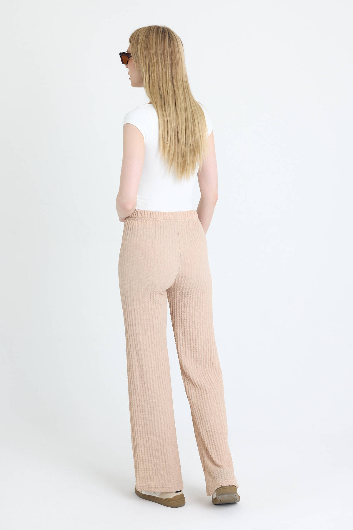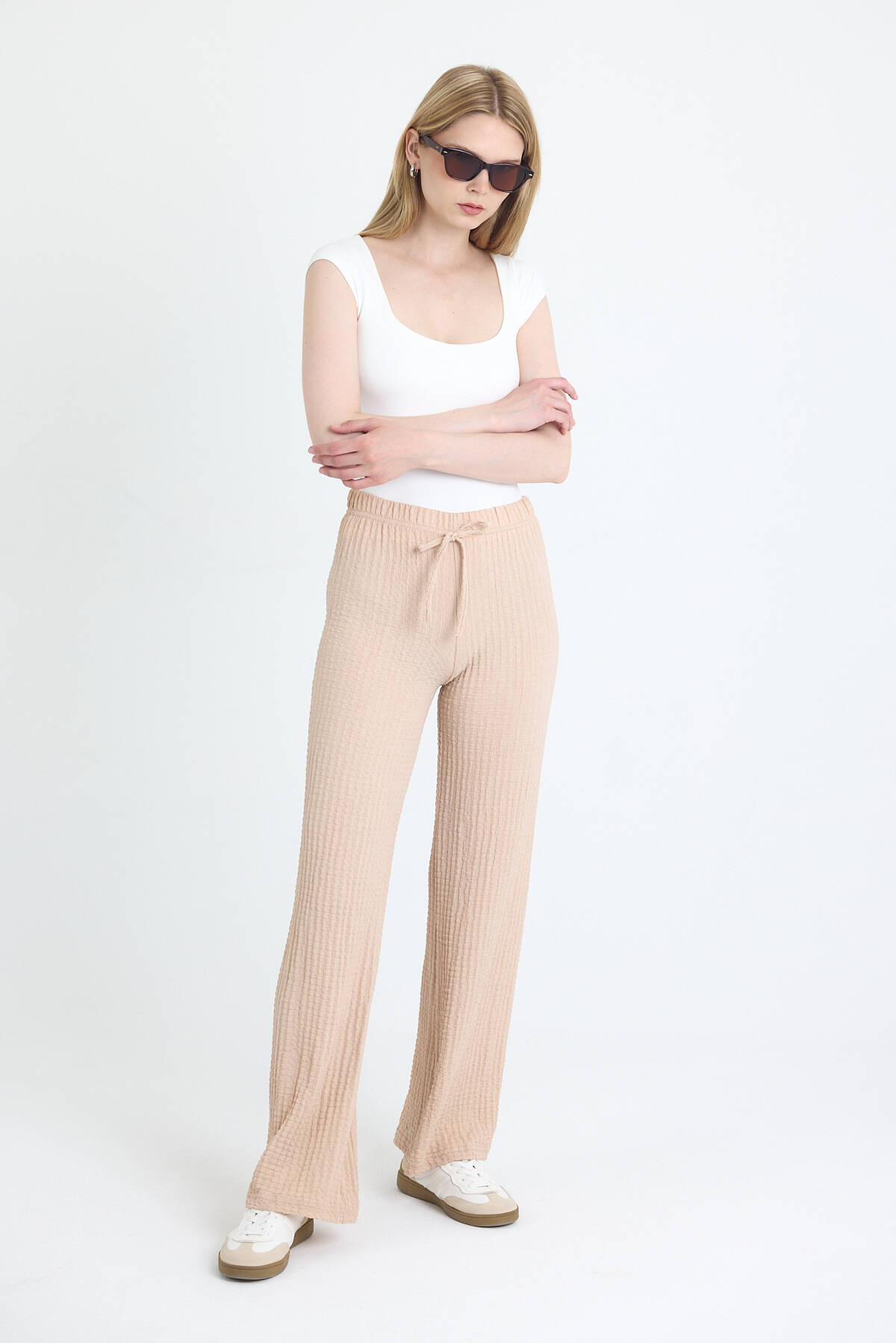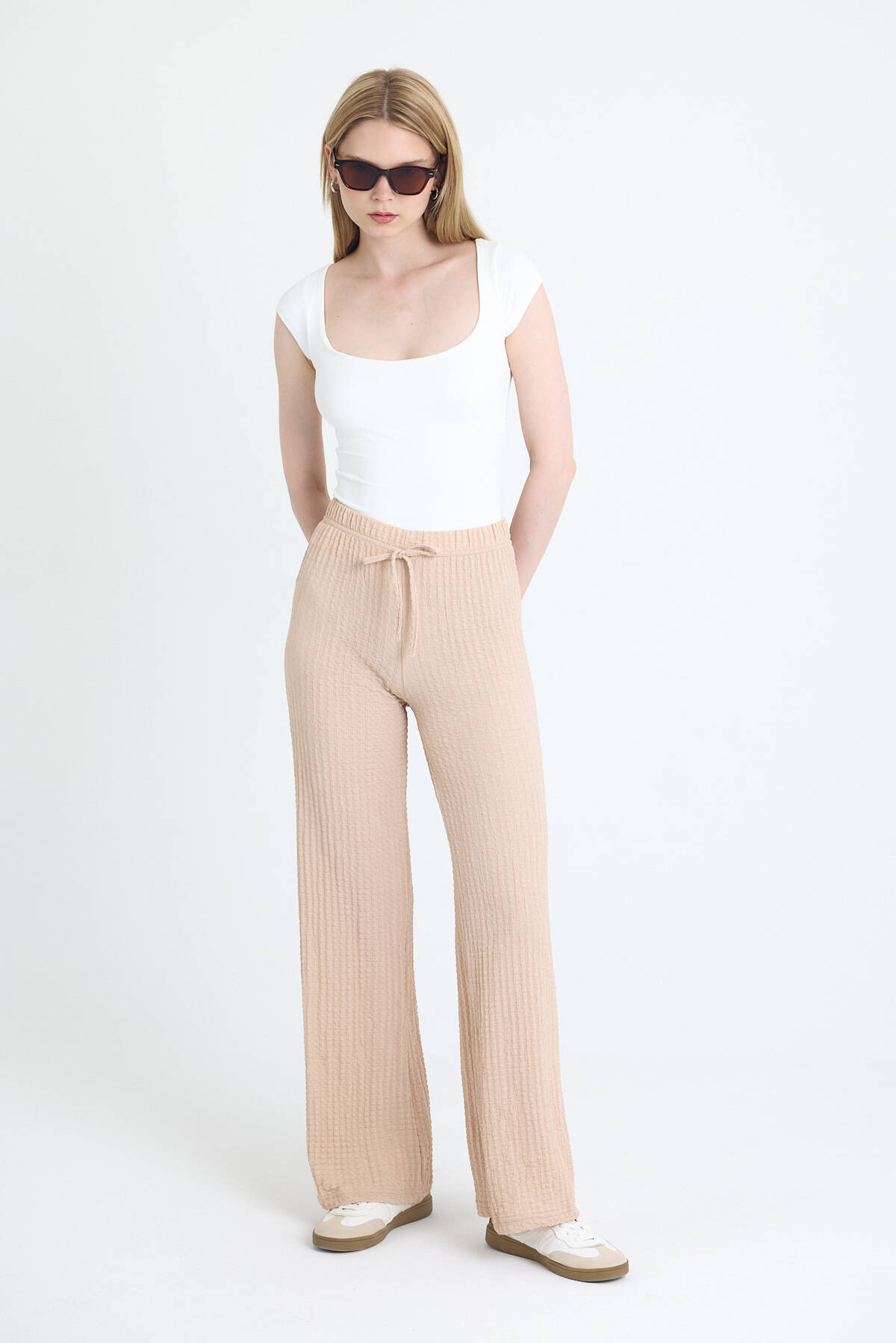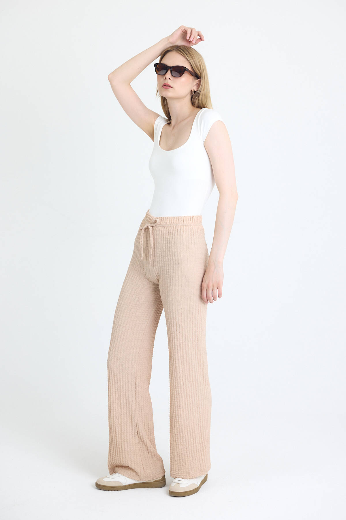 Bej Geniş Paça Dökümlü Bürümcük Kumaş Pantolon 326