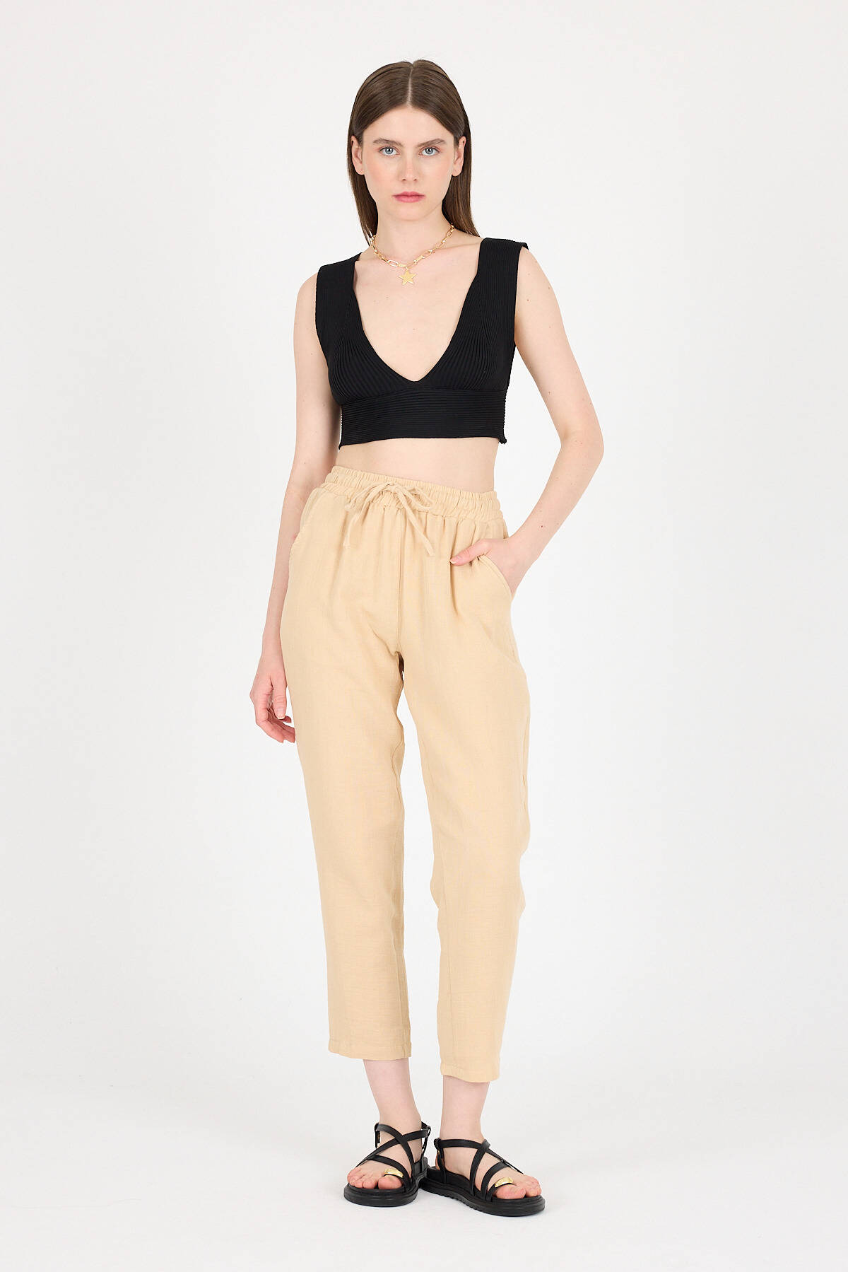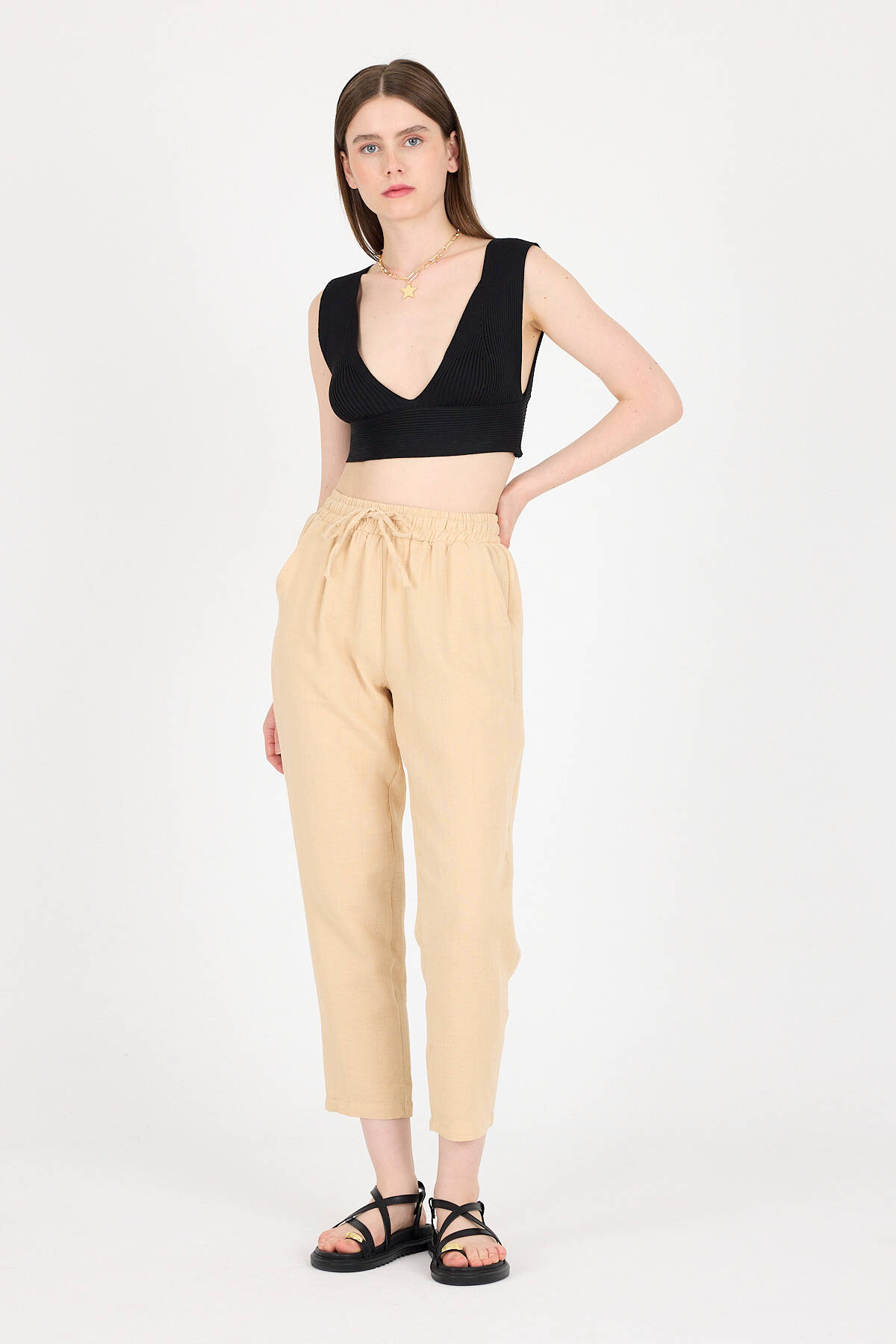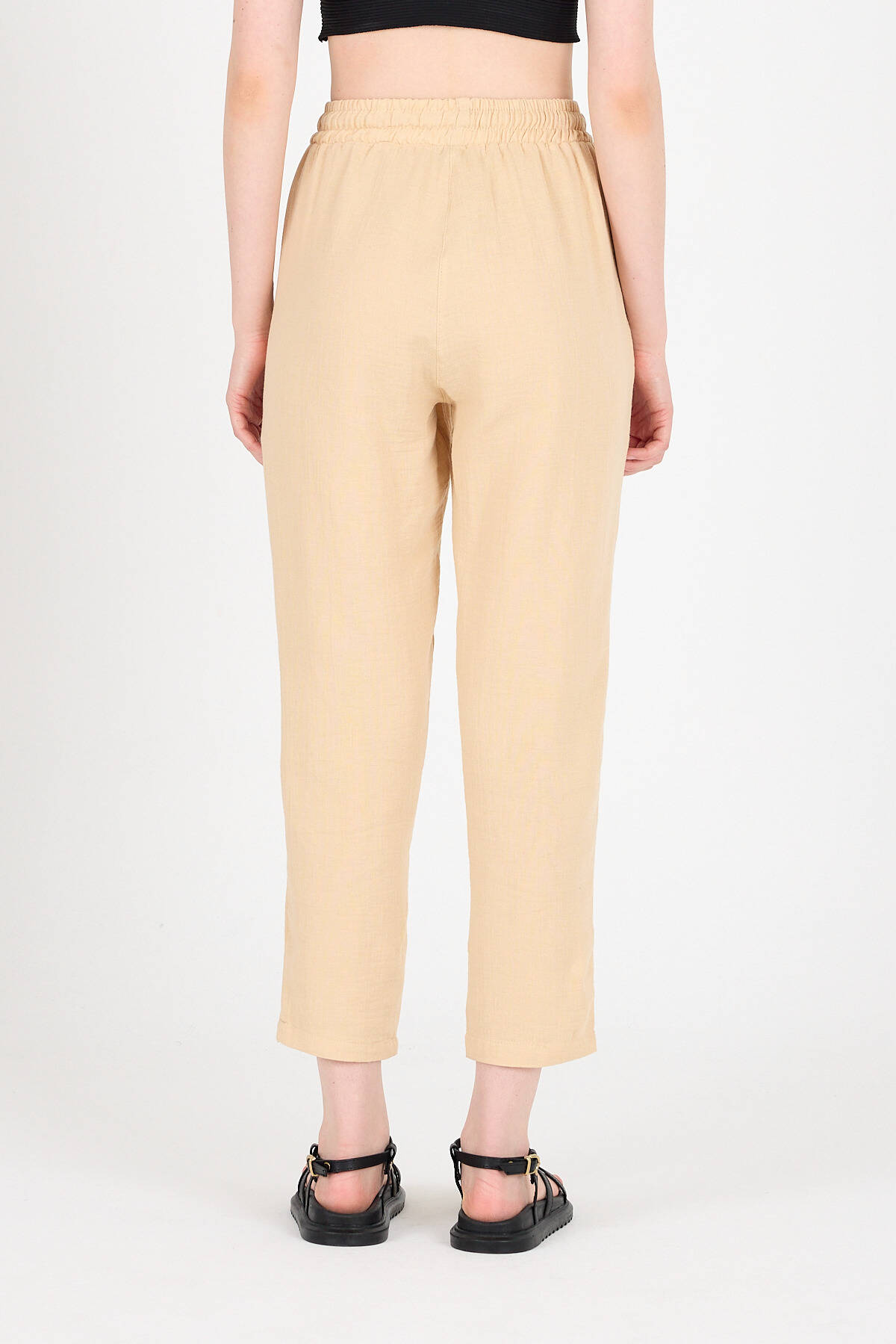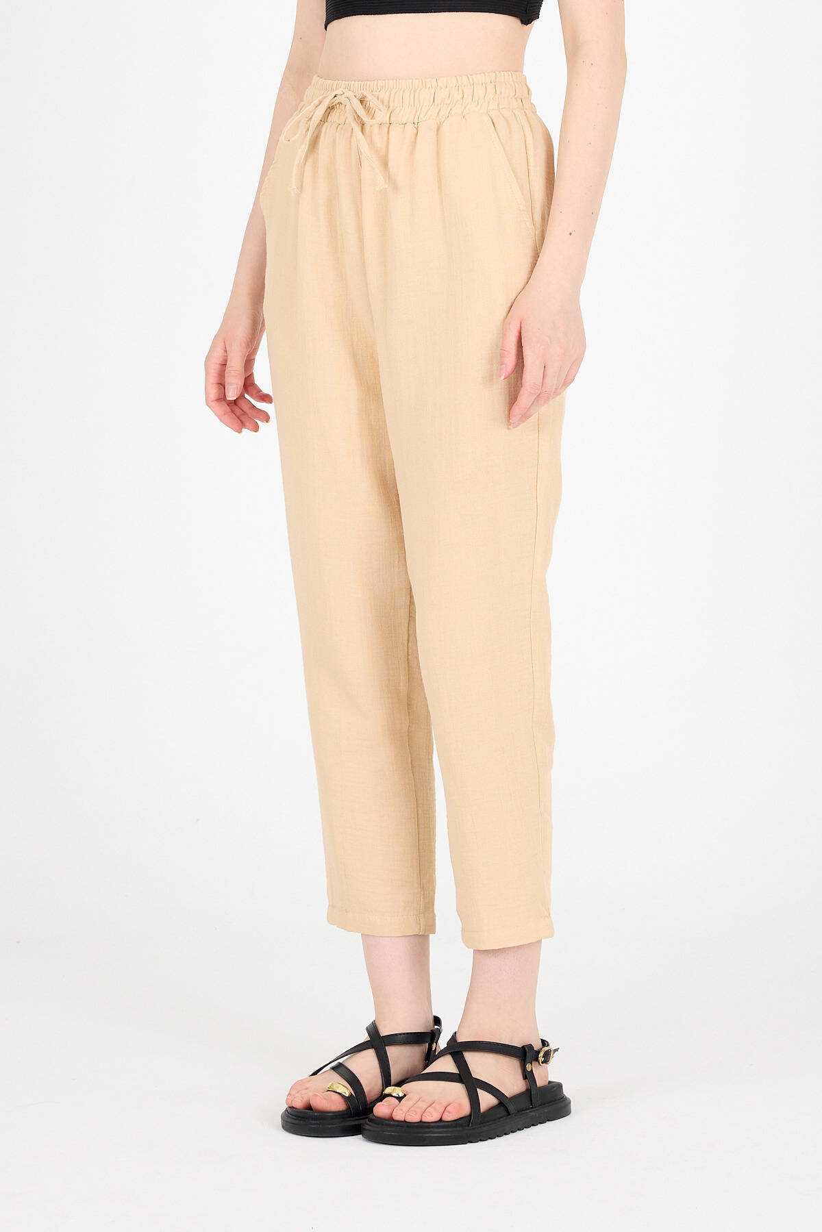 Bej Müslin %100 Pamuk Beli Lastikli Pantolon 8055A