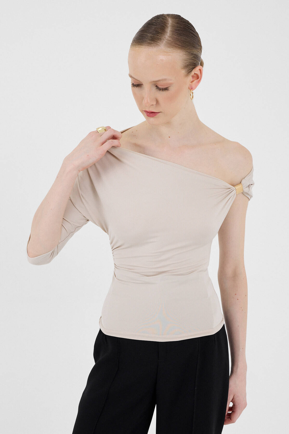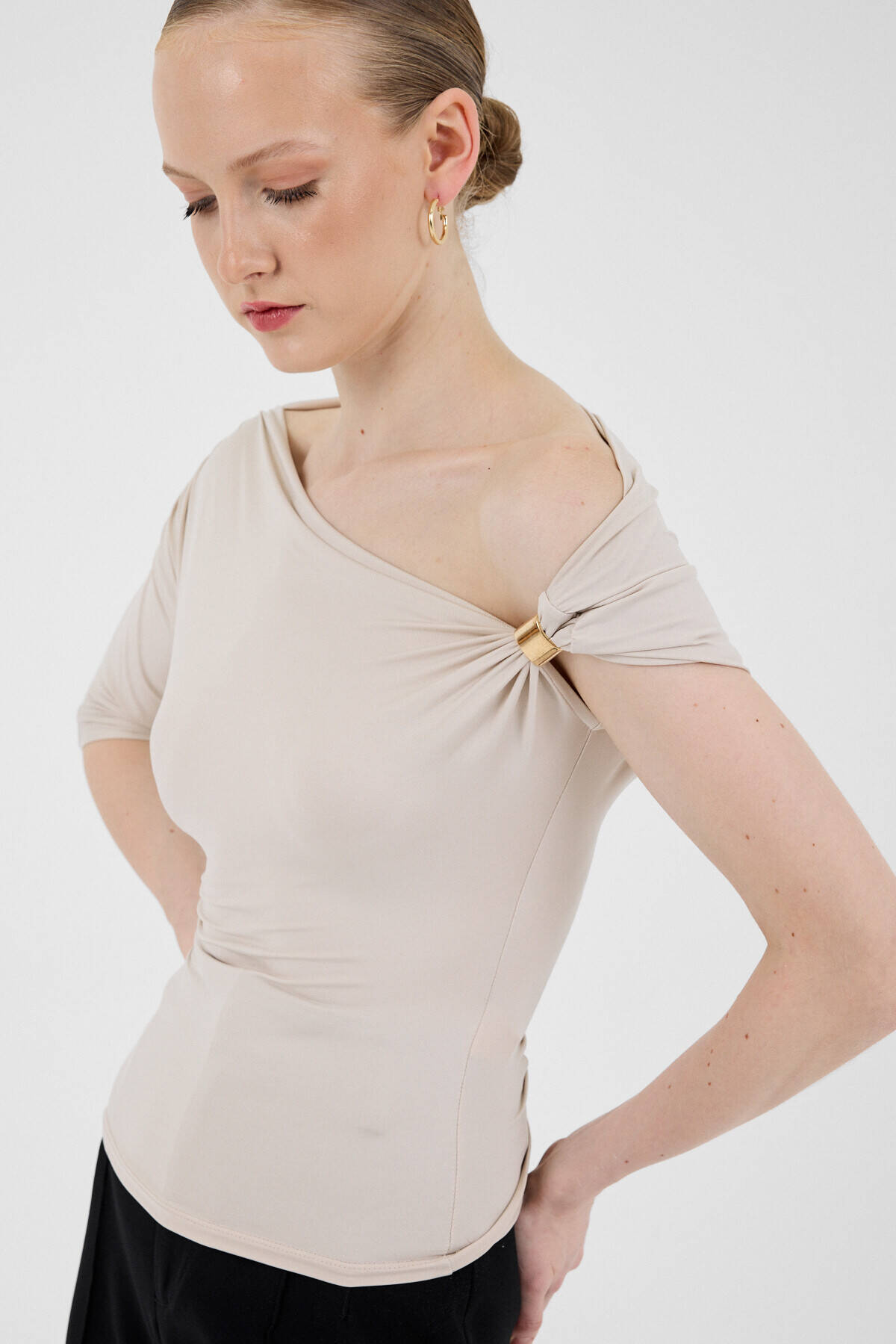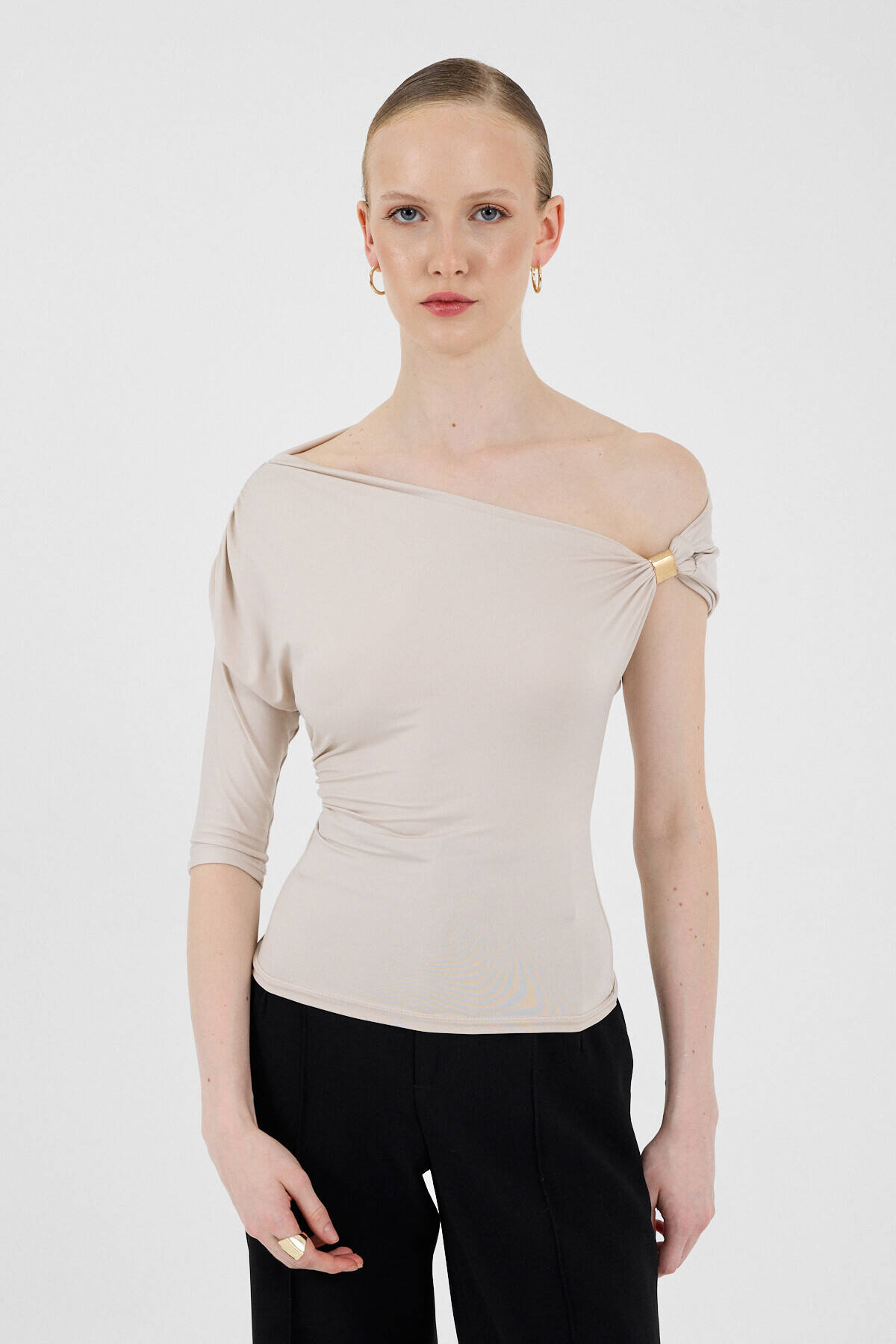 Bej Omuz Aksesuar Detaylı Yarım Kol Bluz 2490
