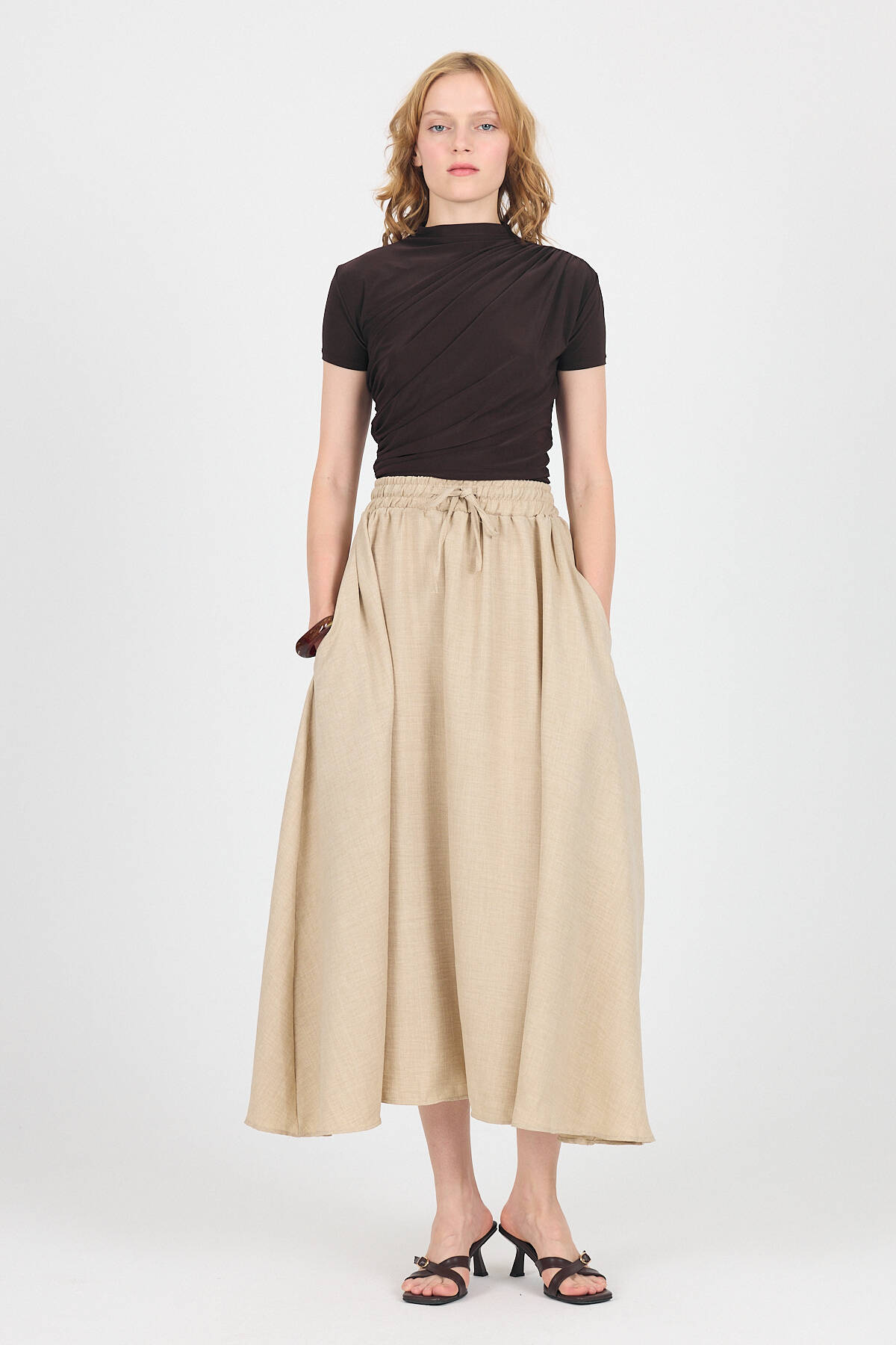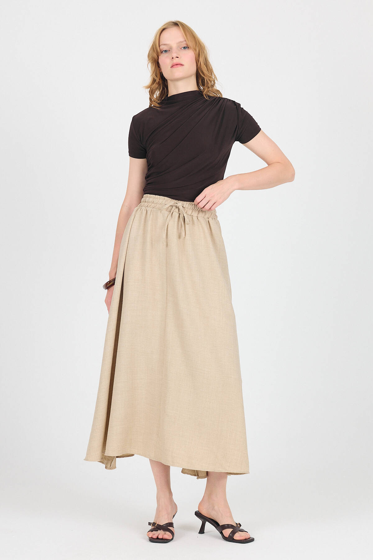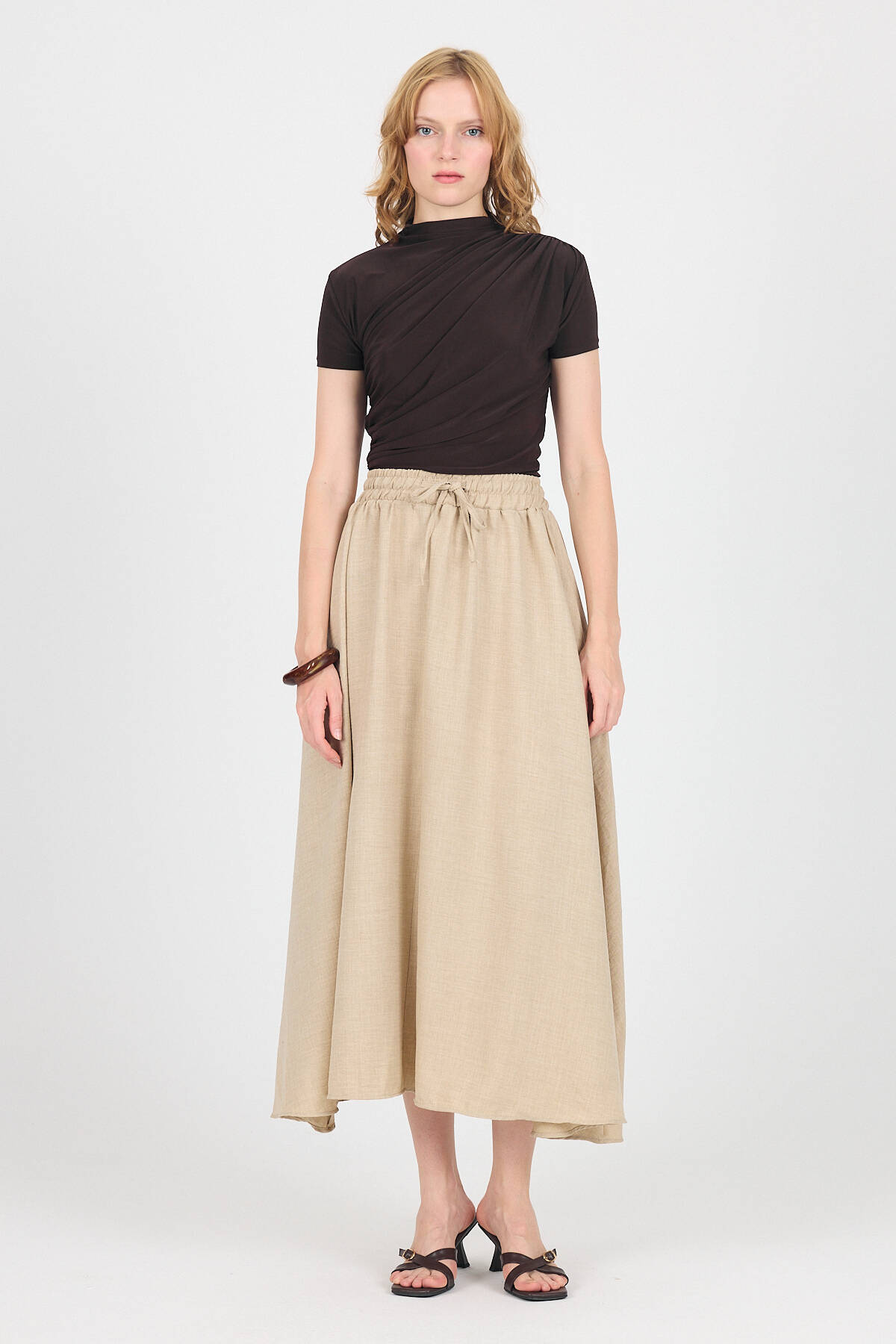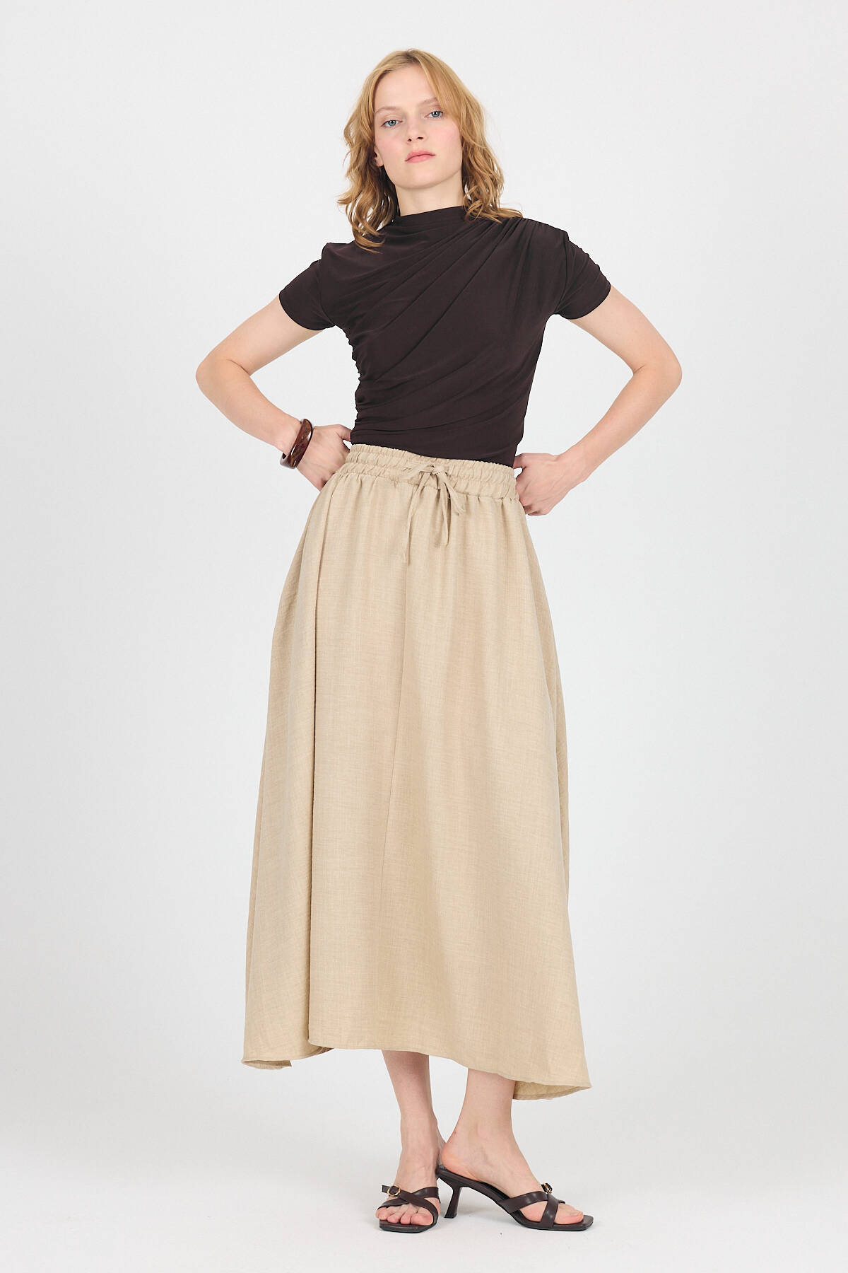 Bej Pamuklu Çan Kesim Bağcıklı Uzun Etek 8024