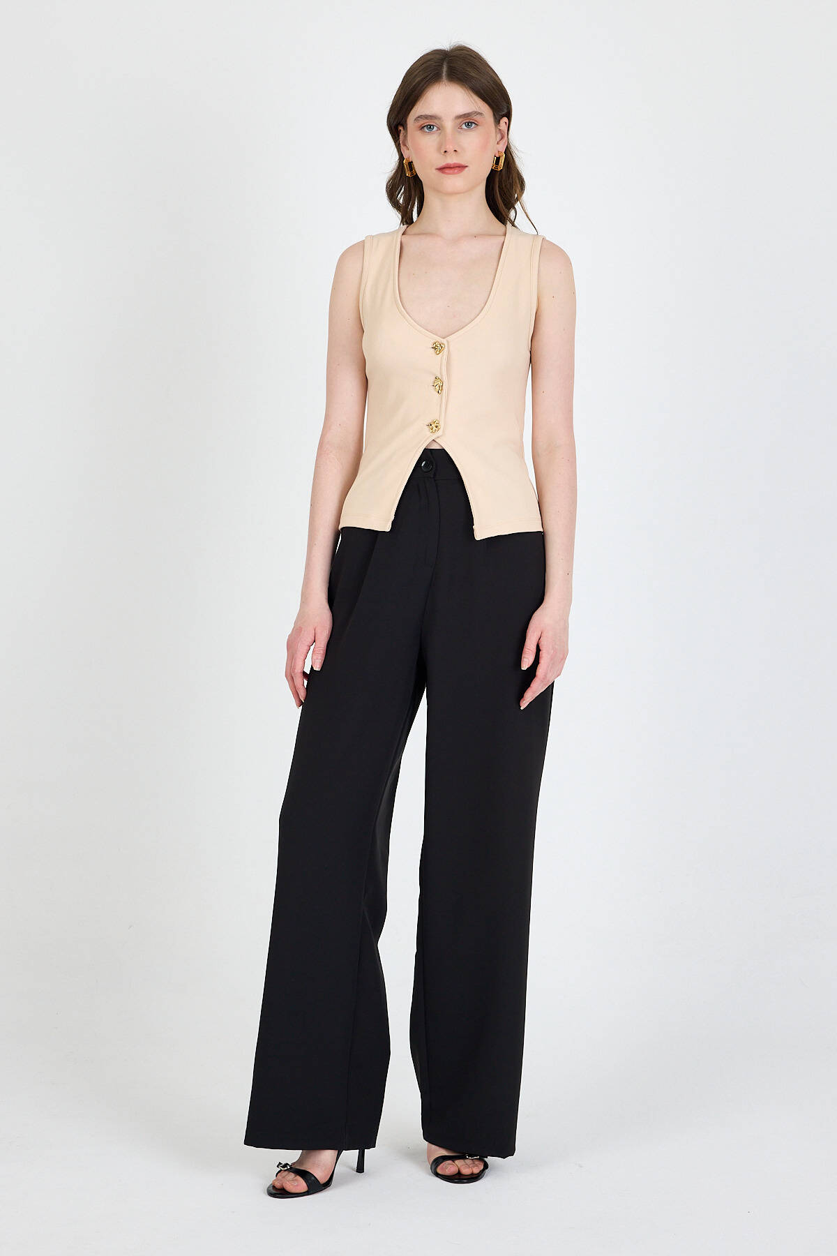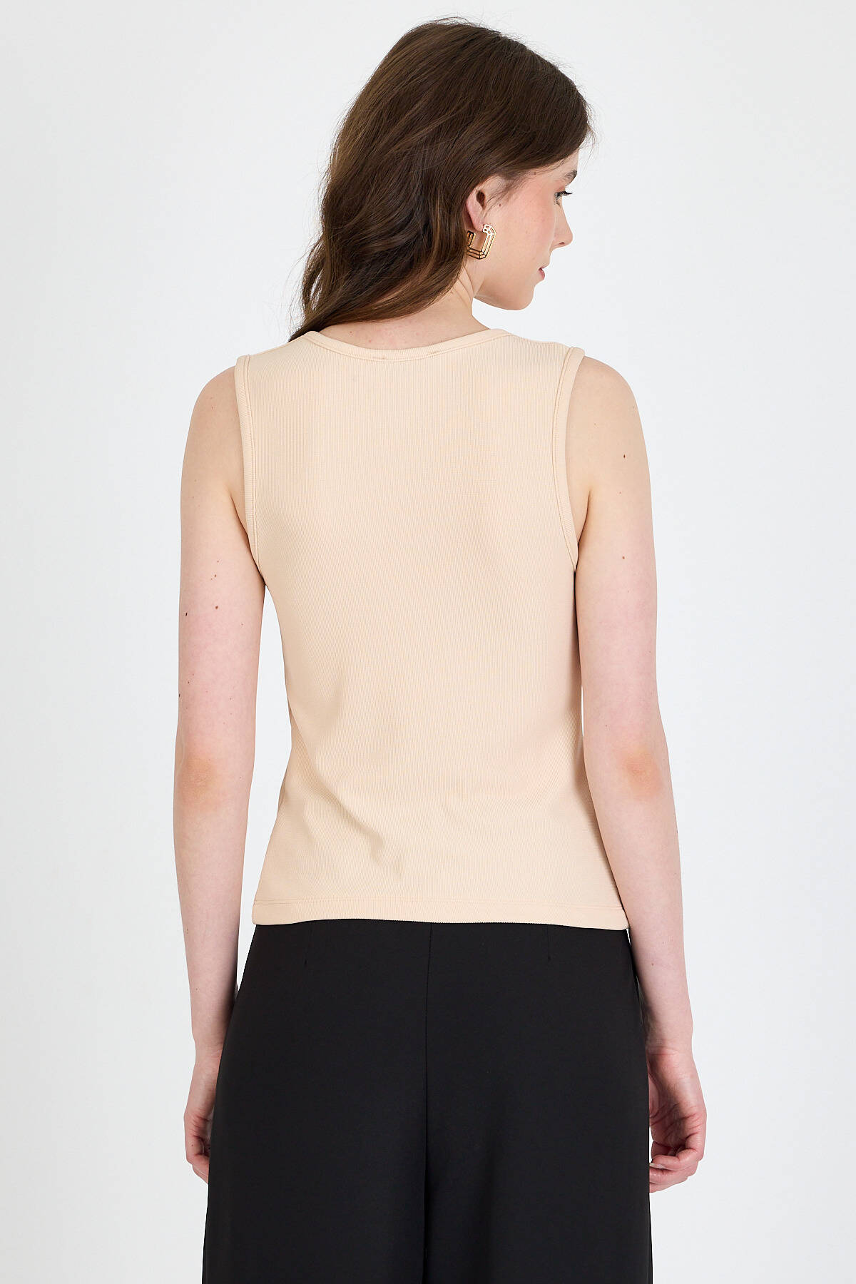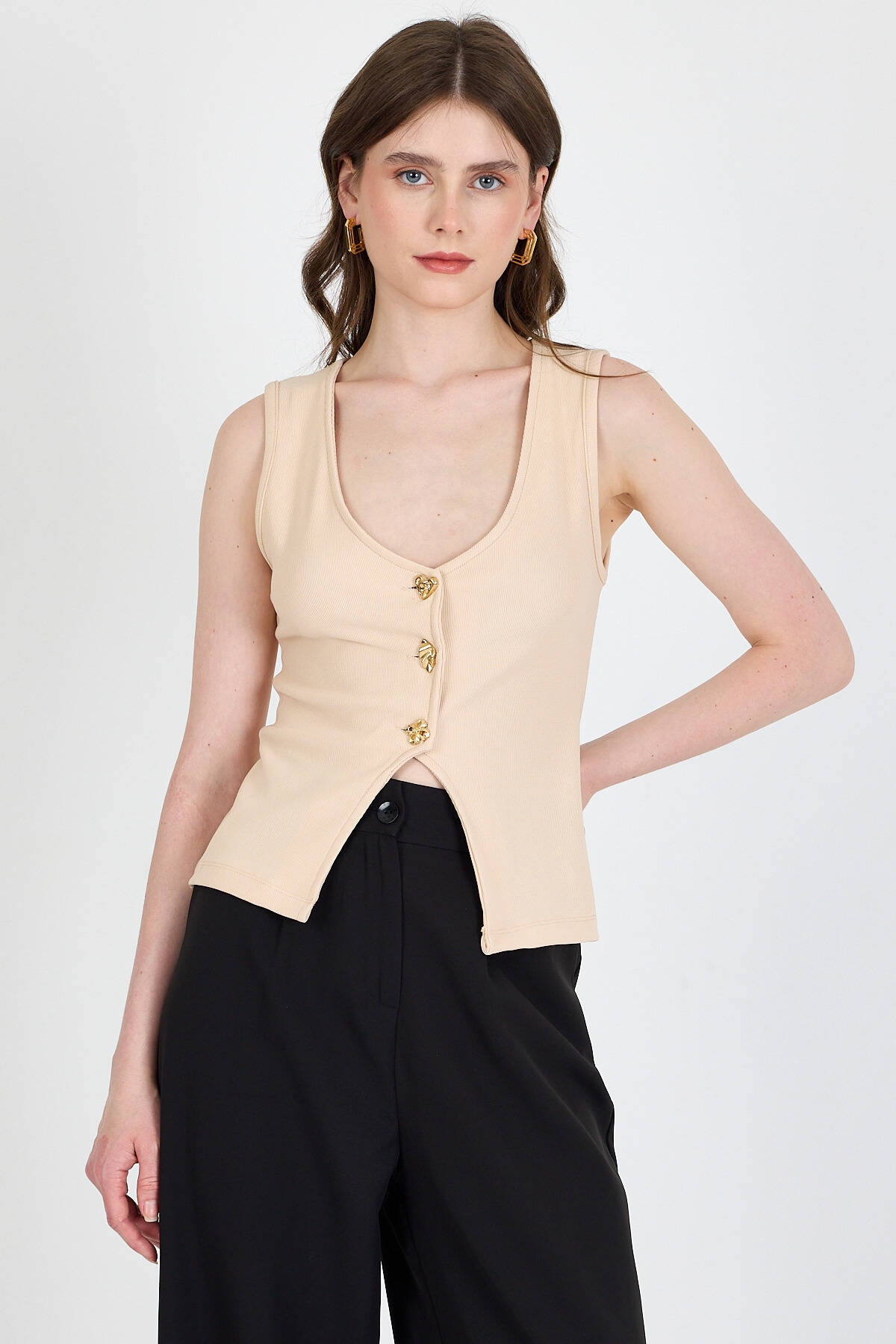 Bej V Yaka Düğme Detaylı Kolsuz Bluz 018