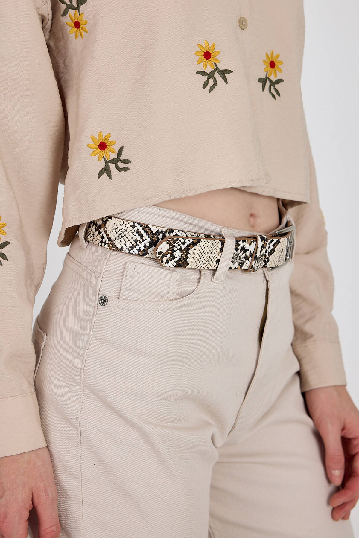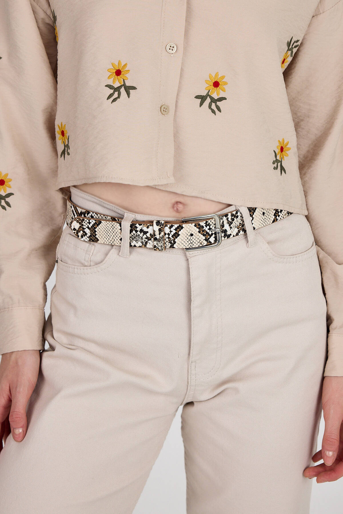 Bej Yılan Derisi Desenli Gümüş Tokalı Kemer 422