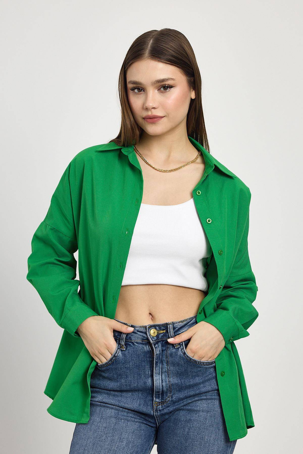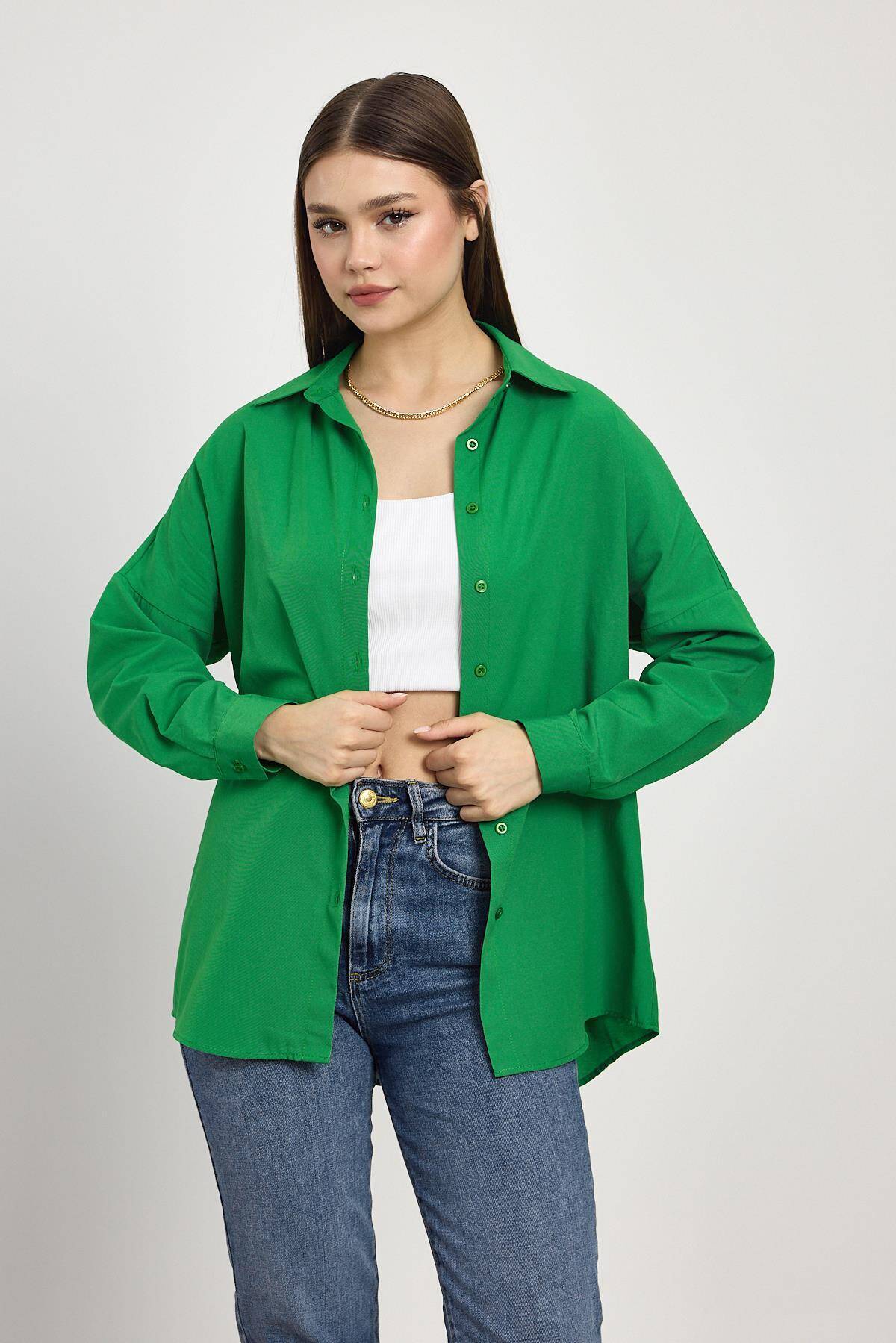 Benetton Yeşili Relaxed Fit Rahat Kesim Basic Gömlek - 6621A