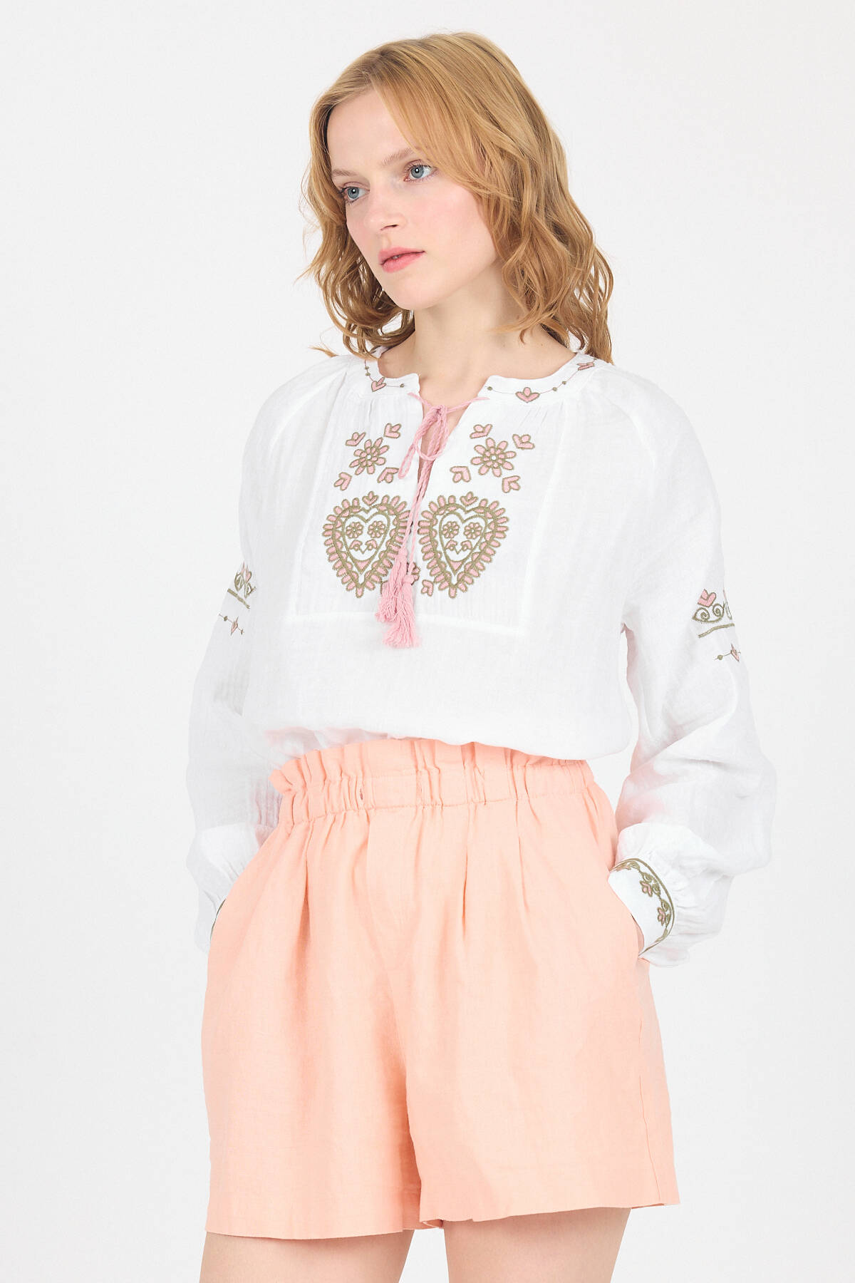 Beyaz %100 Pamuk Etnik Nakış Detaylı Müslin Gömlek 6323