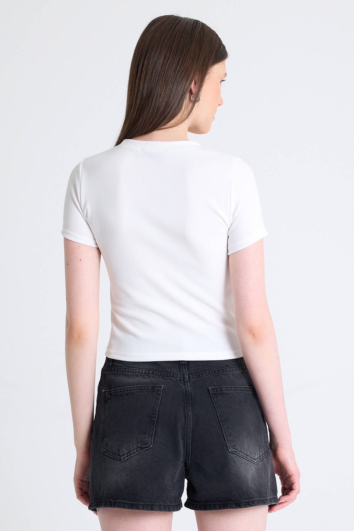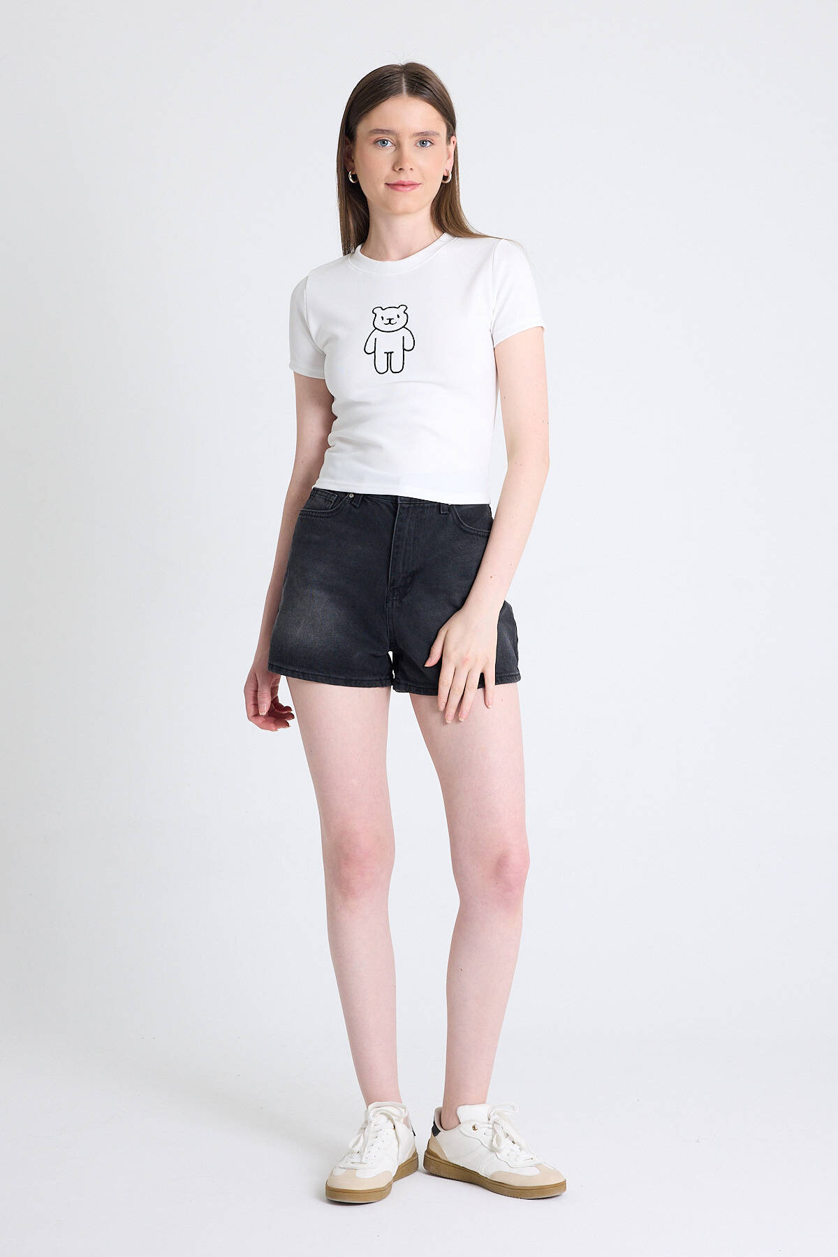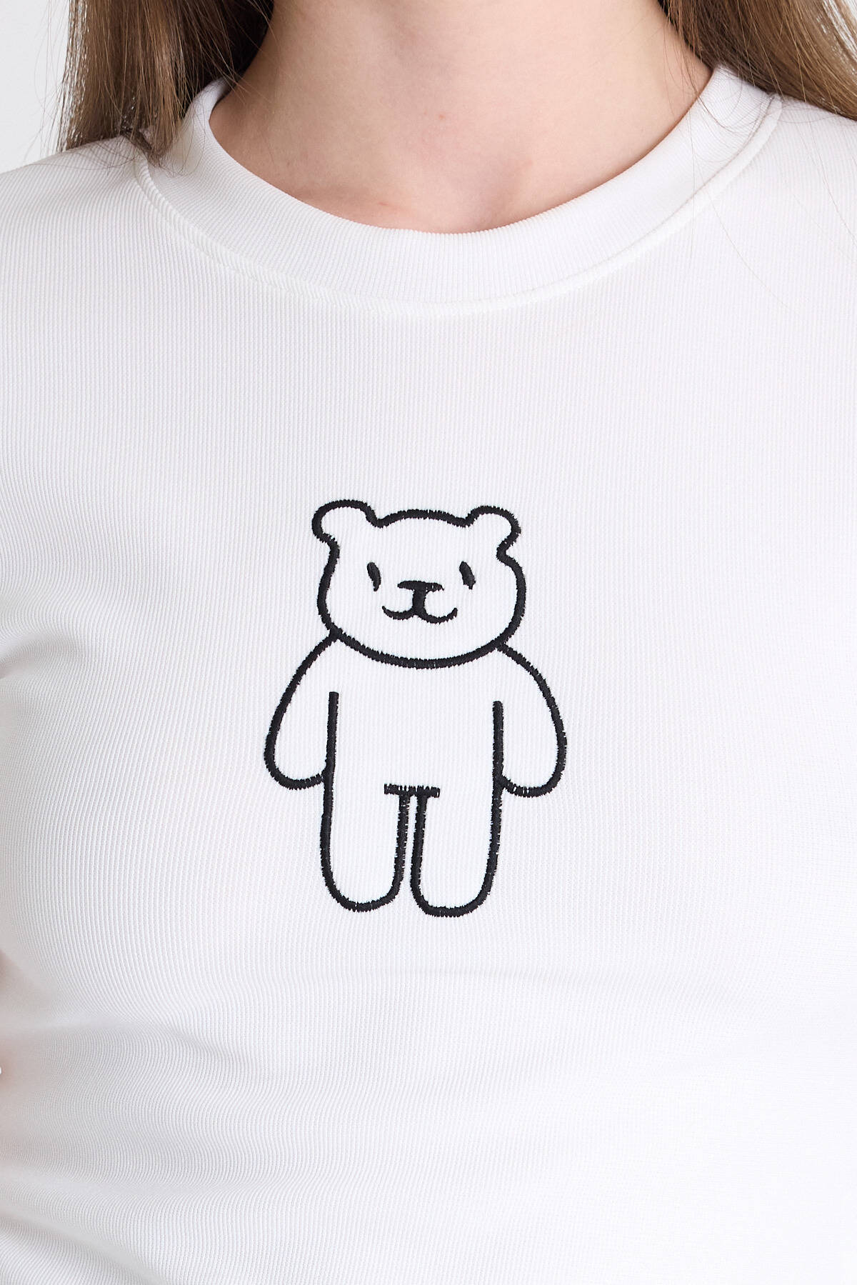 Beyaz Ayıcık İşlemeli Slim Fit Crop Tişört 2217