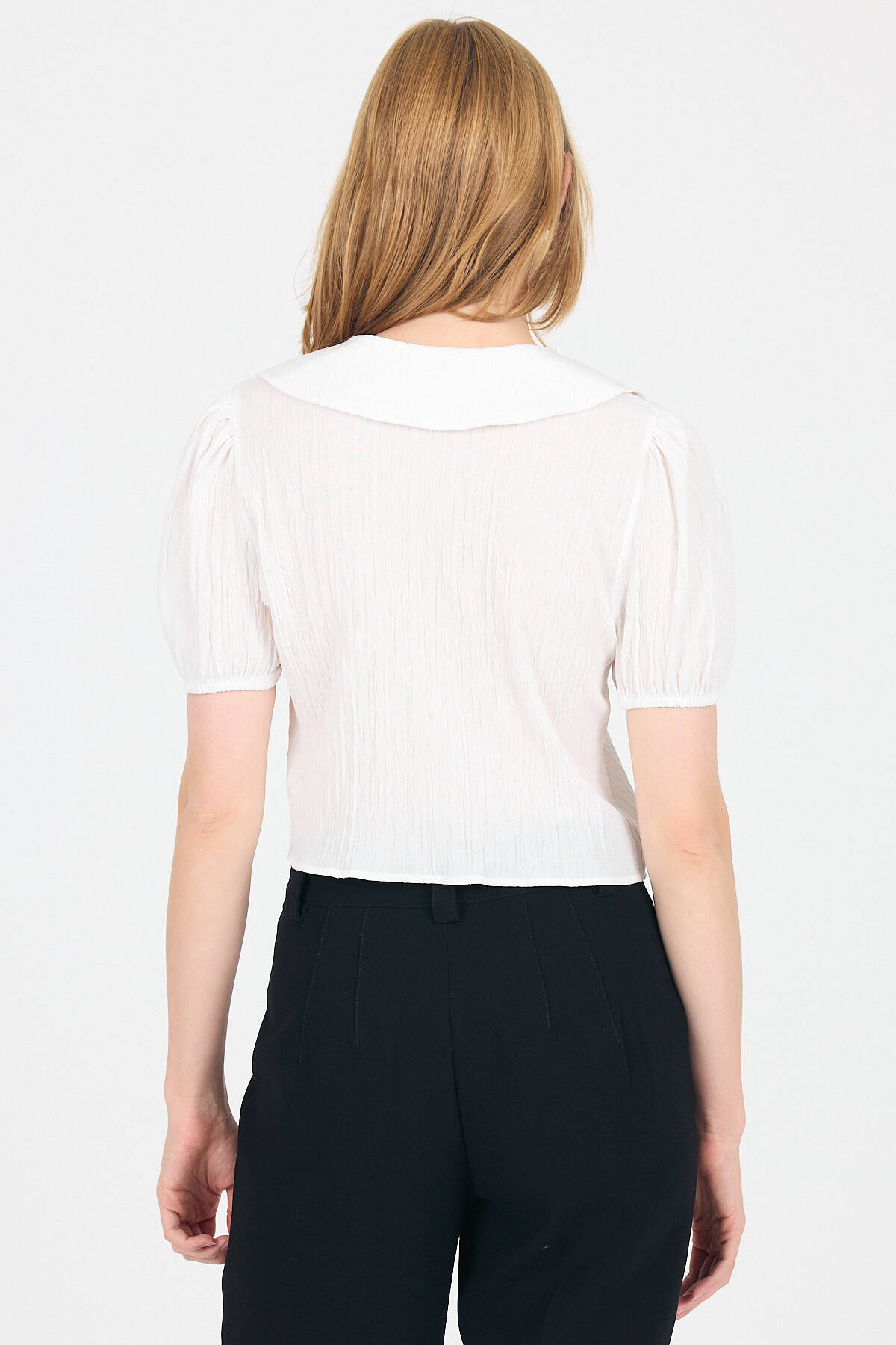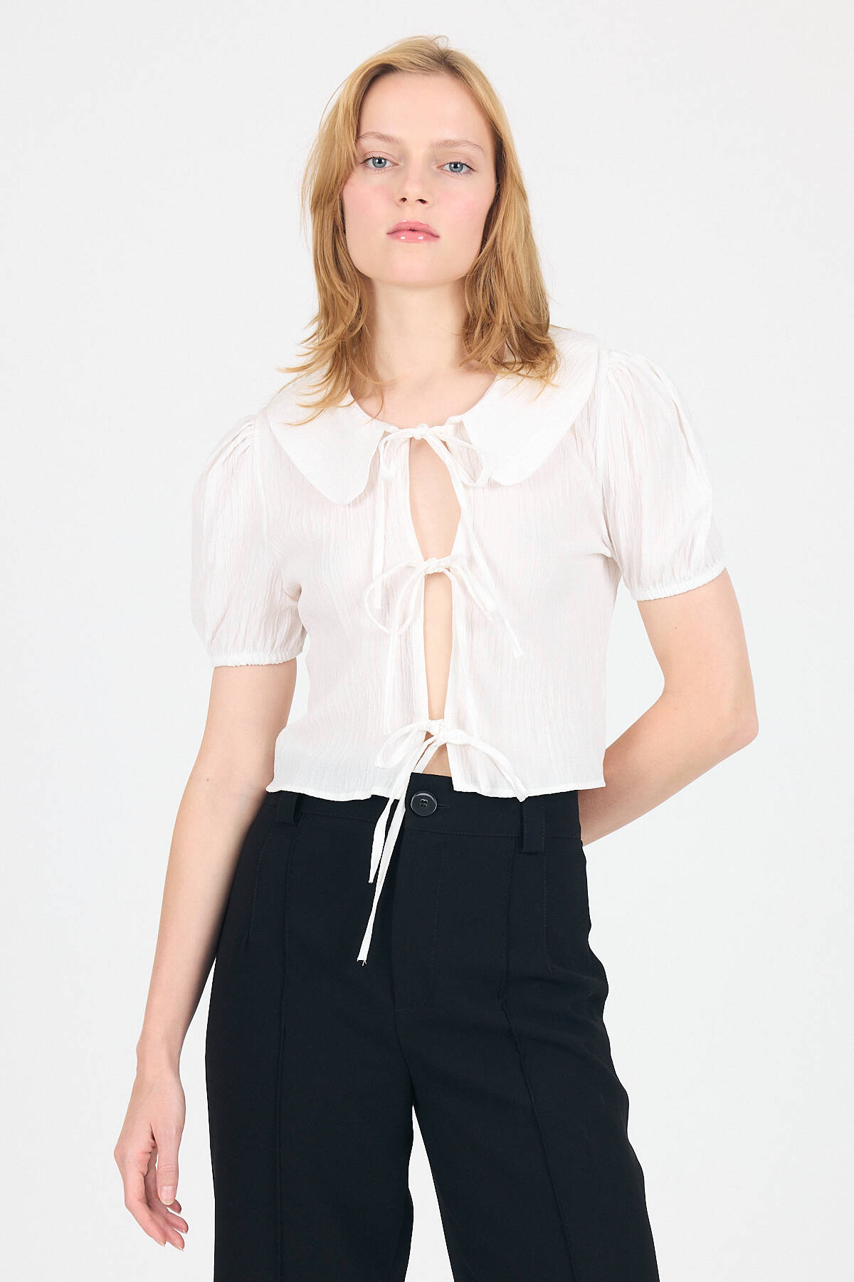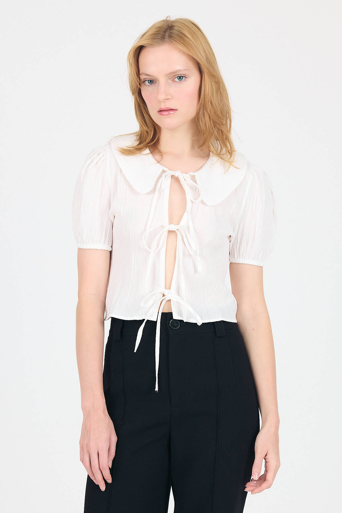 Beyaz Bağlama Detaylı Bebe Yaka Crop Bluz 8064