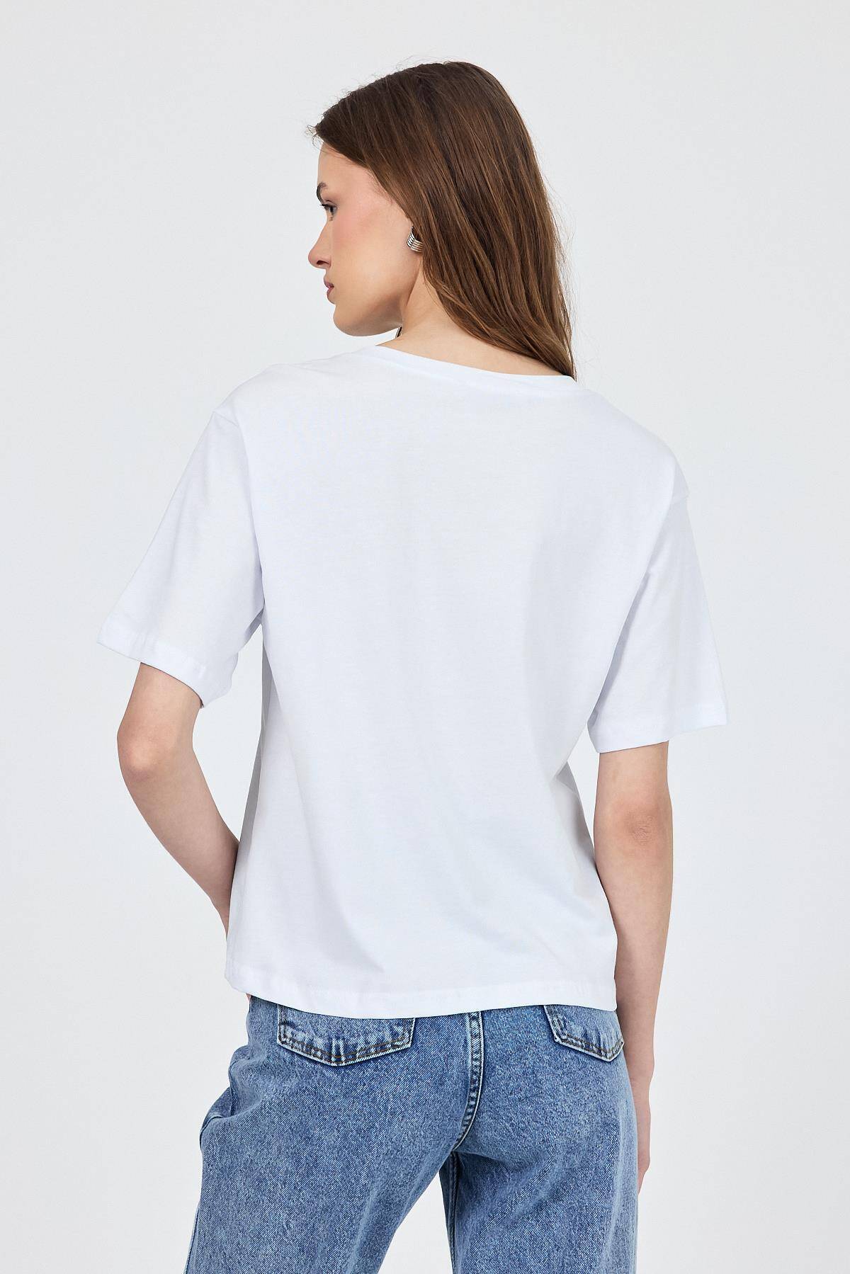 Beyaz Bisiklet Yaka %100 Pamuk Relaxed Fit Tişört 2142M