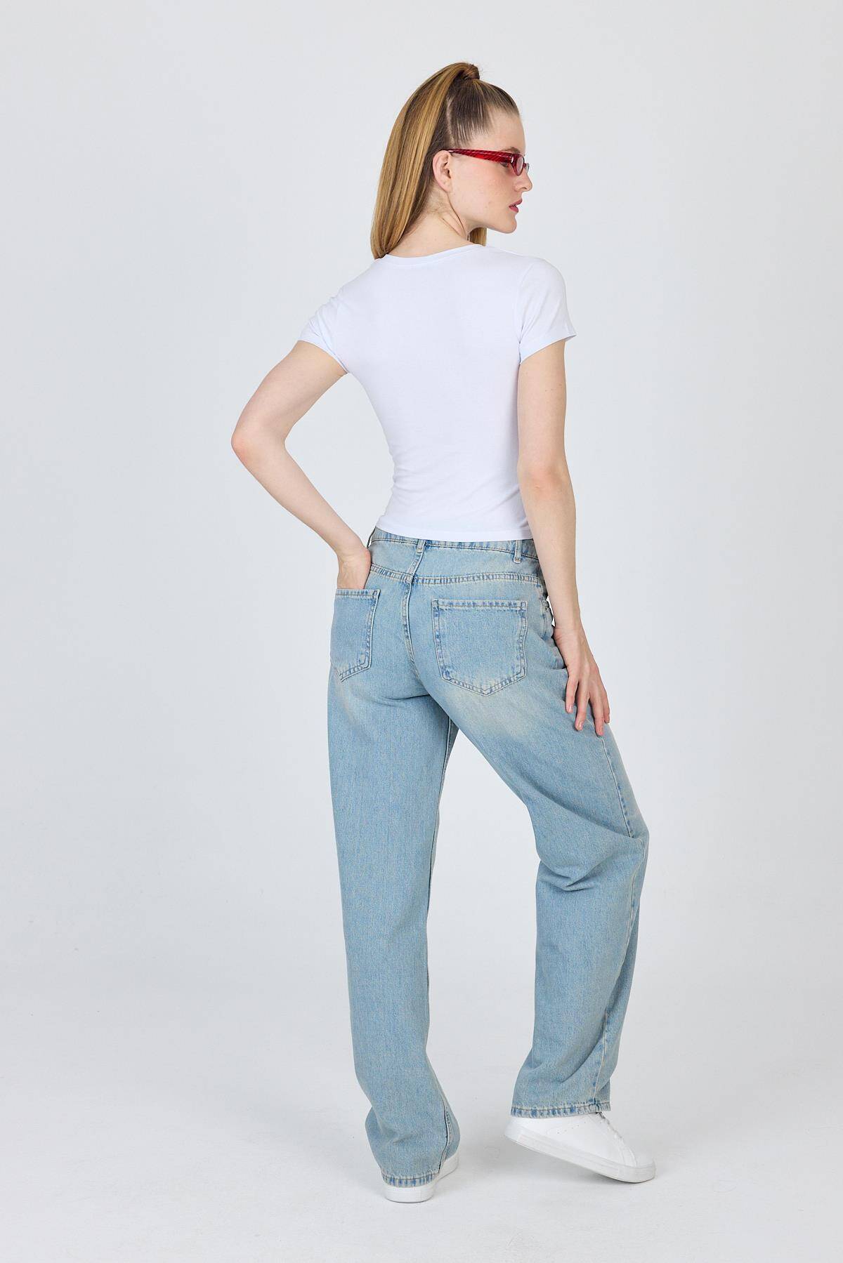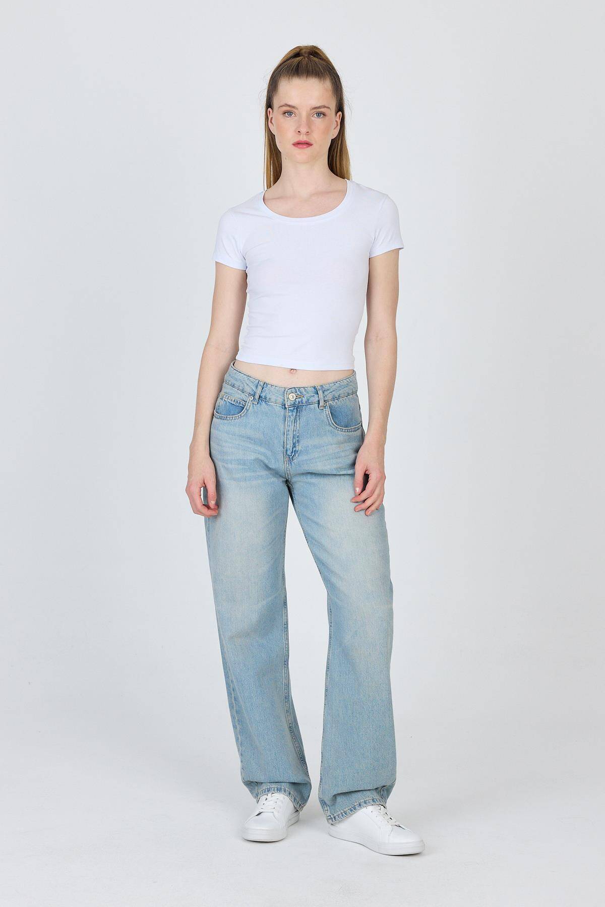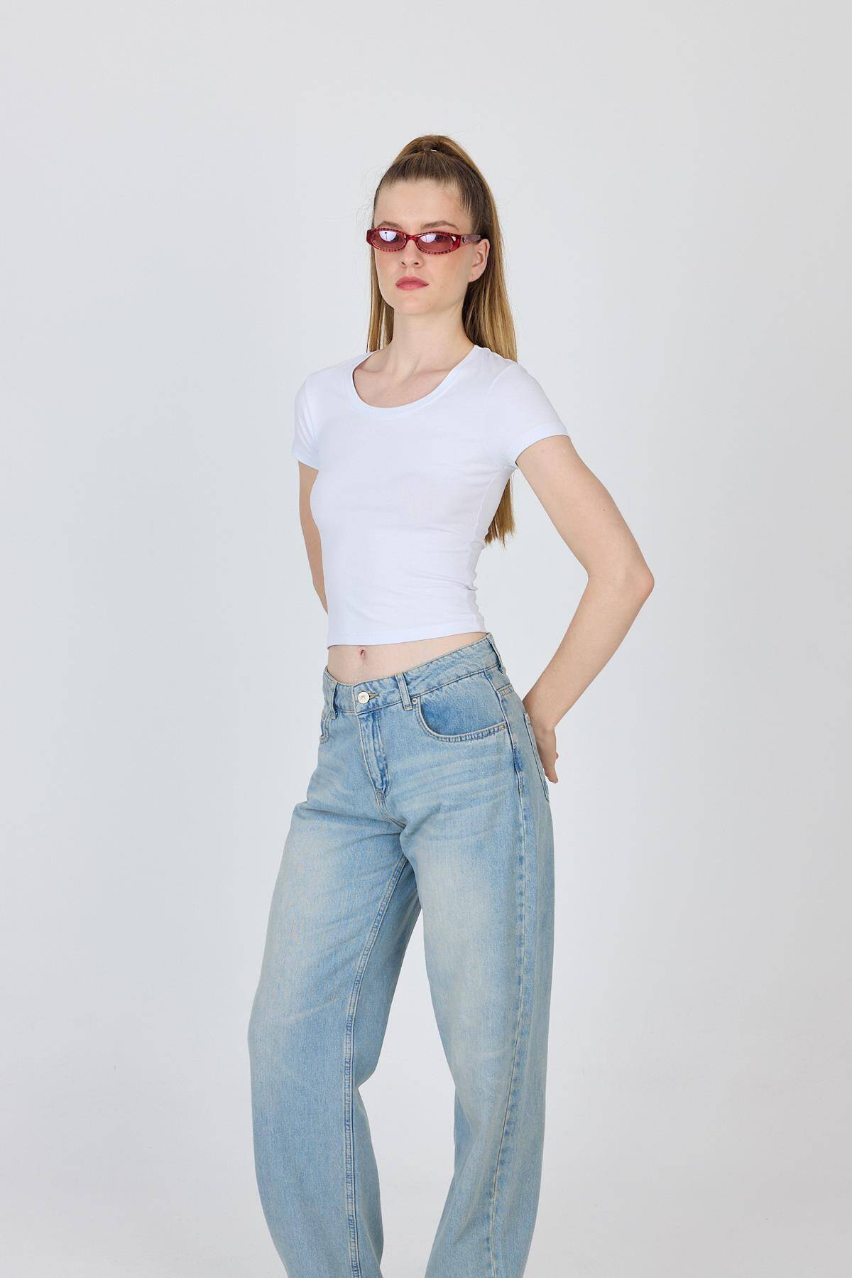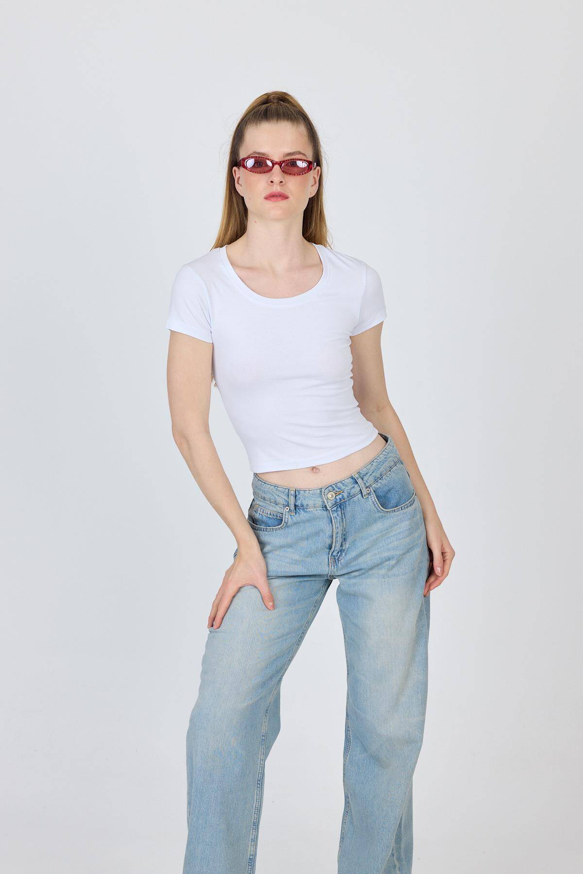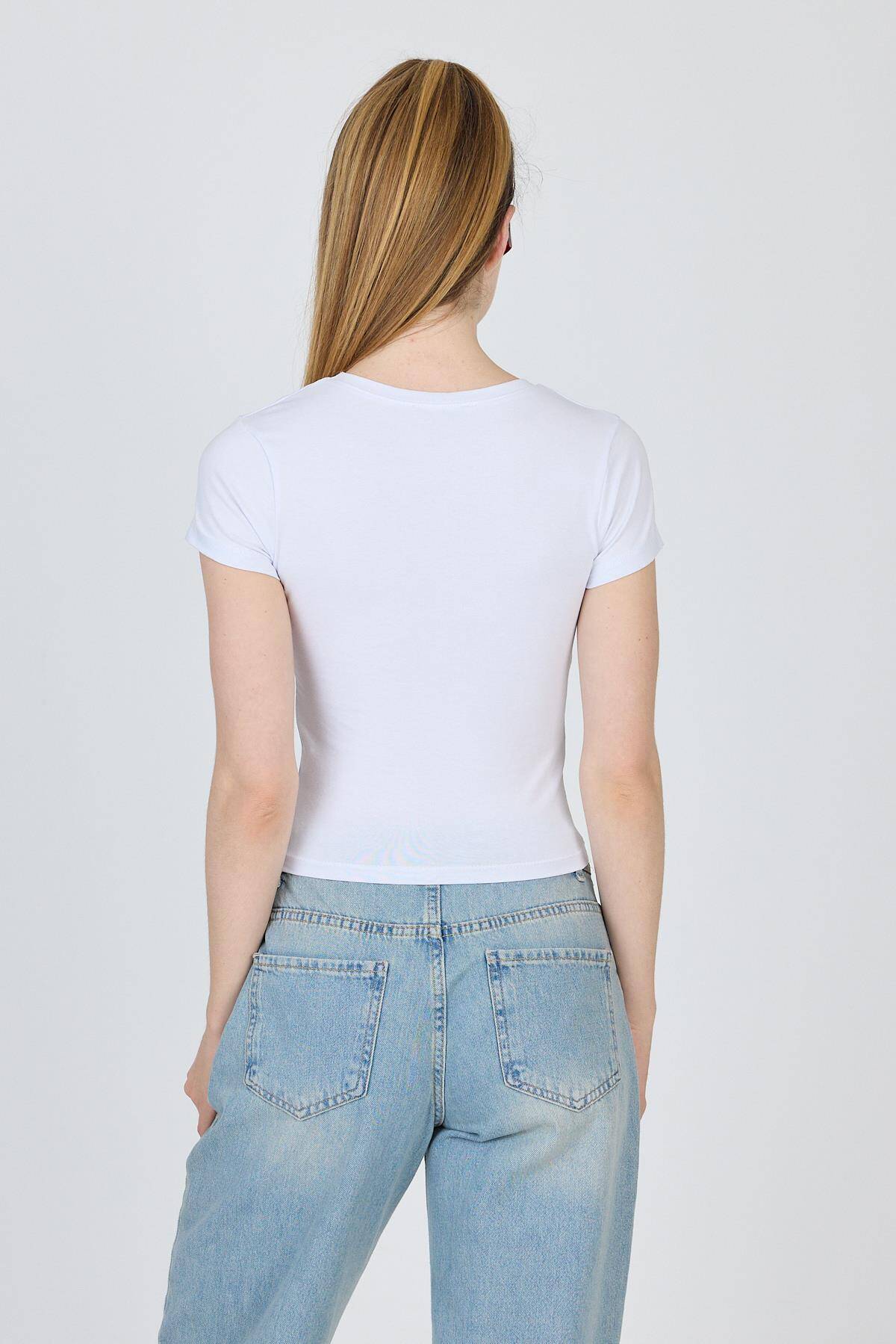 Beyaz Bisiklet Yaka Basic Crop Tişört 9200M