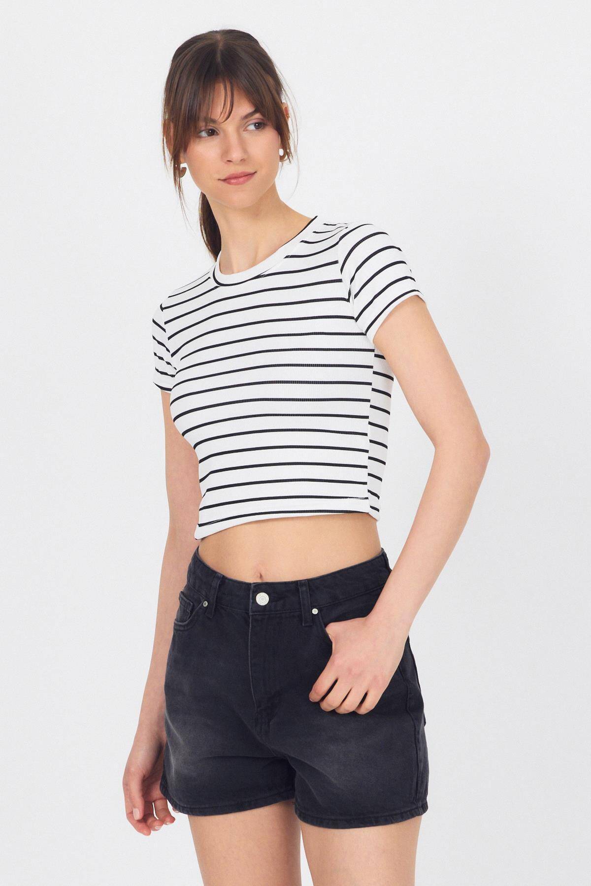 Beyaz Bisiklet Yaka Çizgili Crop Tişört 2147