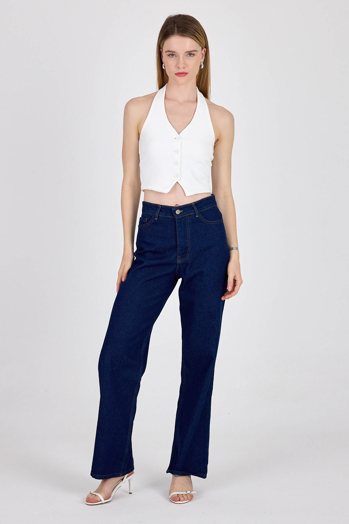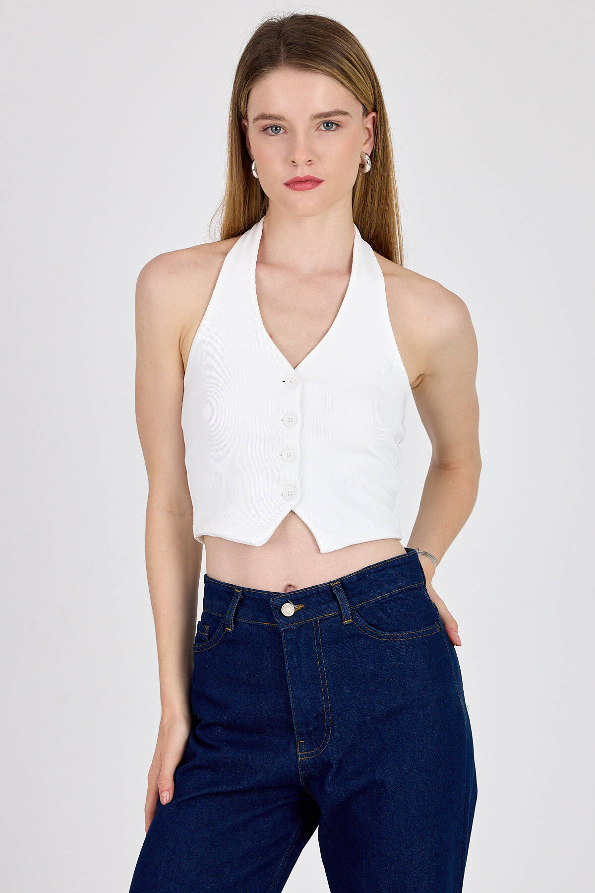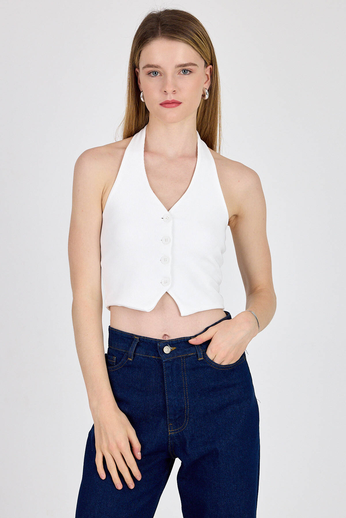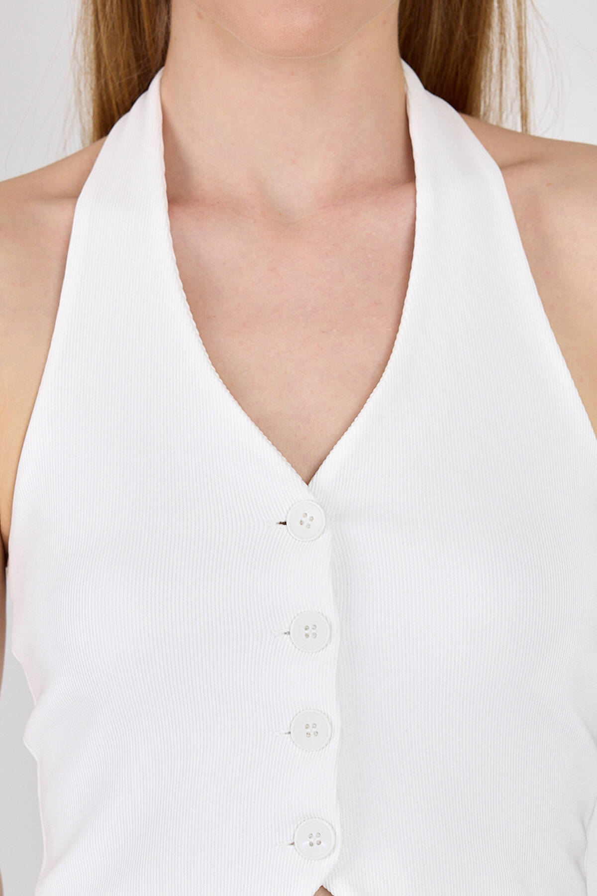 Beyaz Boyundan Geçmeli Düğme Detaylı Yelek 2425