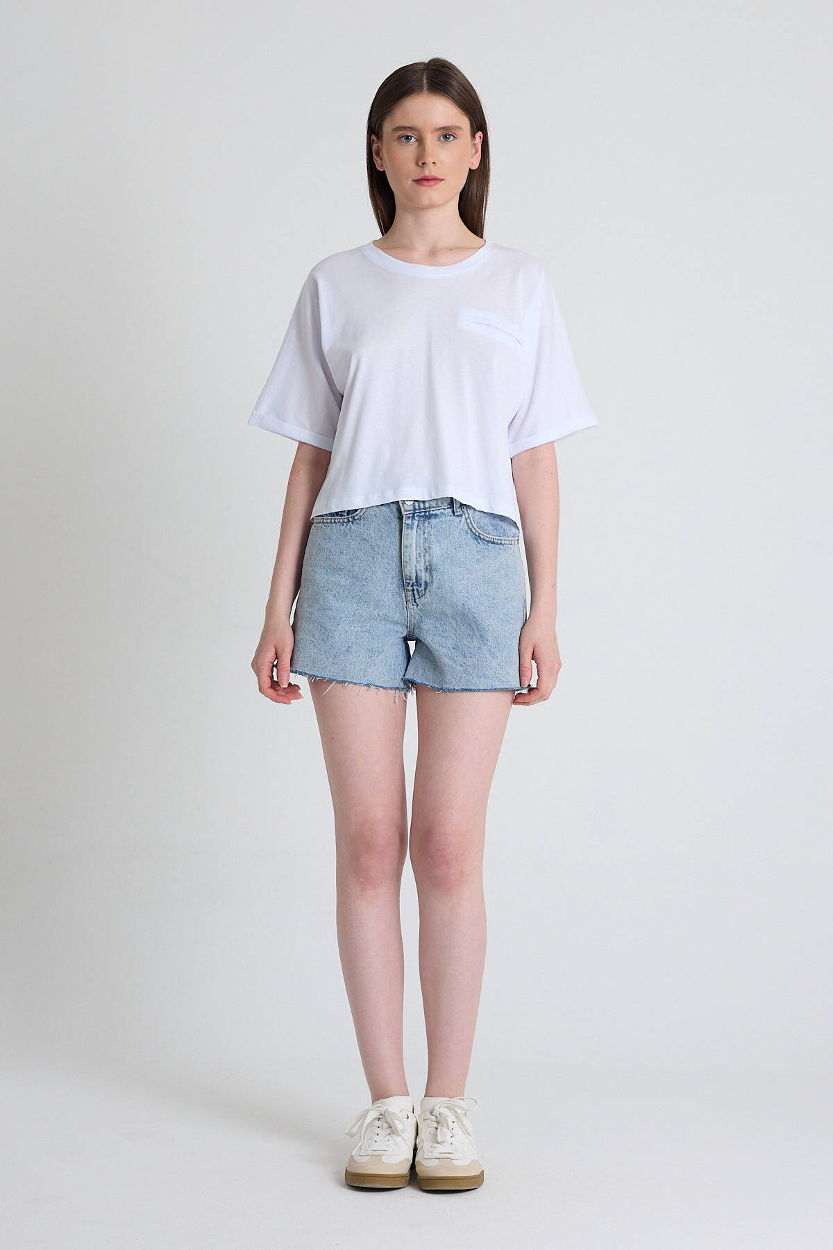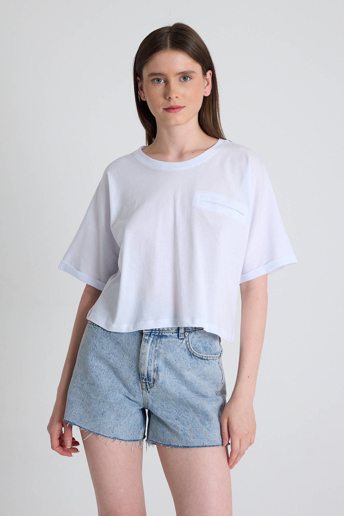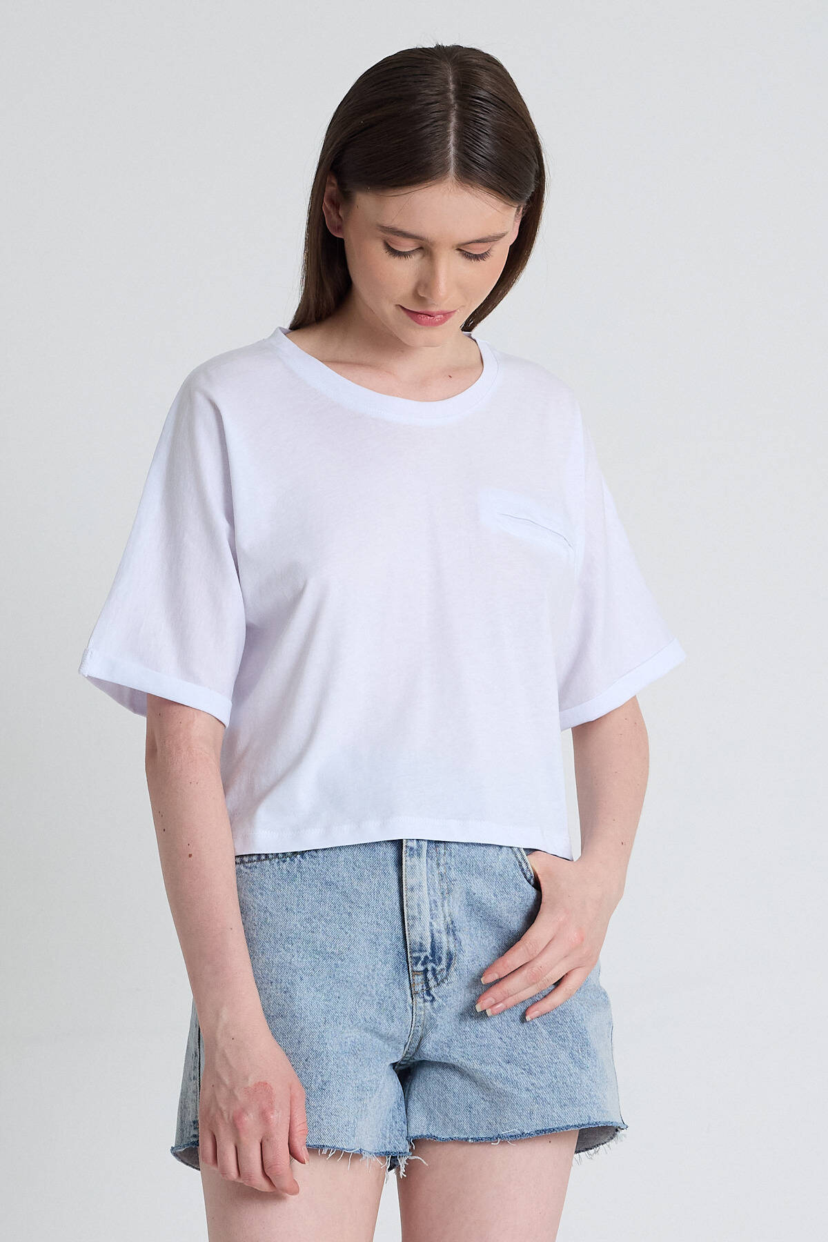 Beyaz Cep Detaylı Bisiklet Yaka Crop Tişört 2136M