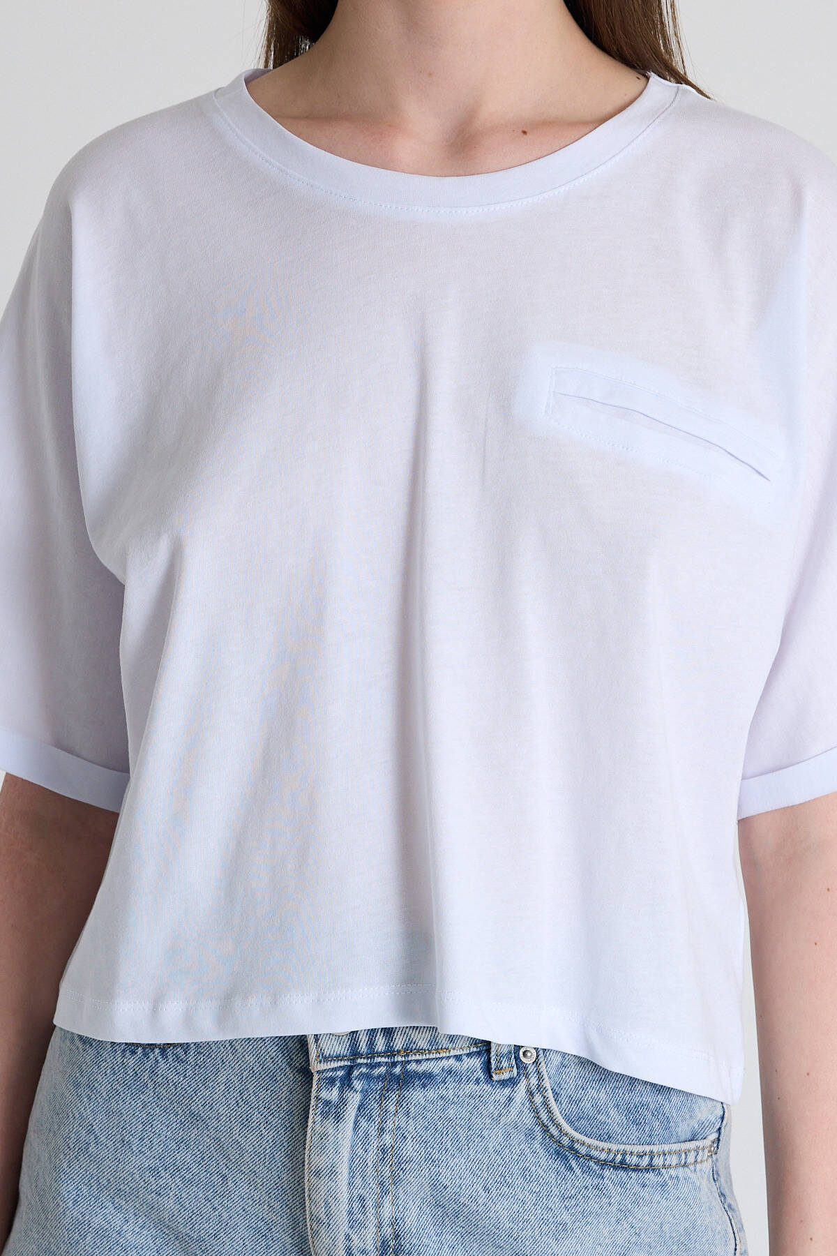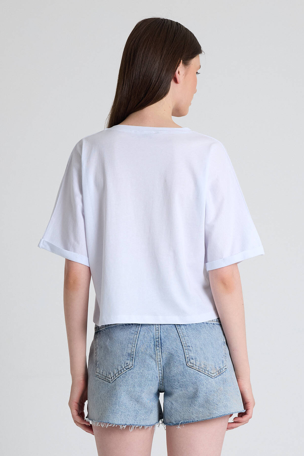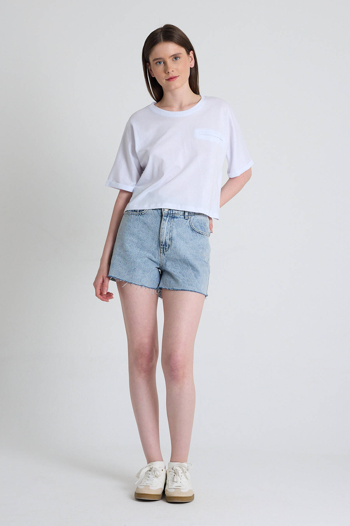 Beyaz Cep Detaylı Bisiklet Yaka Crop Tişört 2136M