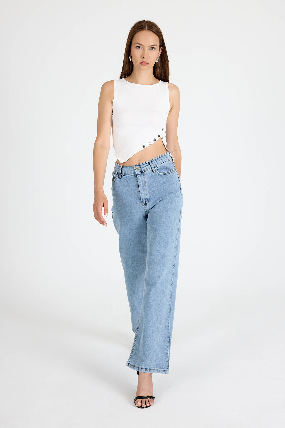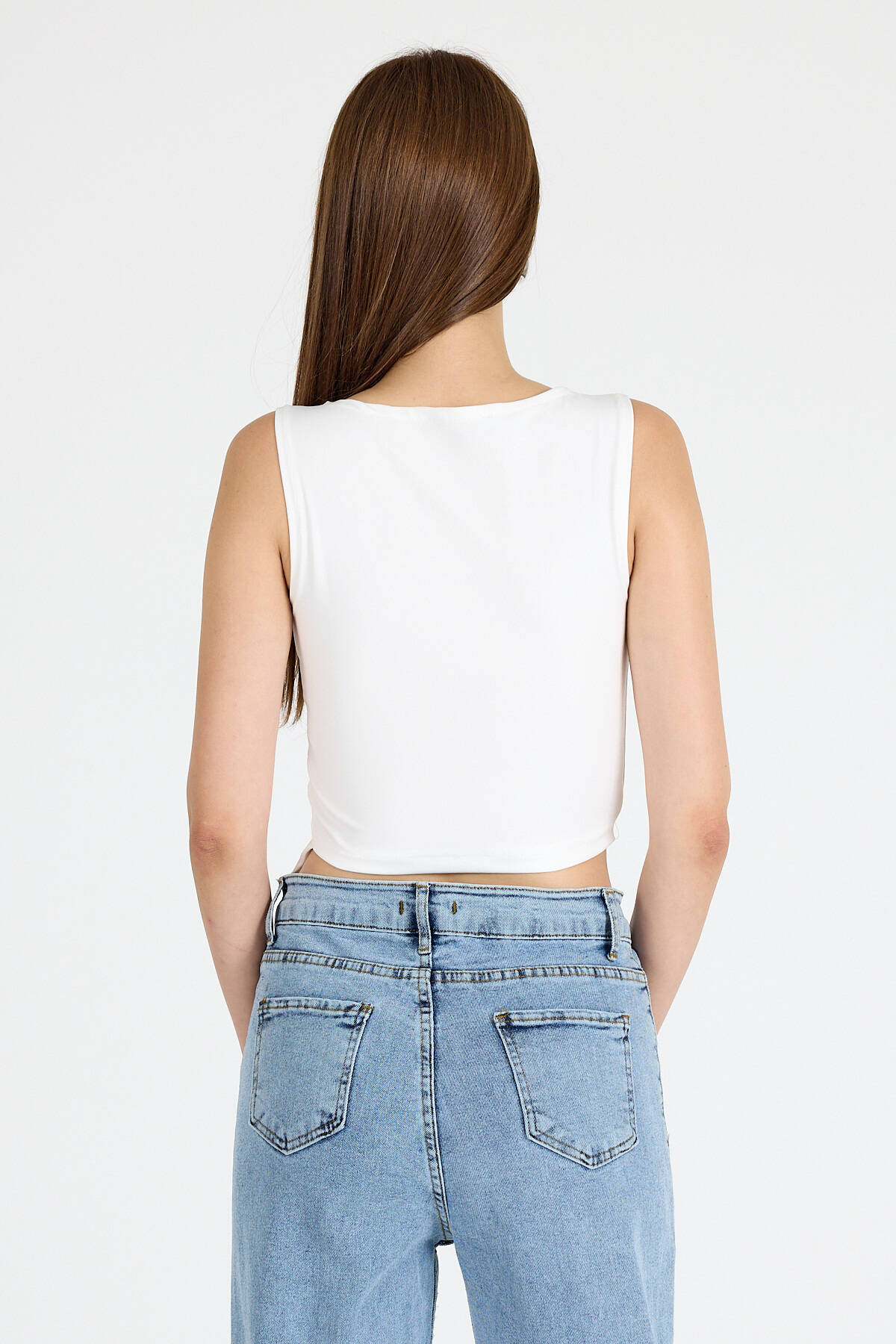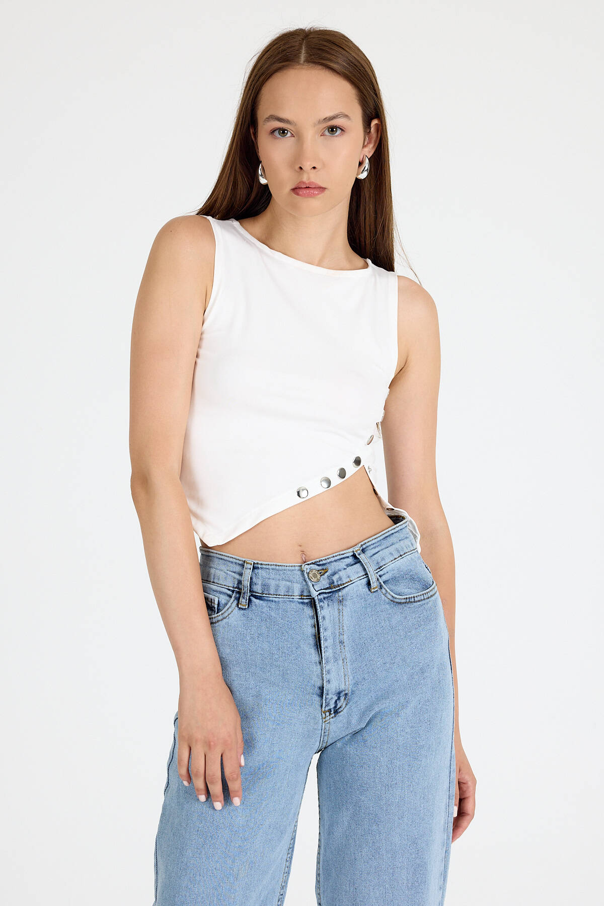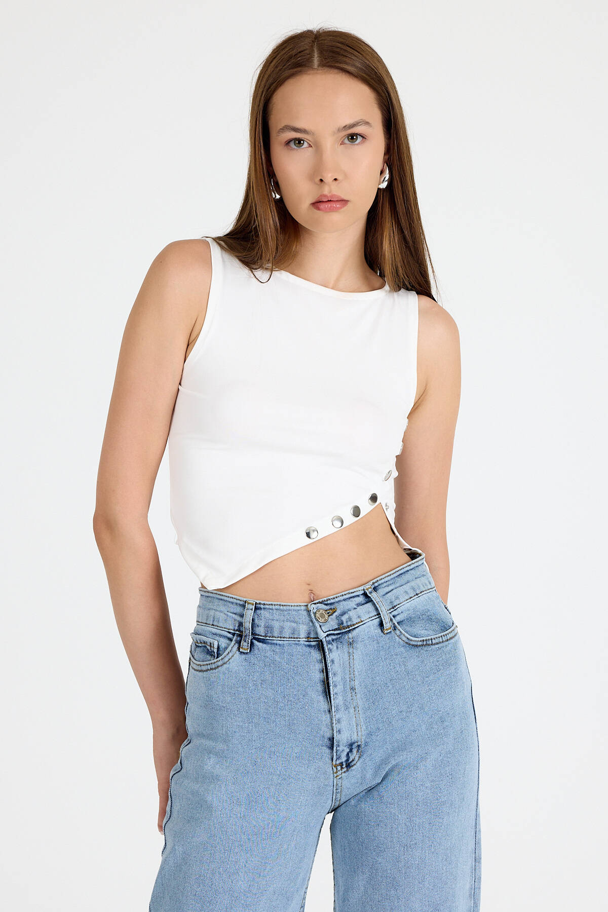 Beyaz Çıt Detaylı Asimetrik Kesim Kolsuz Bluz 2494