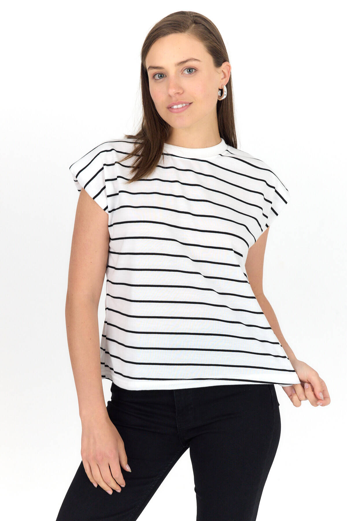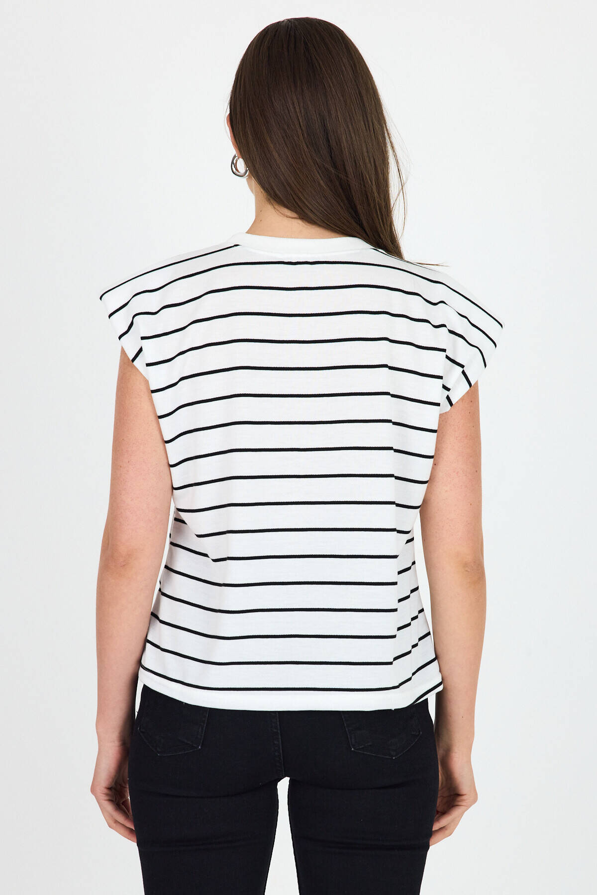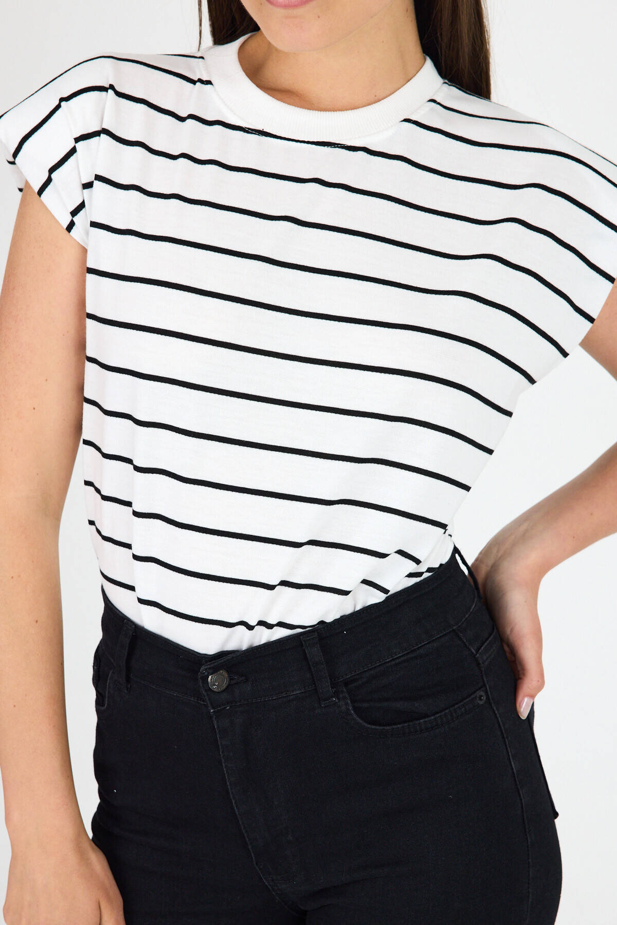Beyaz Çizgili Bisiklet Yaka Vatkalı Pamuklu Tişört 1761