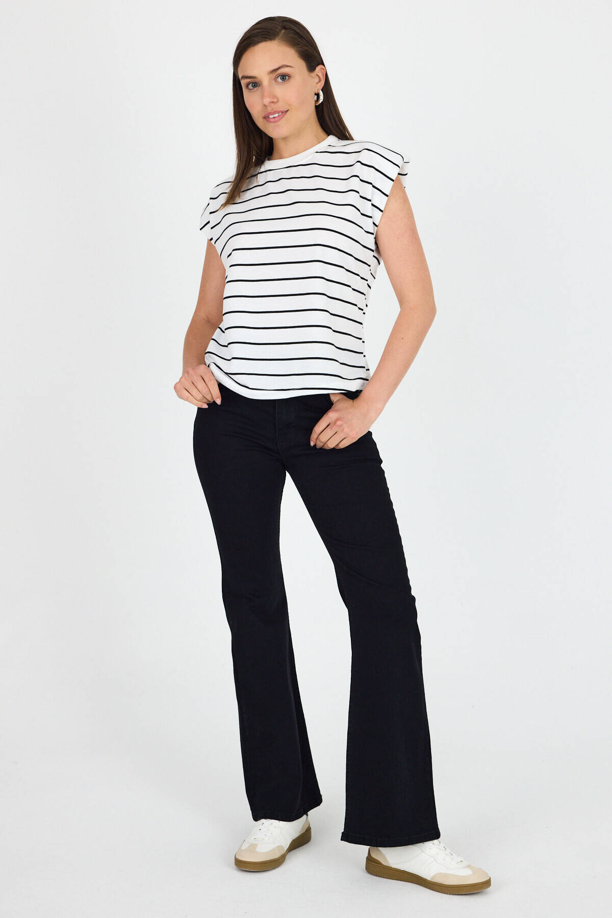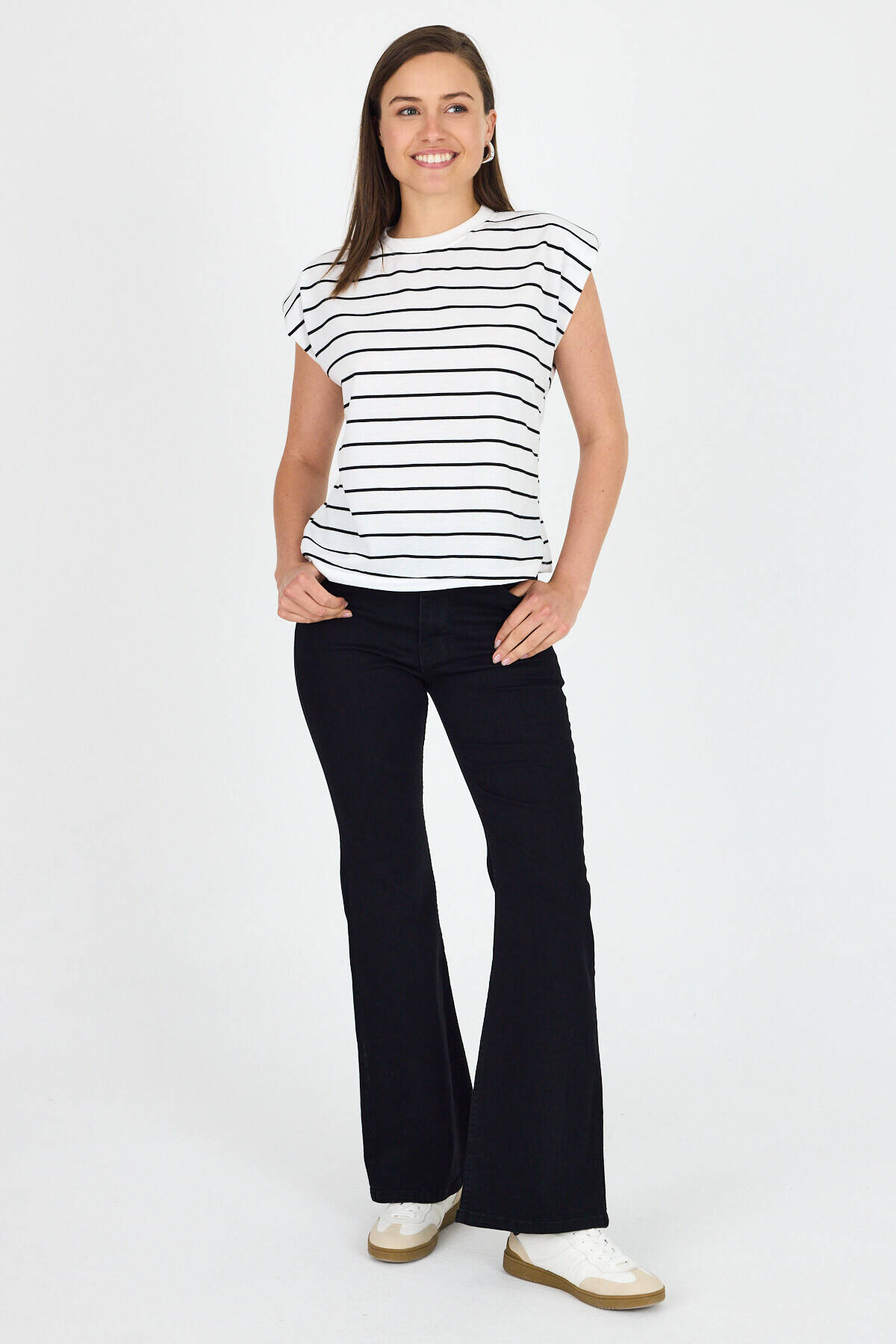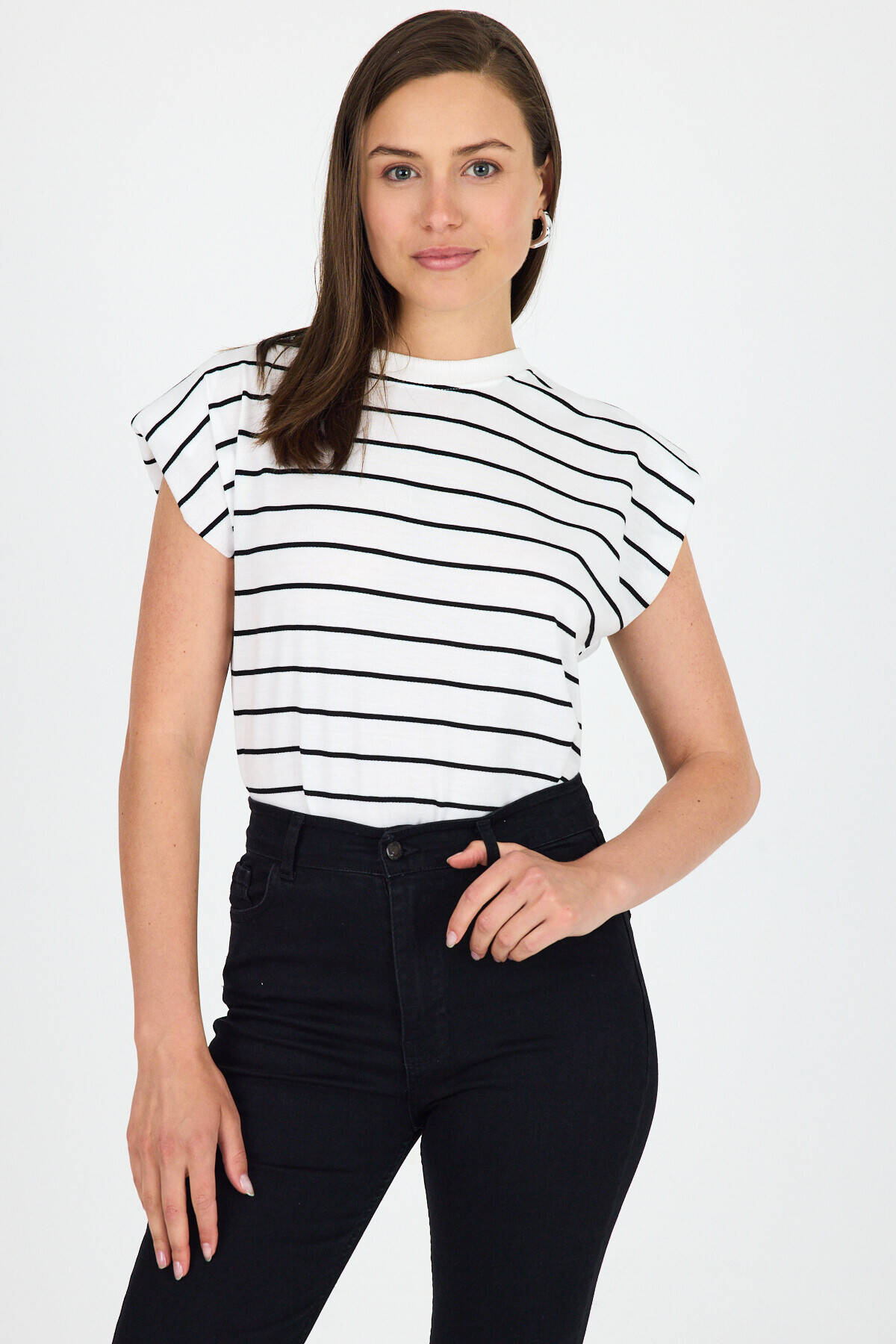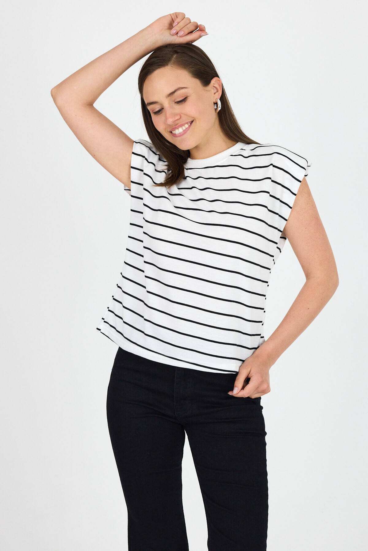 Beyaz Çizgili Bisiklet Yaka Vatkalı Pamuklu Tişört 1761
