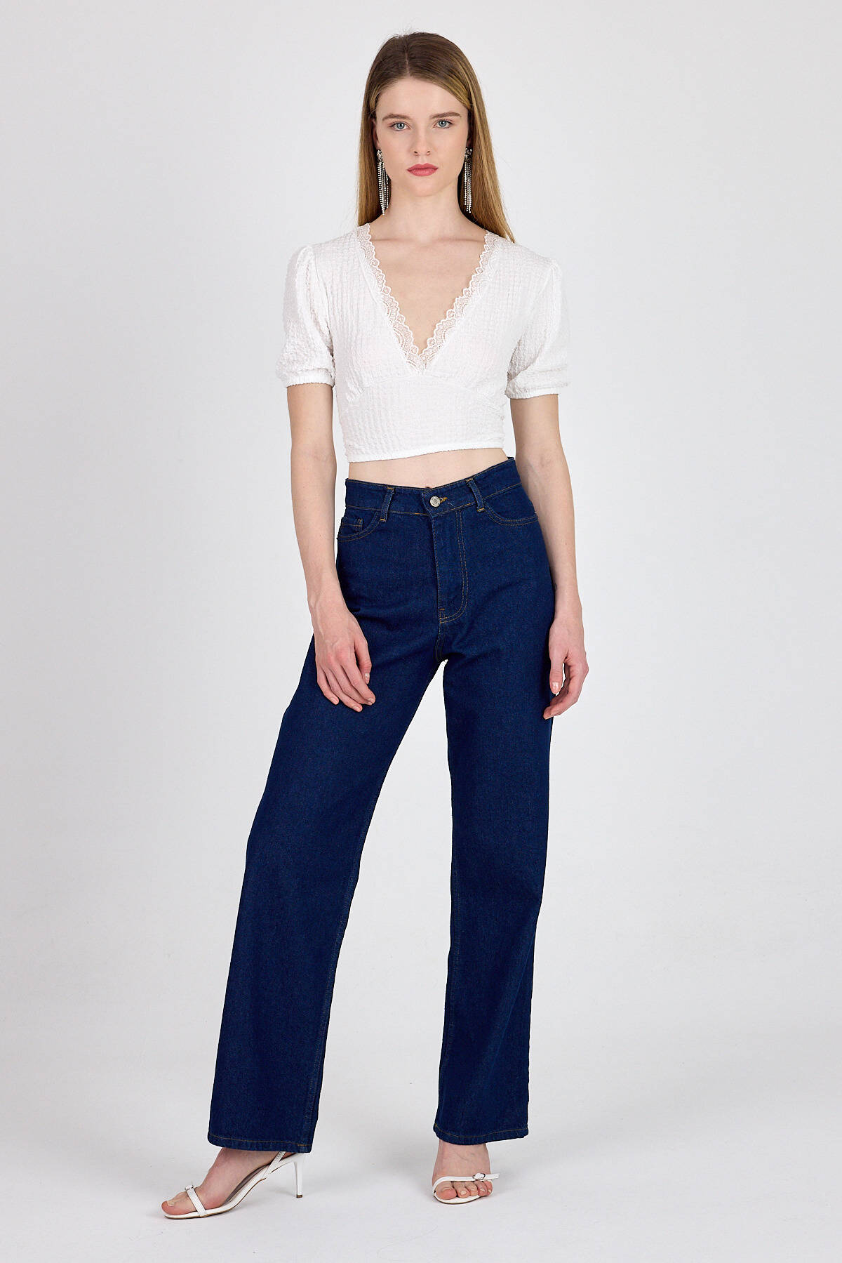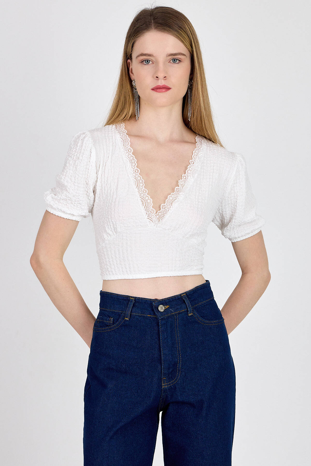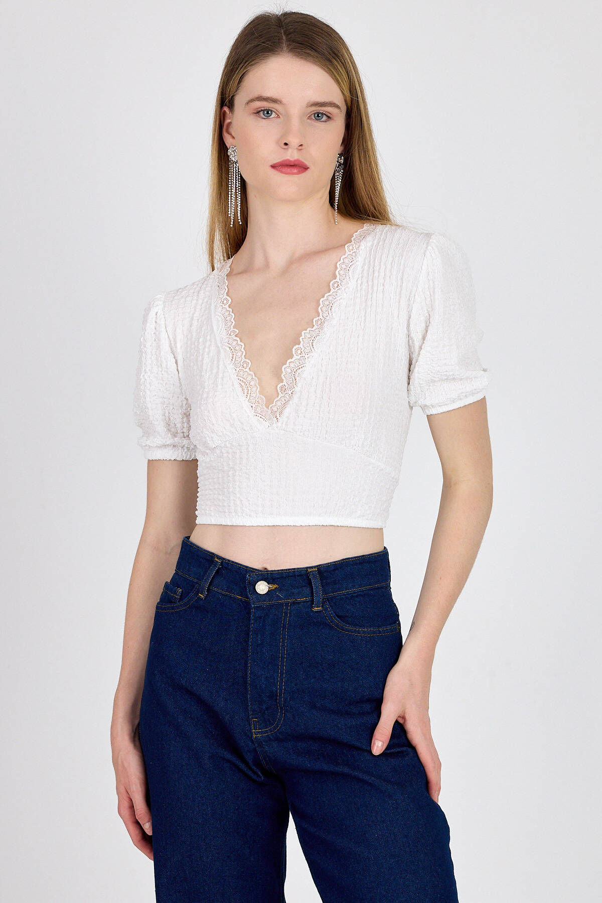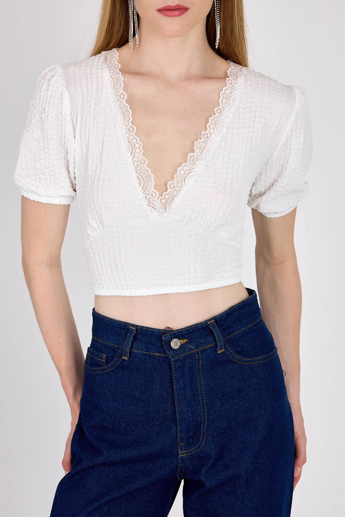 Beyaz Dantel Detaylı Bürümcük Kumaş Crop Bluz 2231