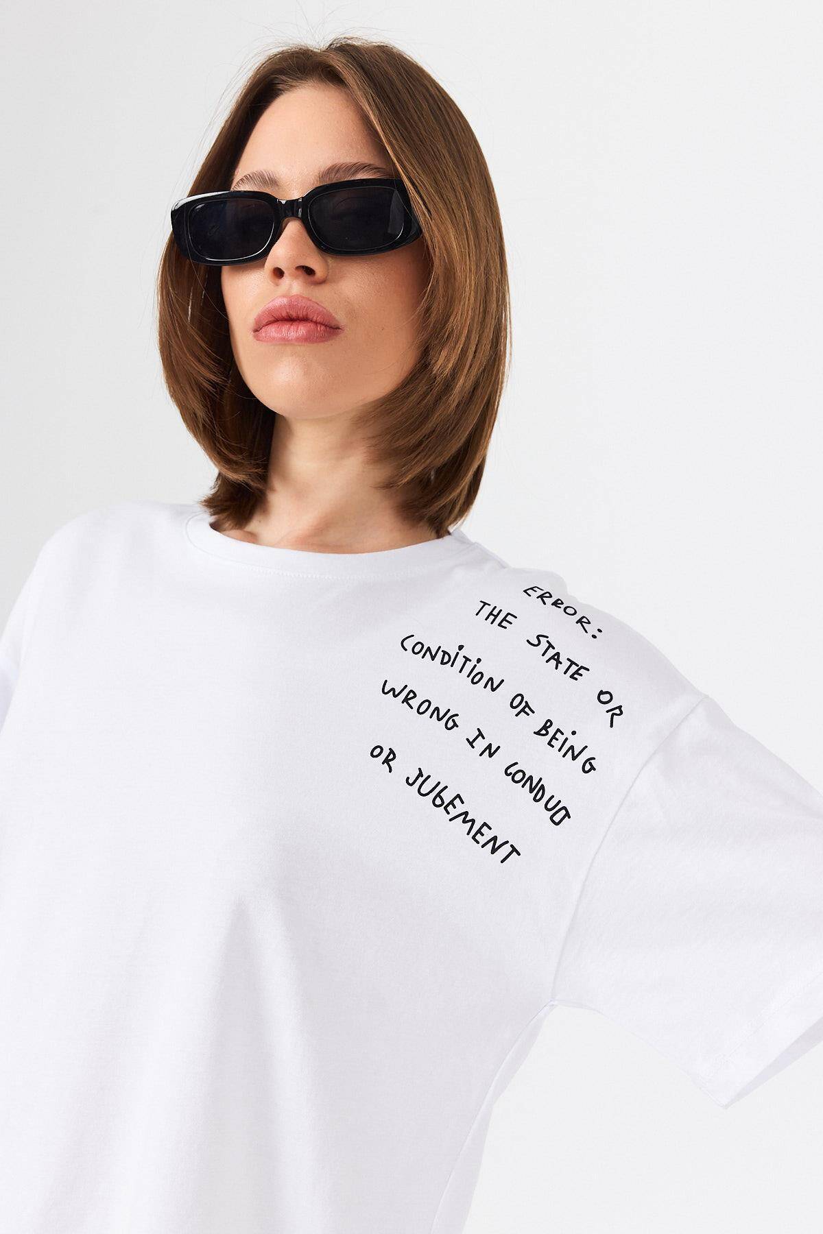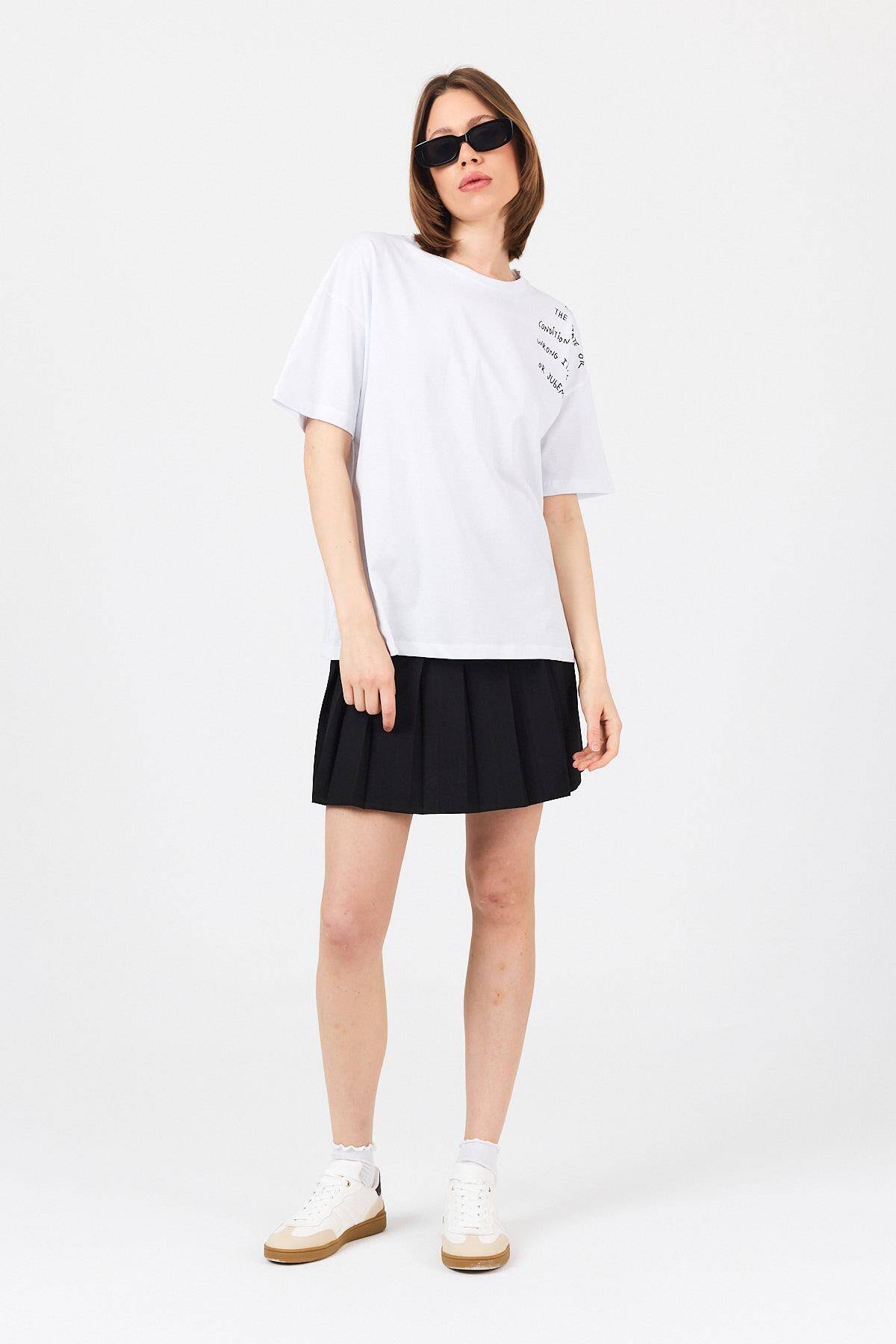 Beyaz Göğüs Yazı Baskılı Pamuklu Oversize Tişört 2150-31M