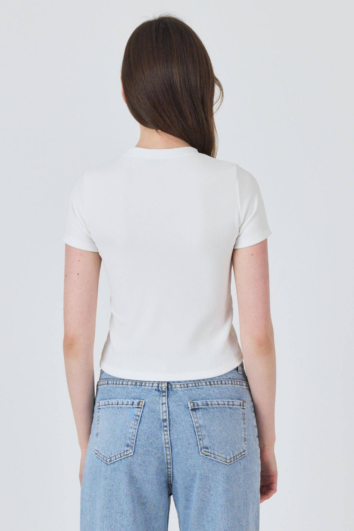 Beyaz İnci Kurdele İşlemeli Crop Slim Fit Tişört 2229