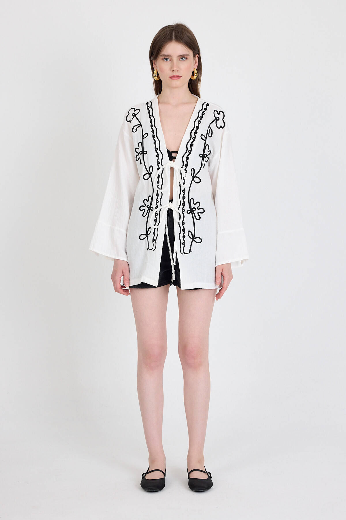 Beyaz Keten Görümümlü %100 Pamuk İşlemeli Kimono 4811A