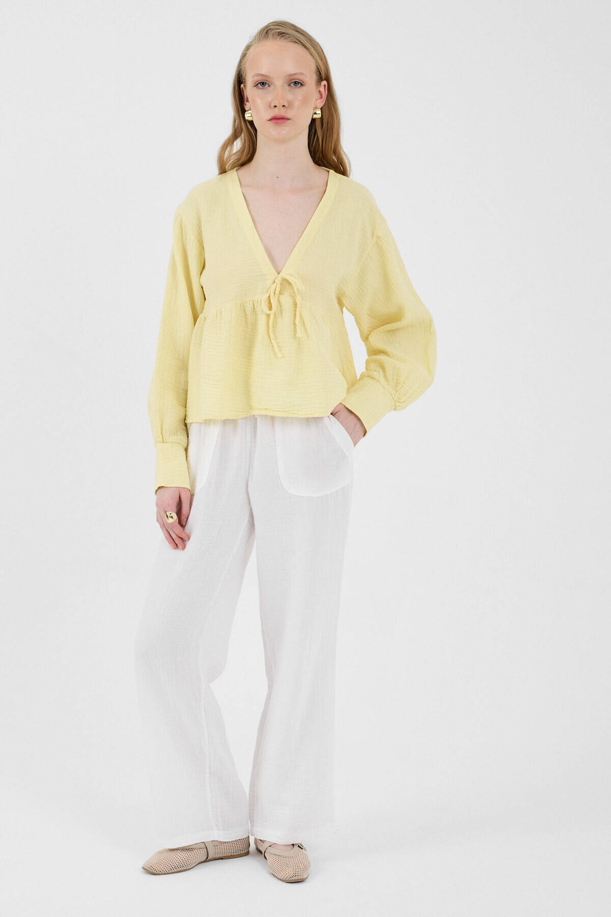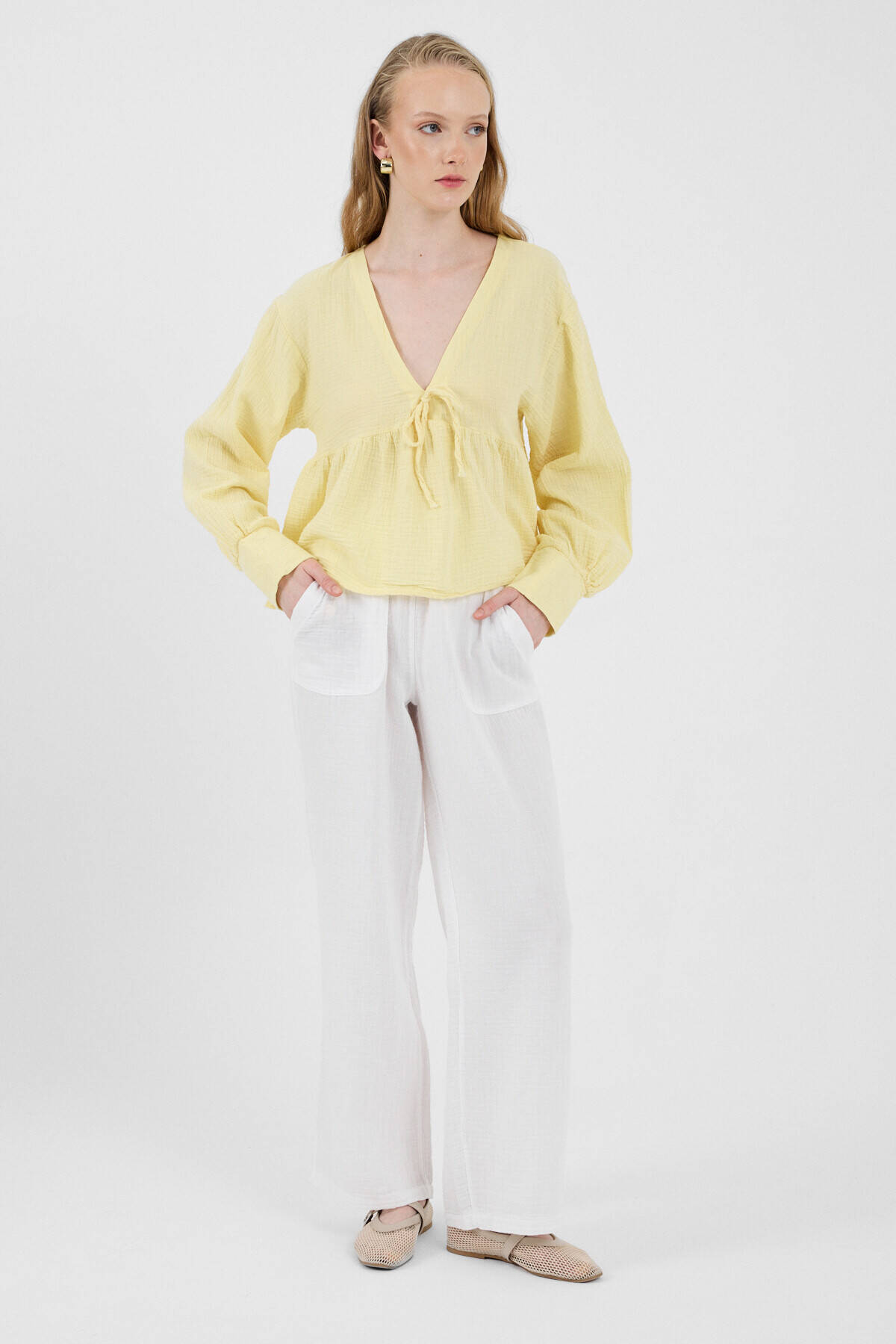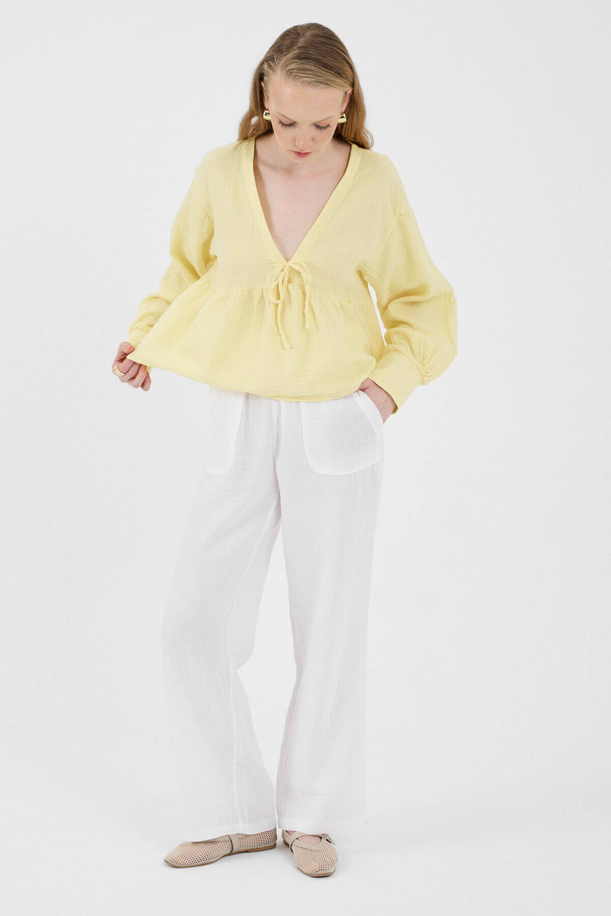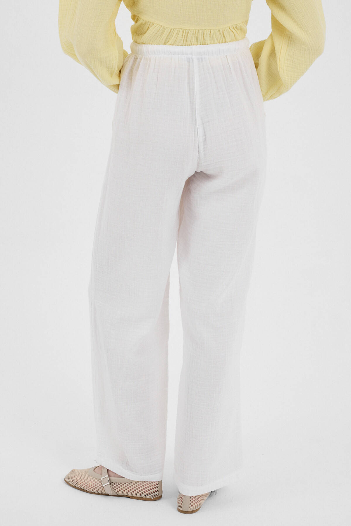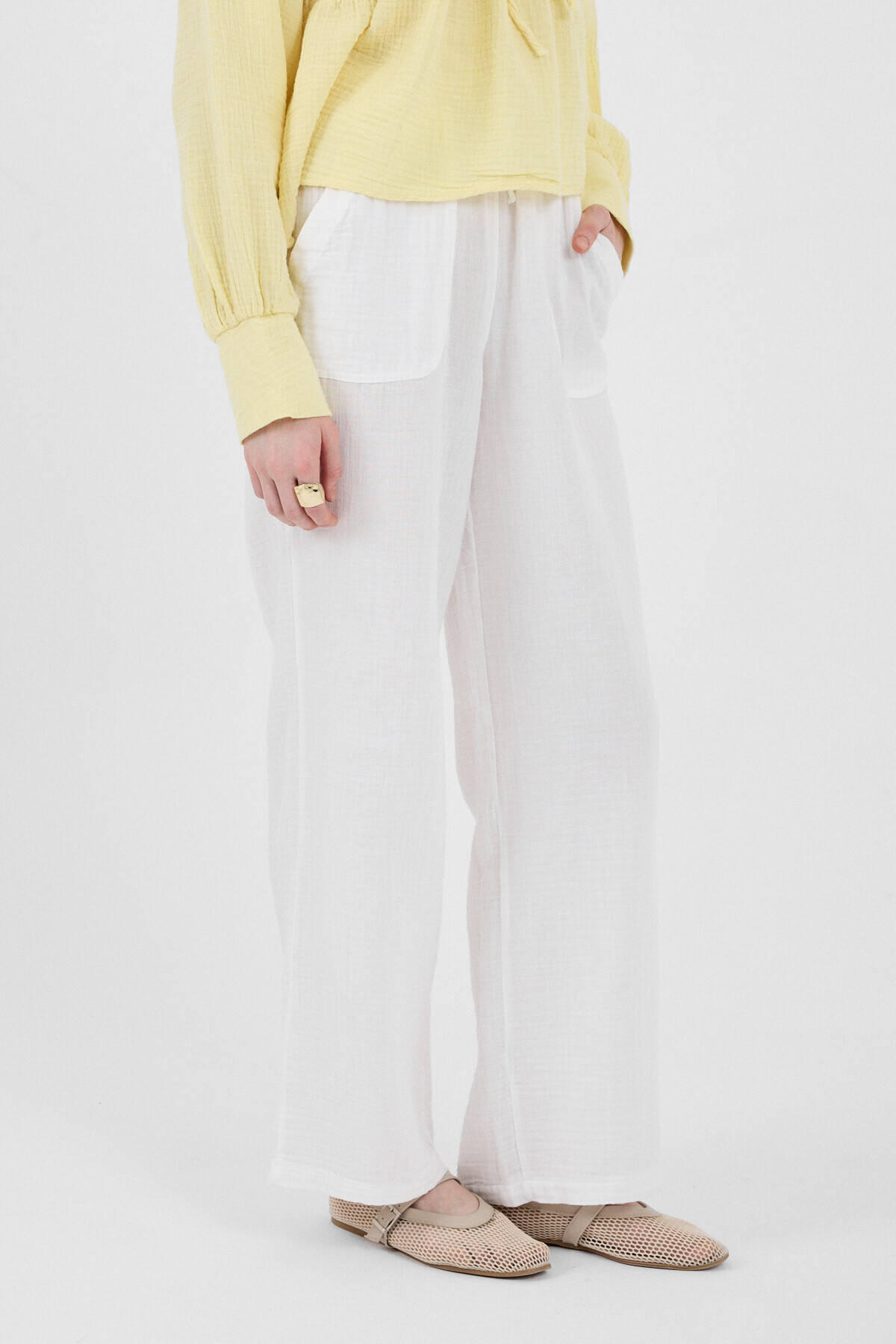 Beyaz Keten Görünümlü %100 Pamuk Cepli Bol Paça Pantolon 8054A