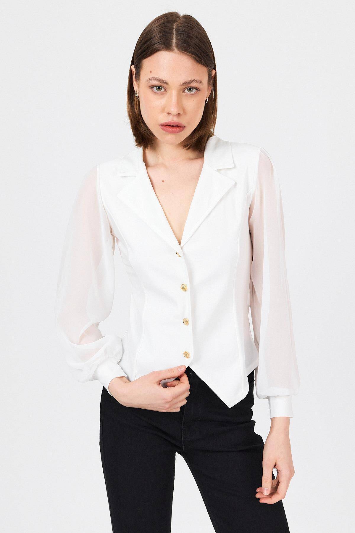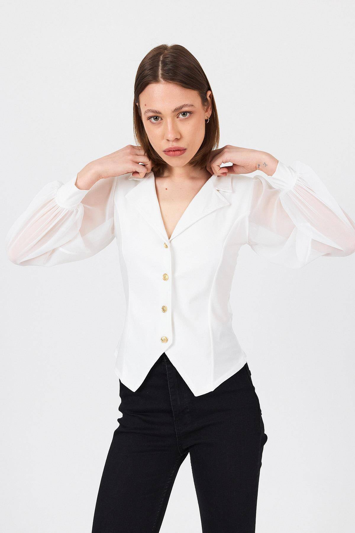 Beyaz Kruvaze Yaka Düğmeli Pensli Gömlek 9476