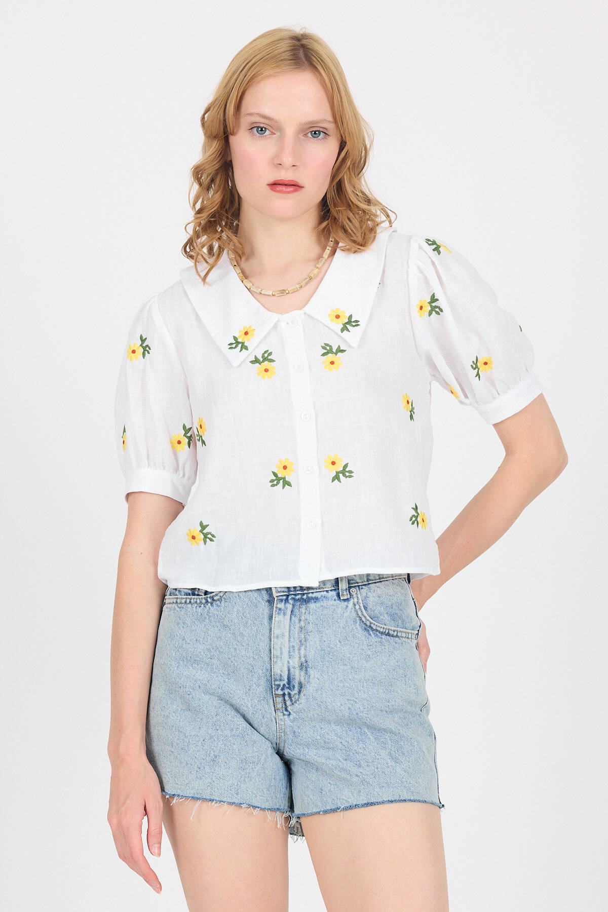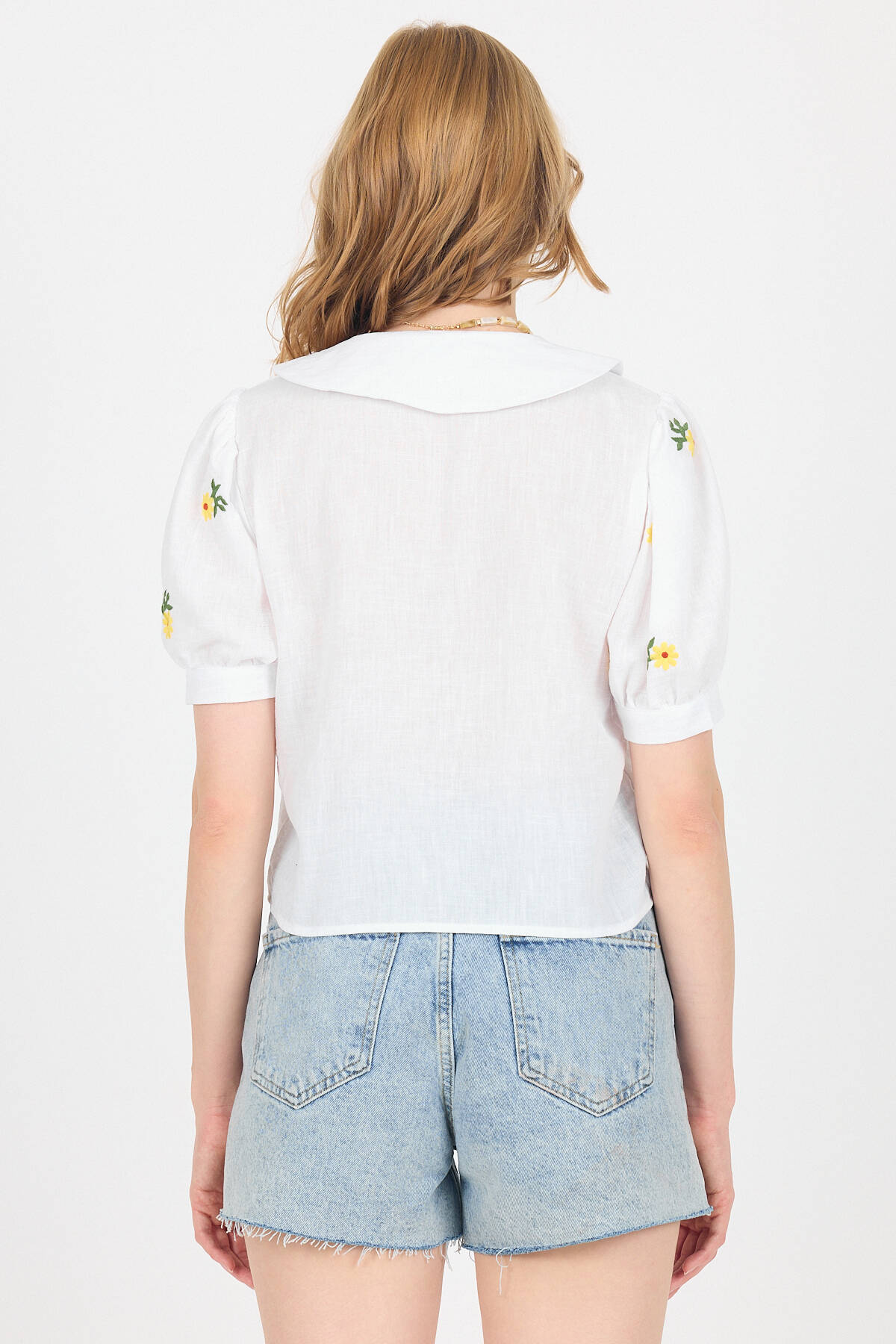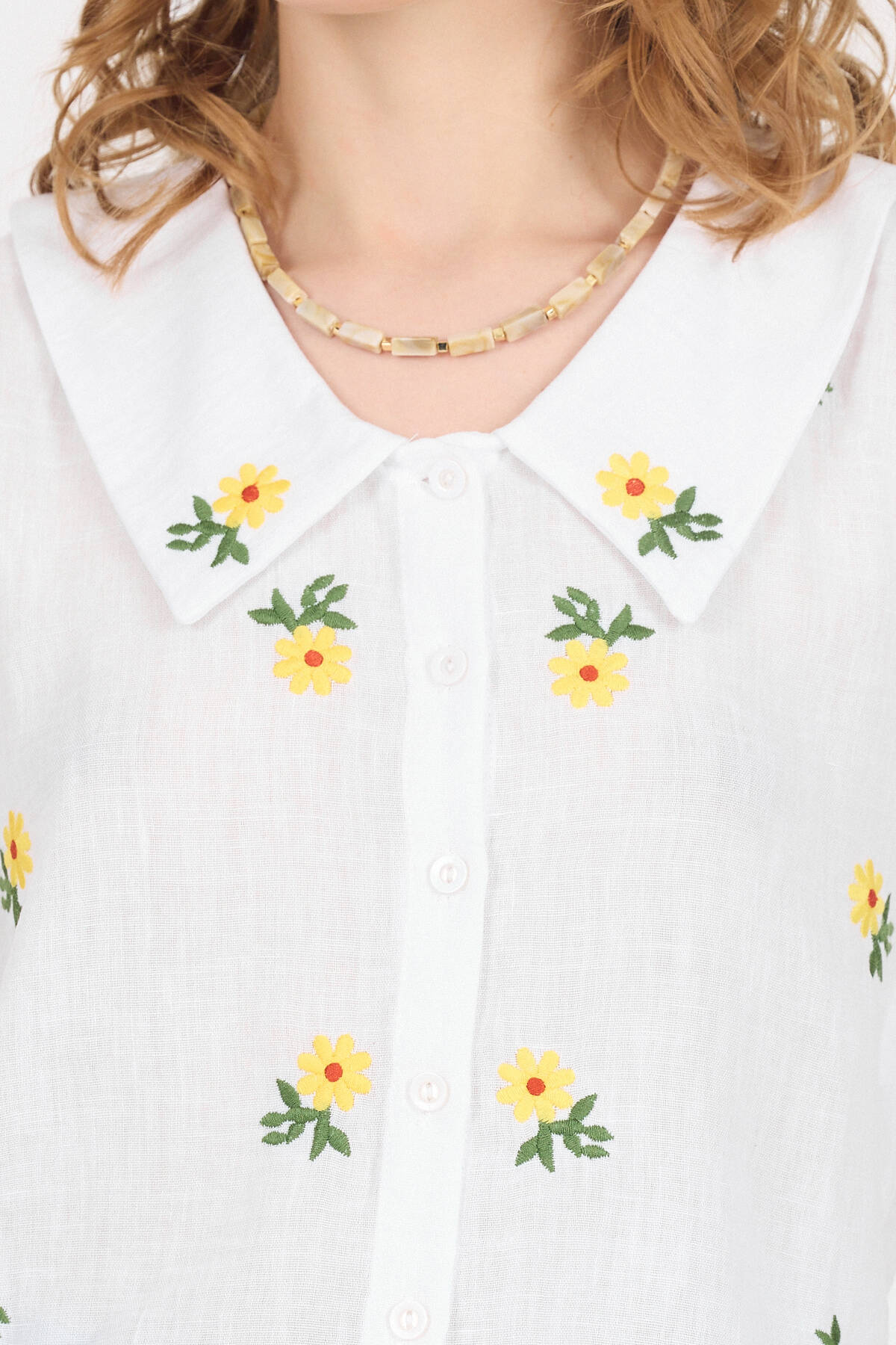 Beyaz Papatya İşlemeli Bebe Yaka %100 Pamuk Müslin Gömlek Bluz 0391