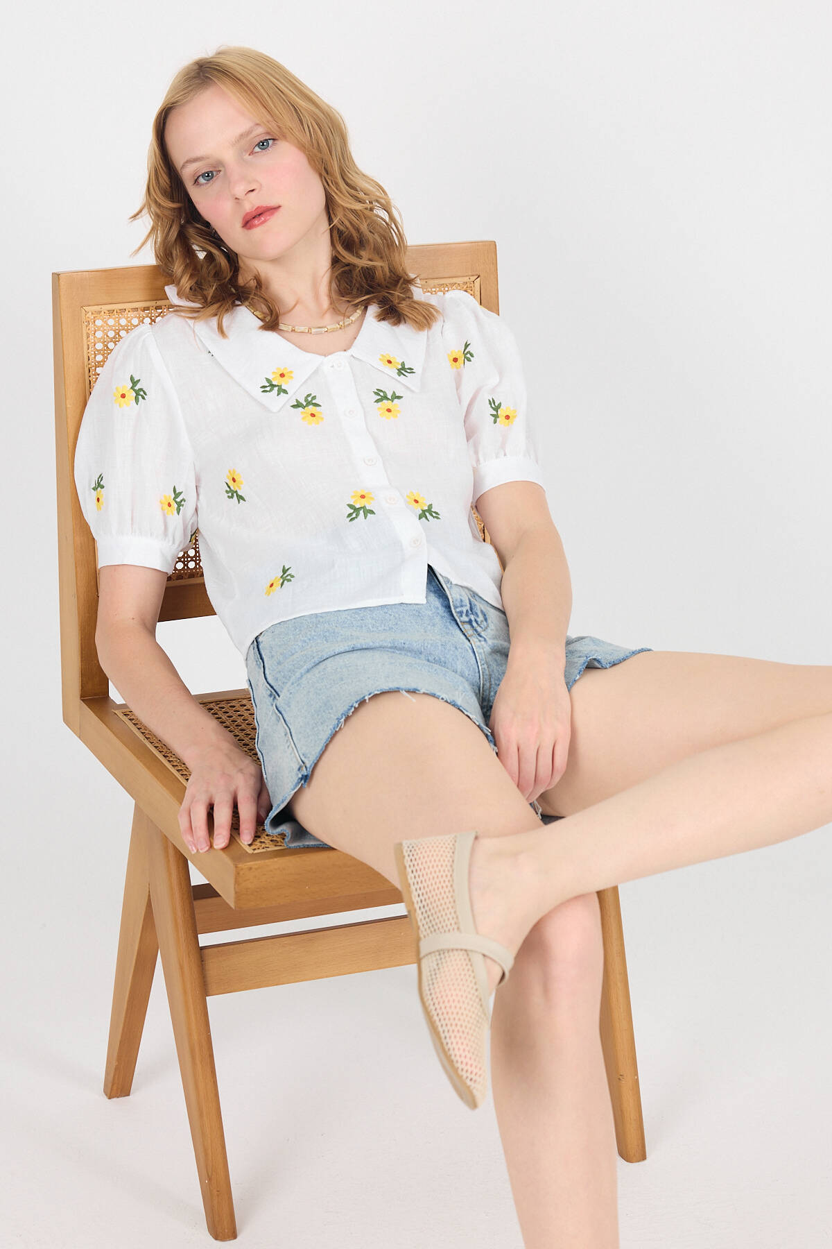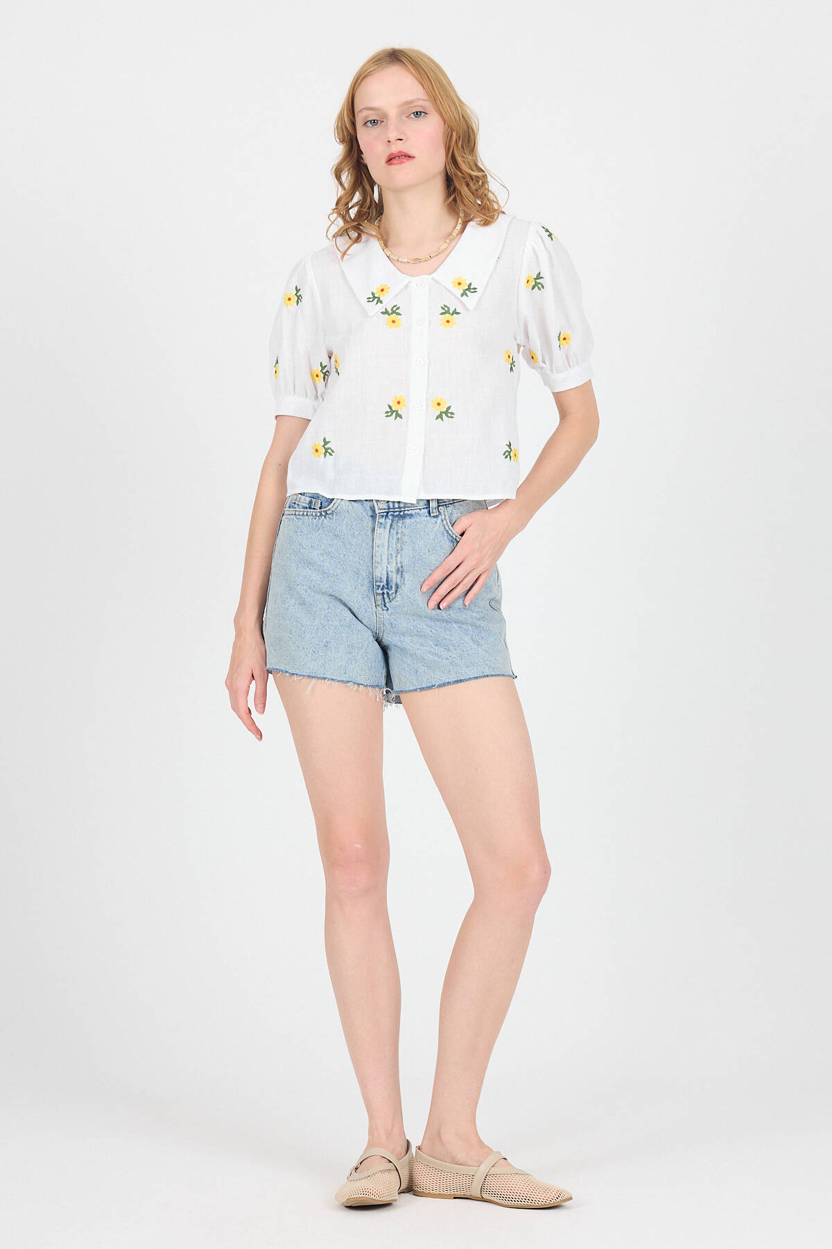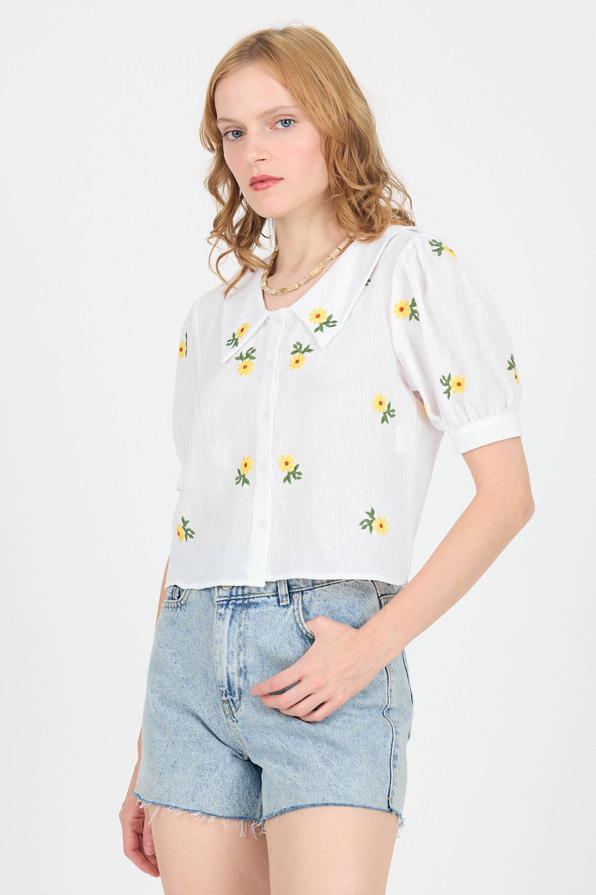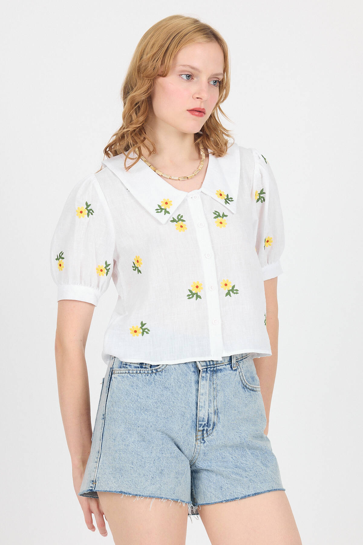 Beyaz Papatya İşlemeli Bebe Yaka %100 Pamuk Müslin Gömlek Bluz 0391