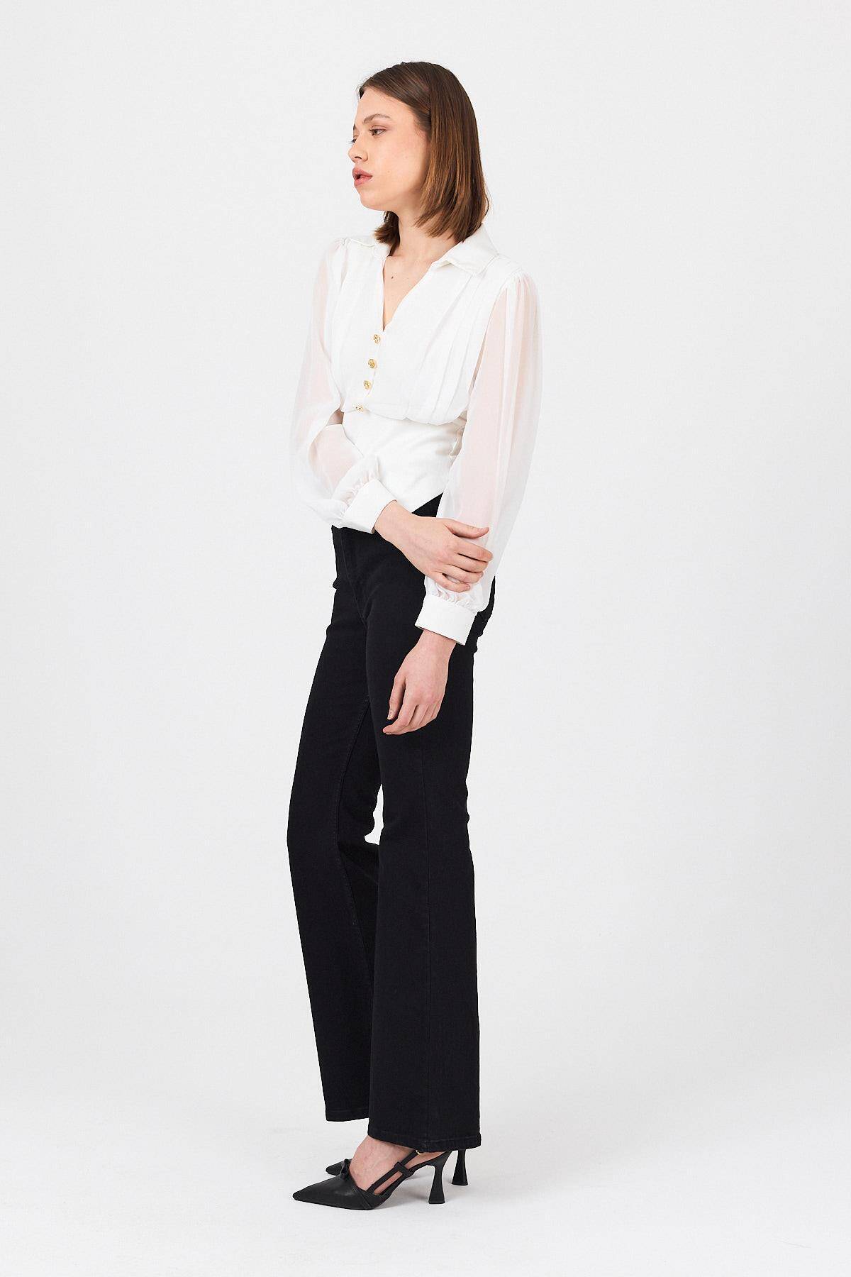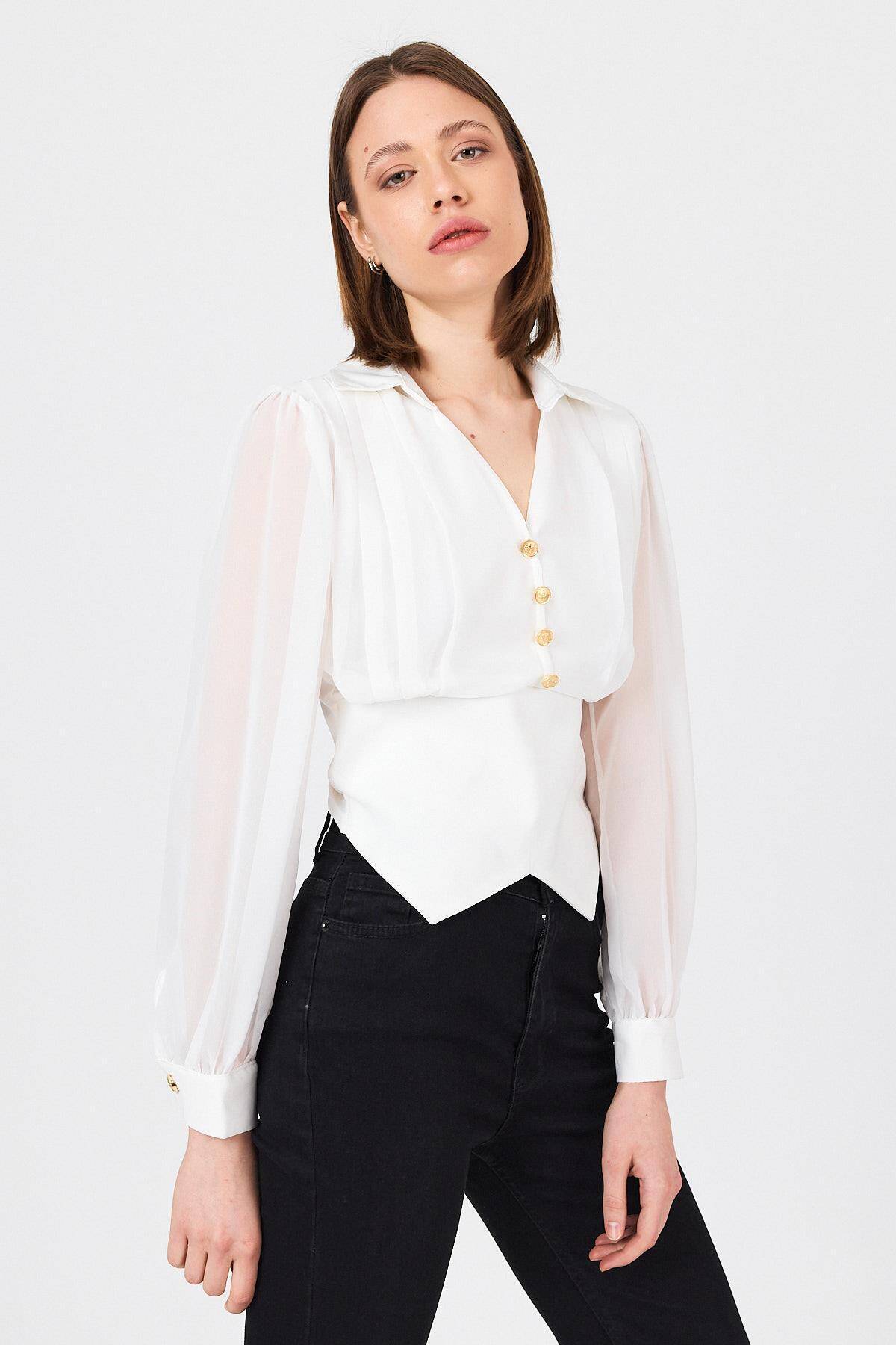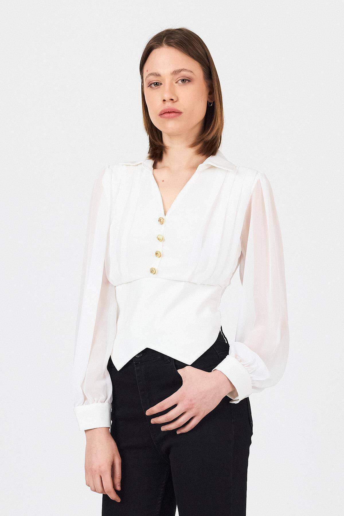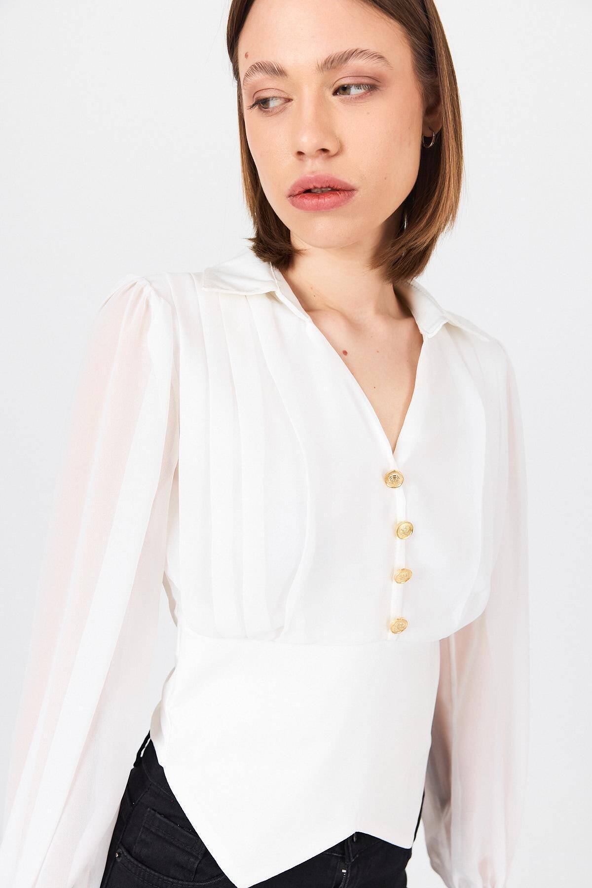 Beyaz Pileli Gömlek Yaka Düğmeli Bluz 9471