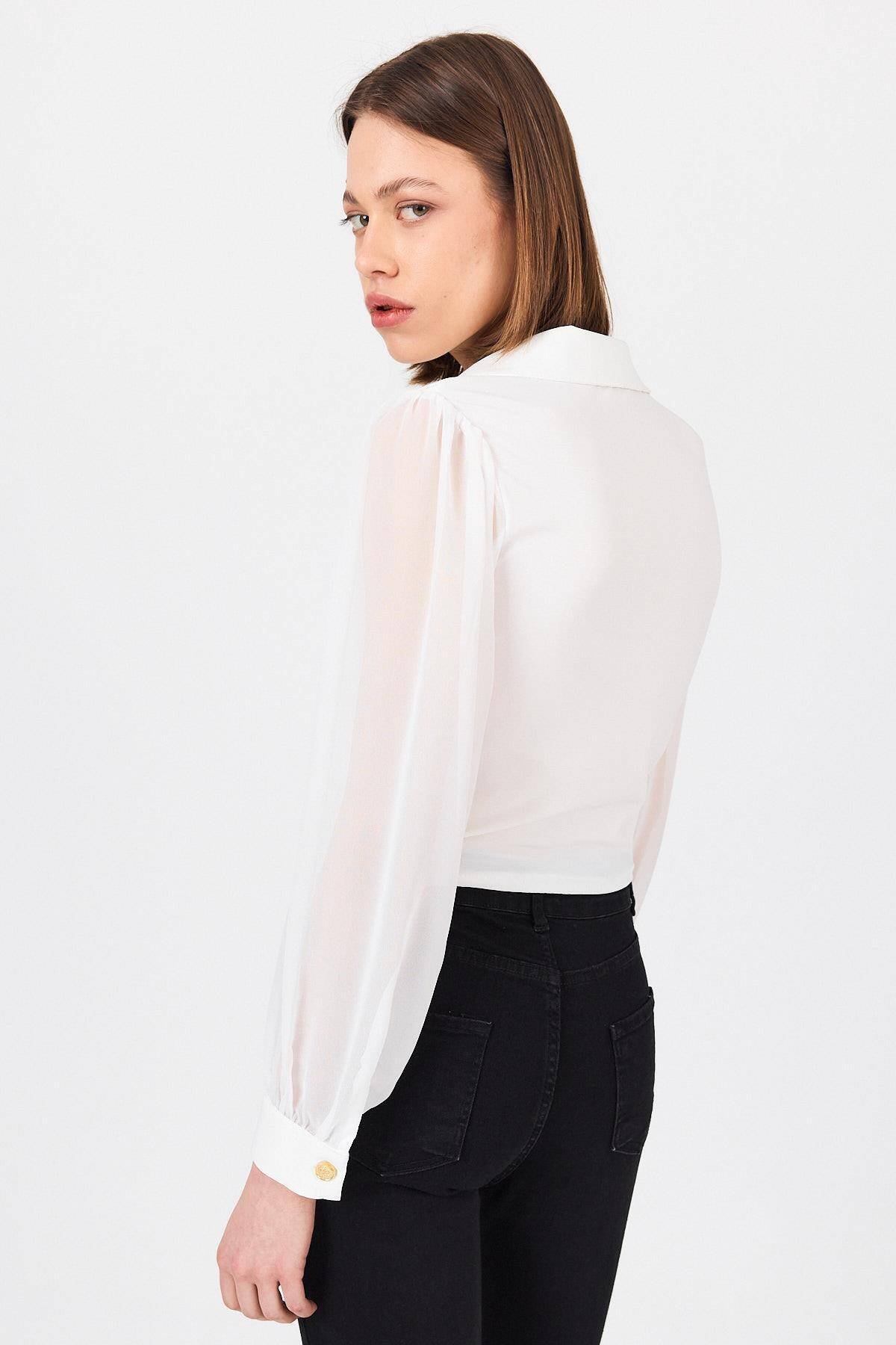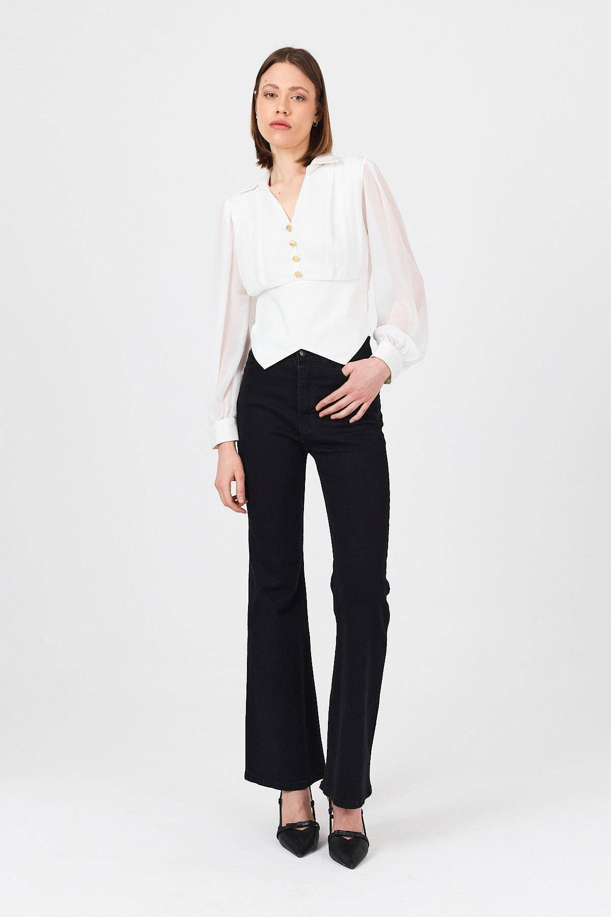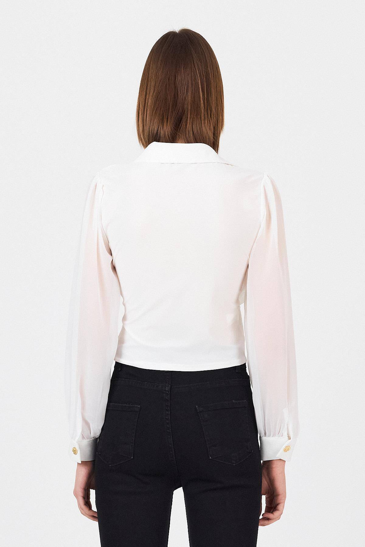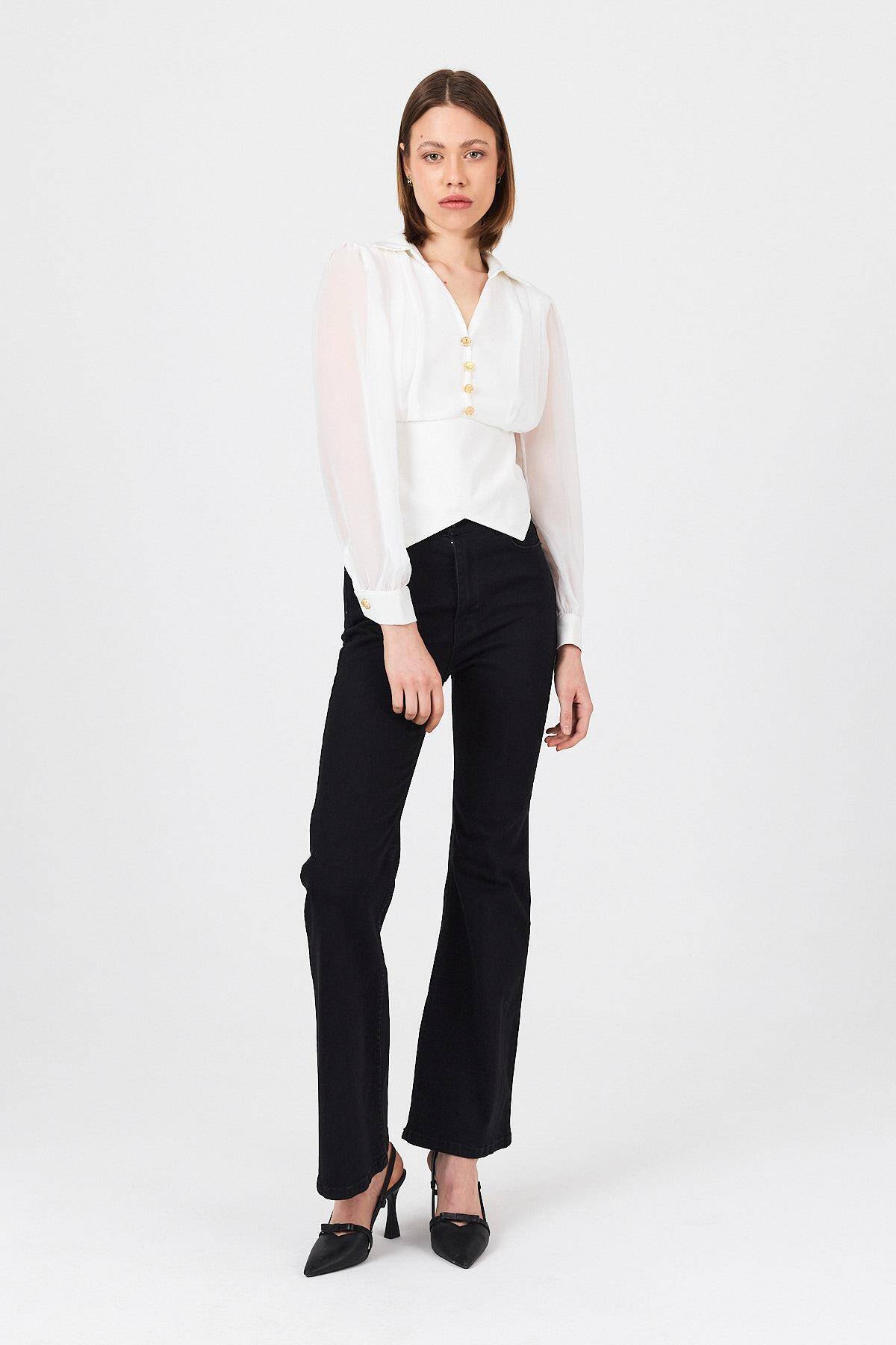 Beyaz Pileli Gömlek Yaka Düğmeli Bluz 9471
