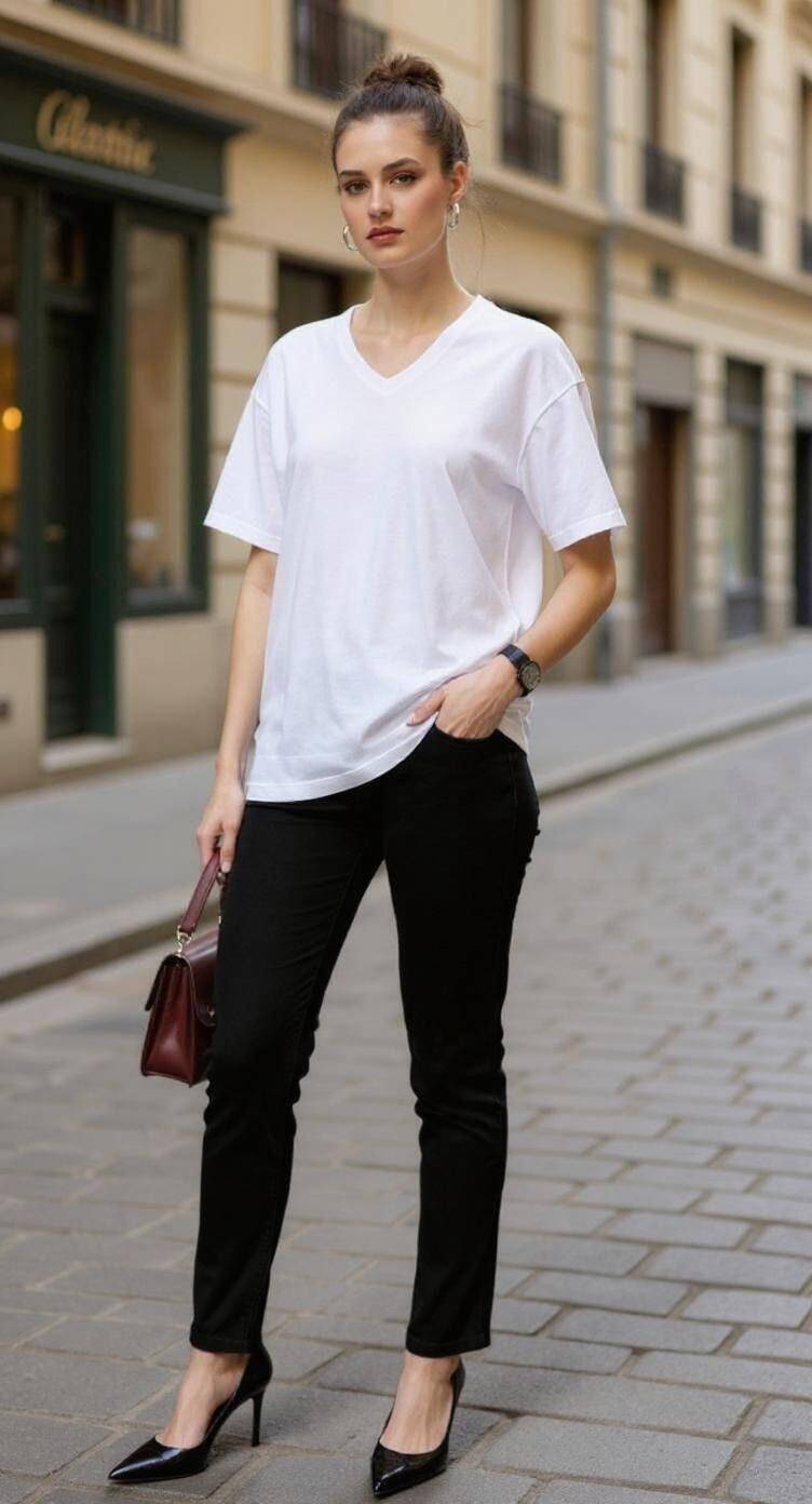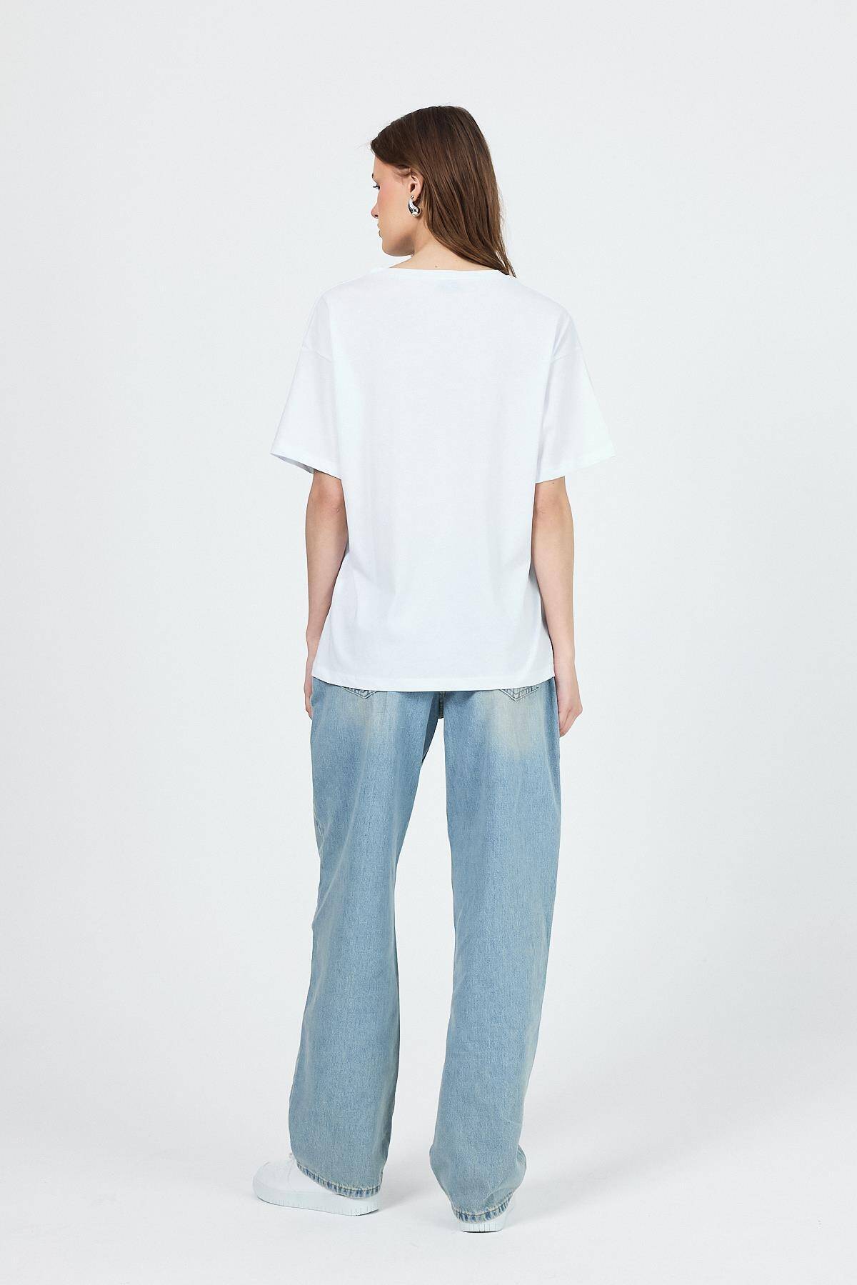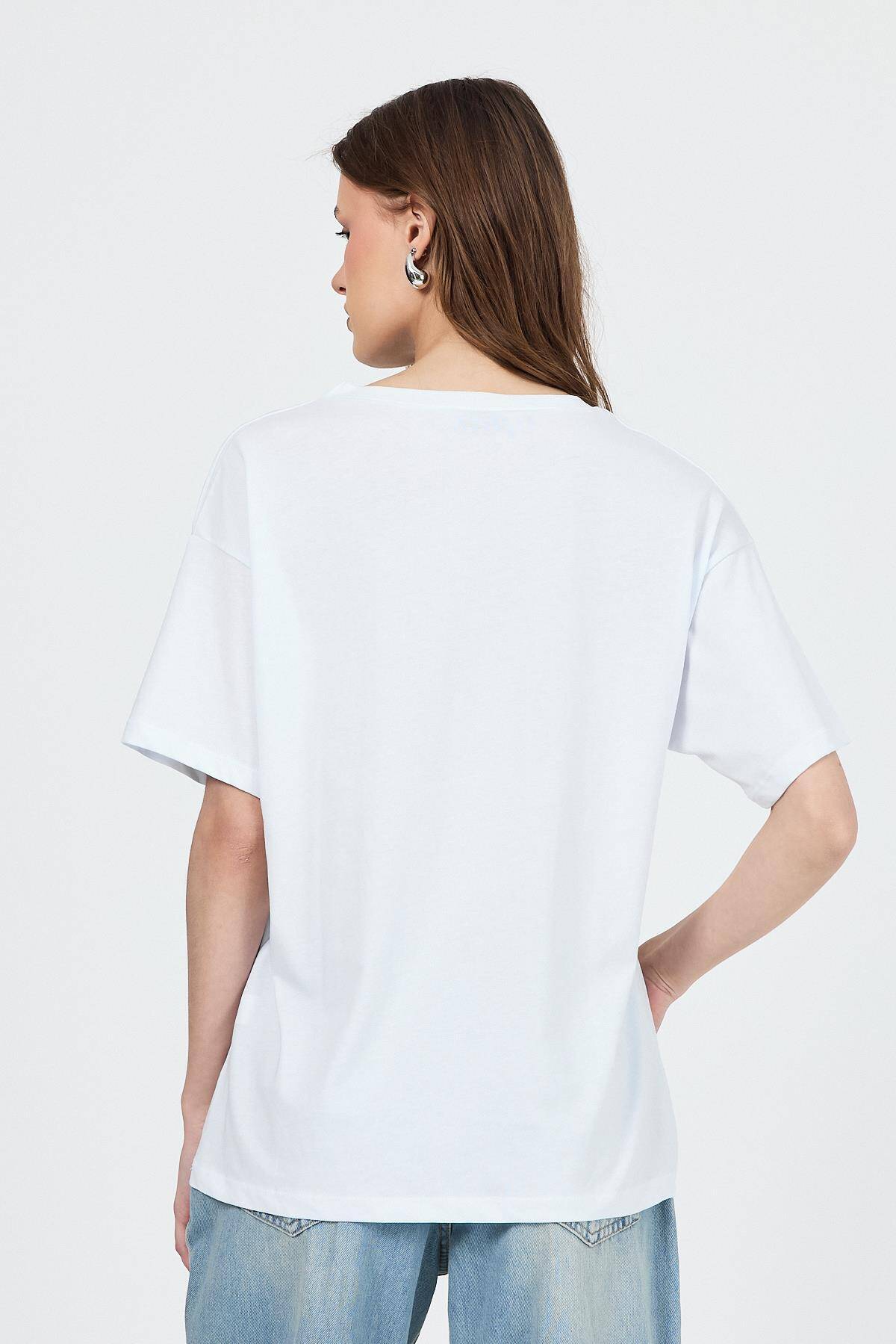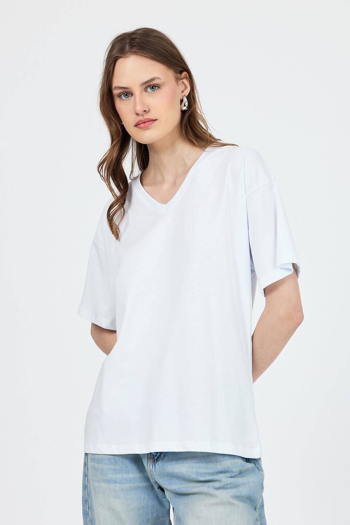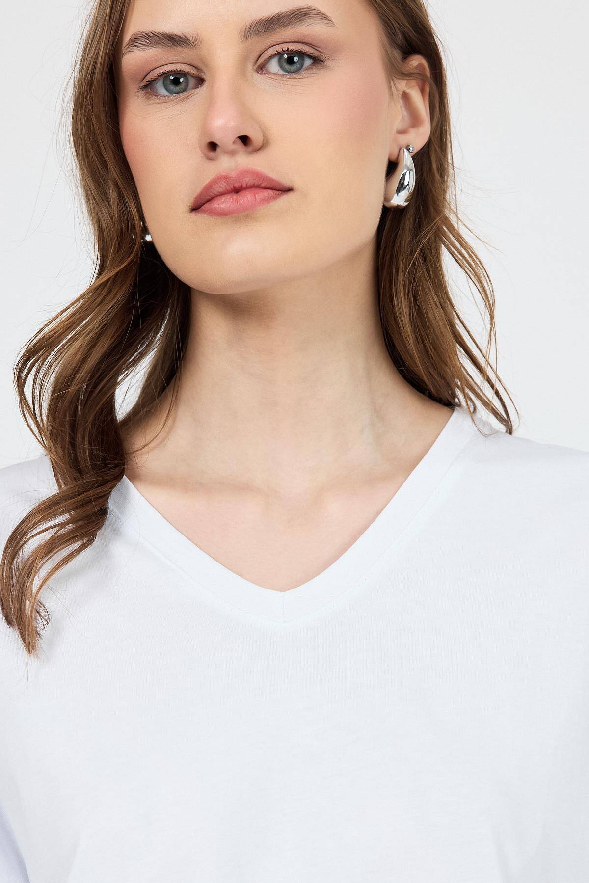 Beyaz V Yaka %100 Pamuk Comfort Fit Tişört 2143M