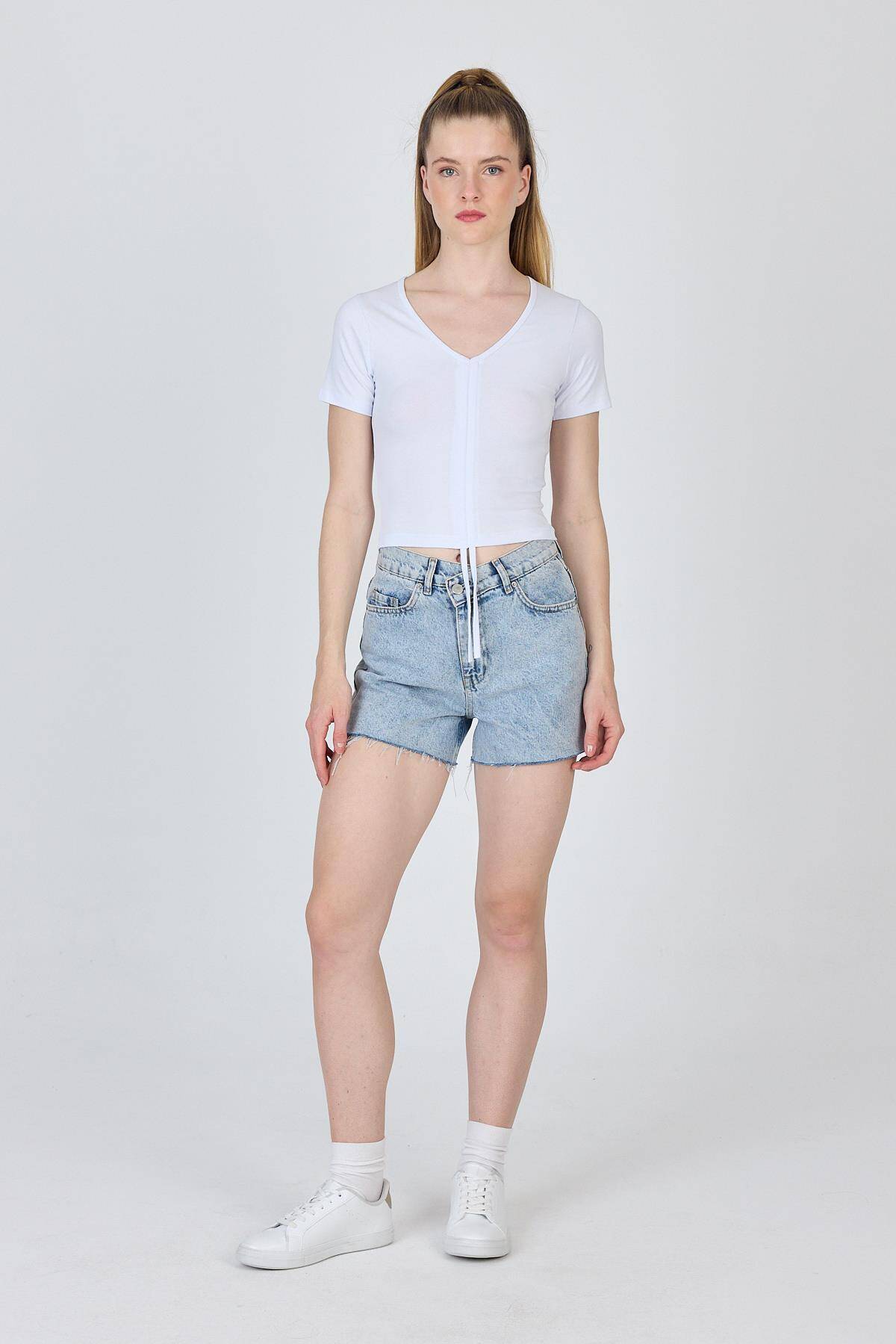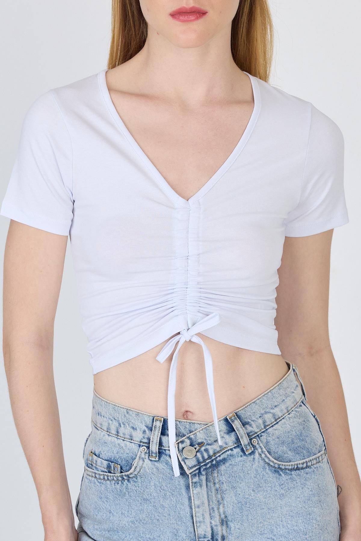 Beyaz V Yaka Büzgülü Crop Tişört 9201M