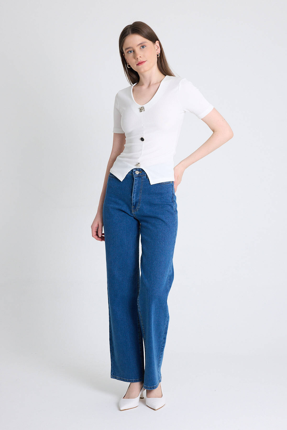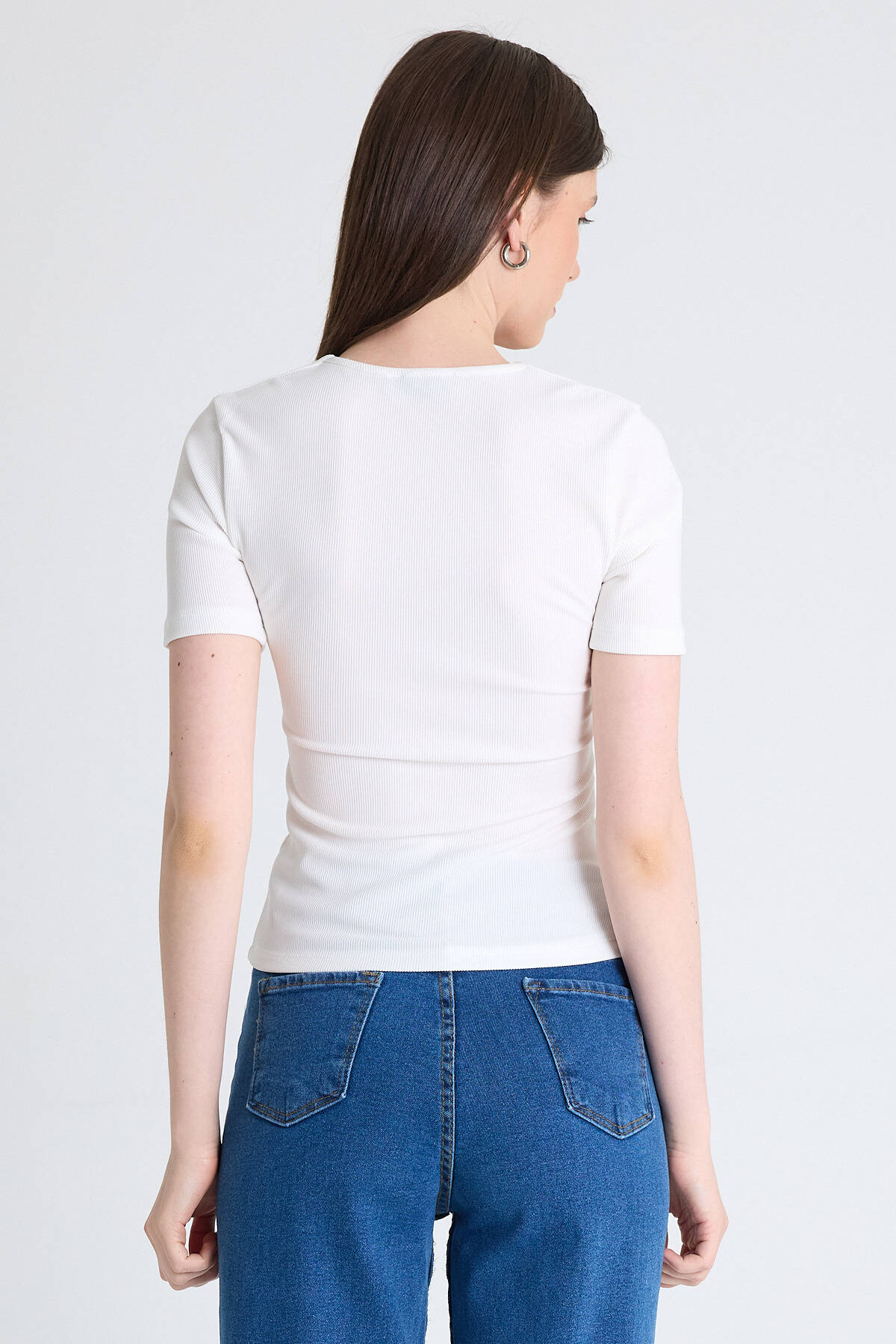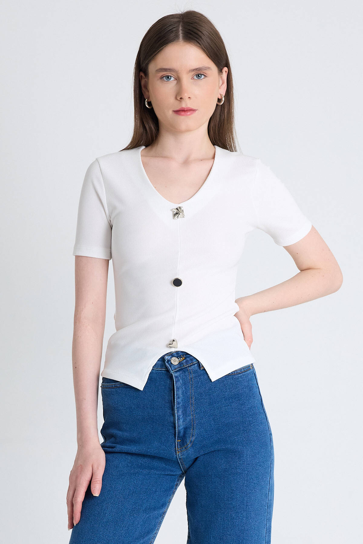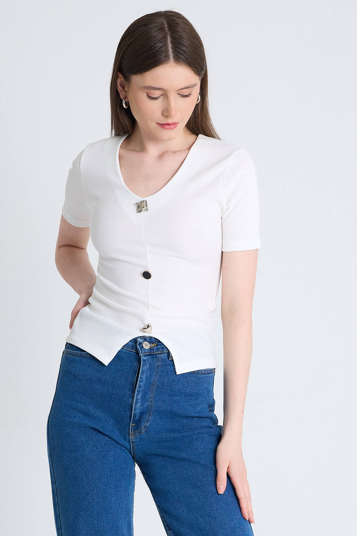 Beyaz V Yaka Düğme Detaylı Kısa Kollu Tişört 9205M