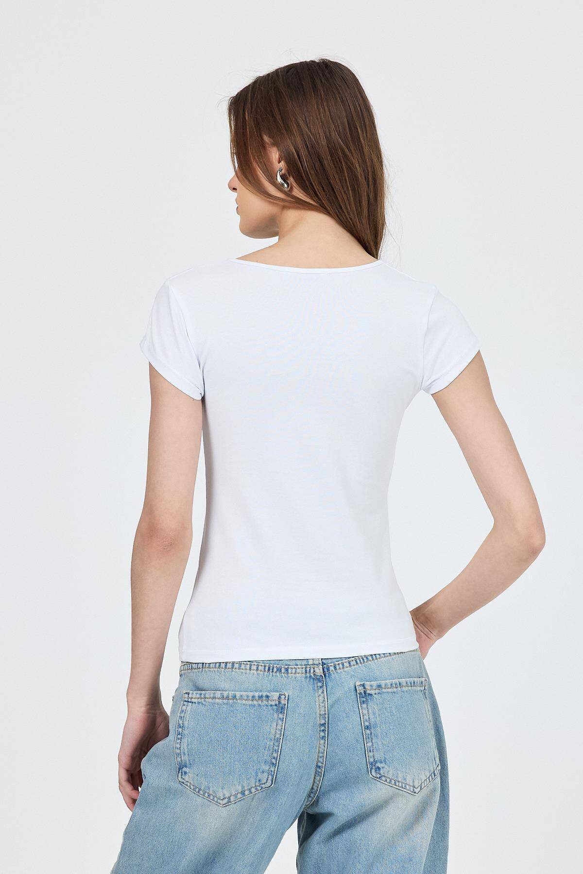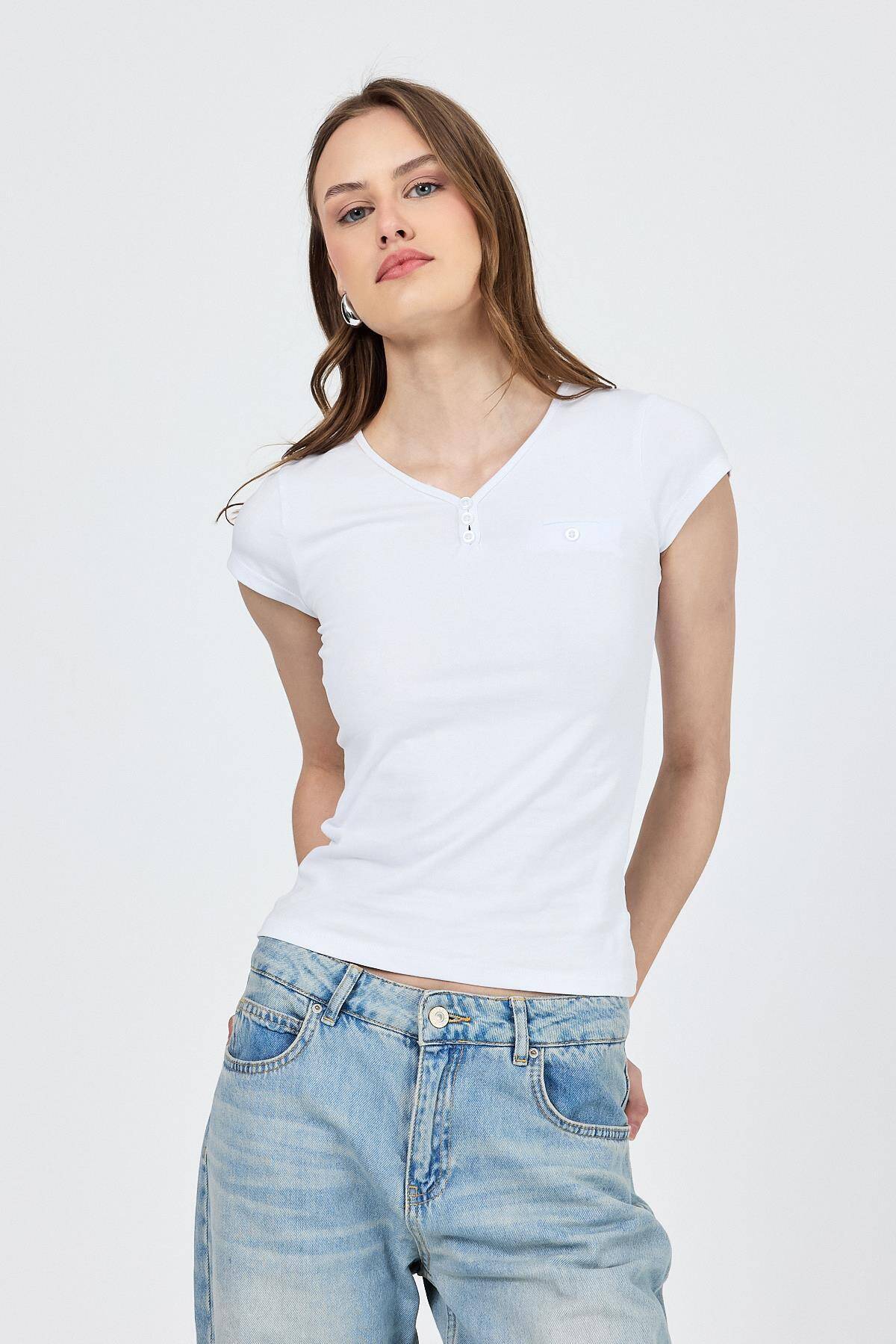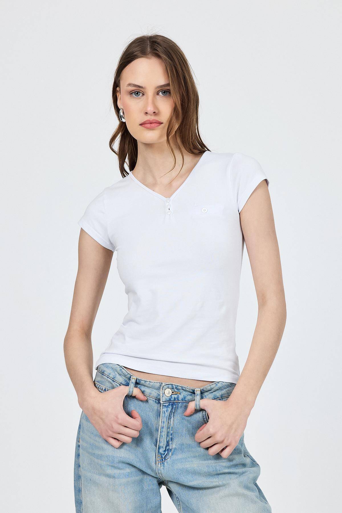 Beyaz V Yaka Düğmeli Cep Detaylı Slim Fit Tişört 2213