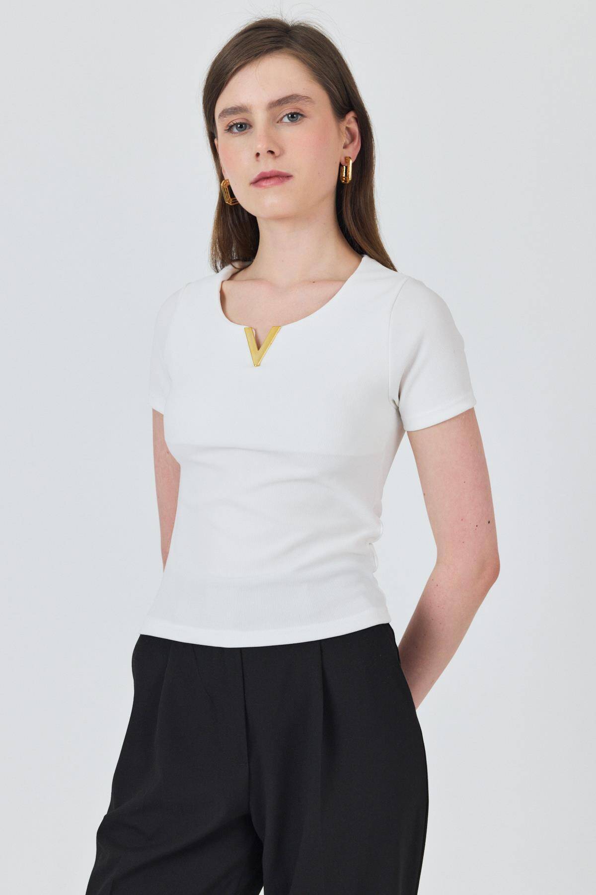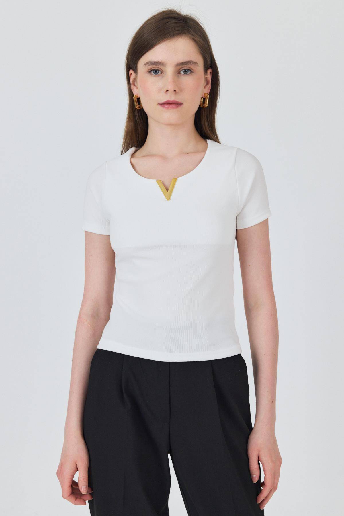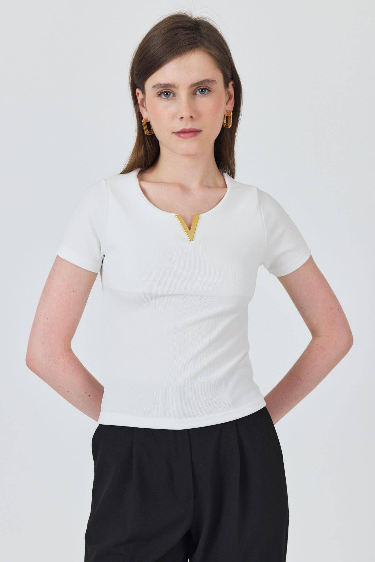 Beyaz Yaka Aksesuar Detaylı Örme Tişört 2224