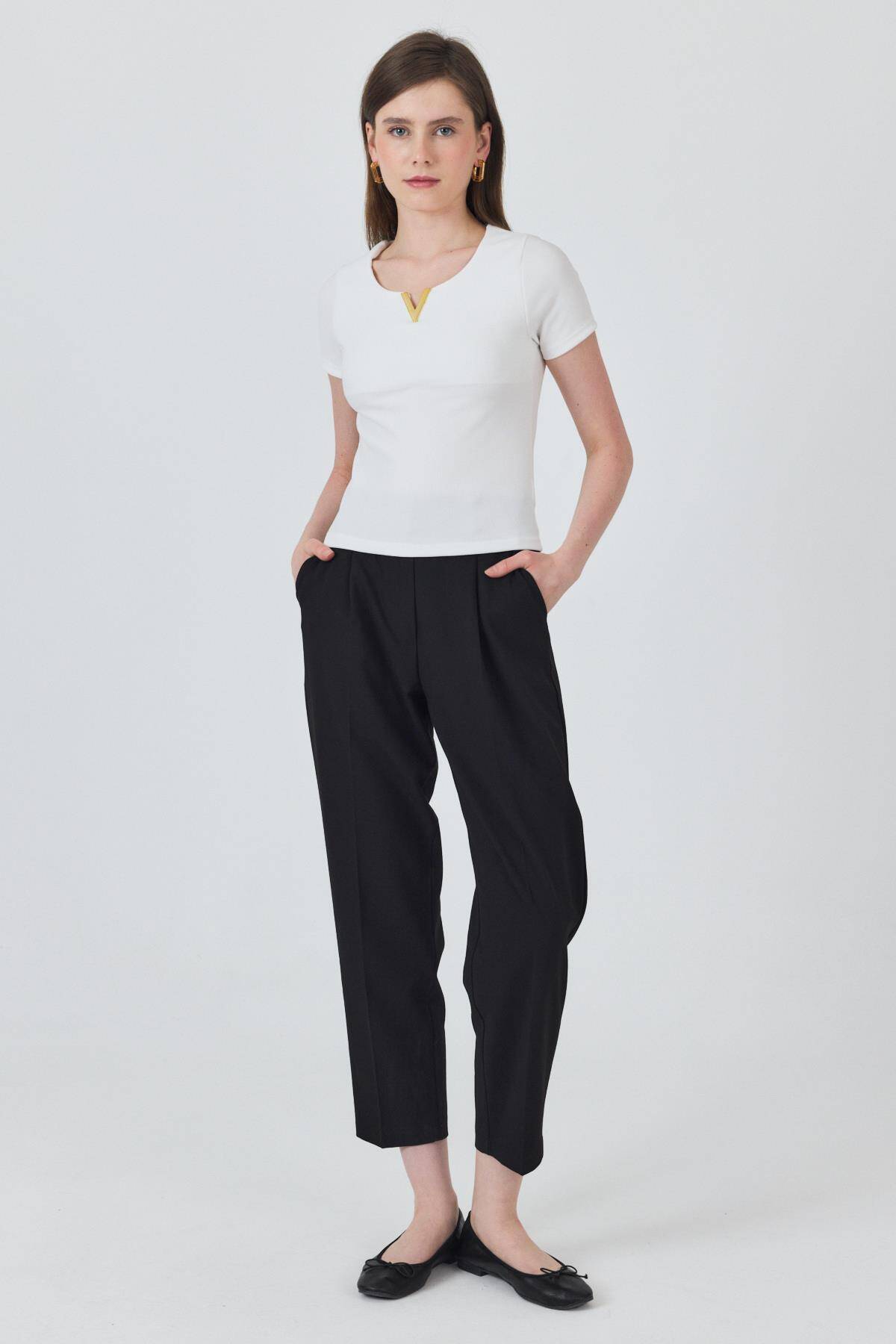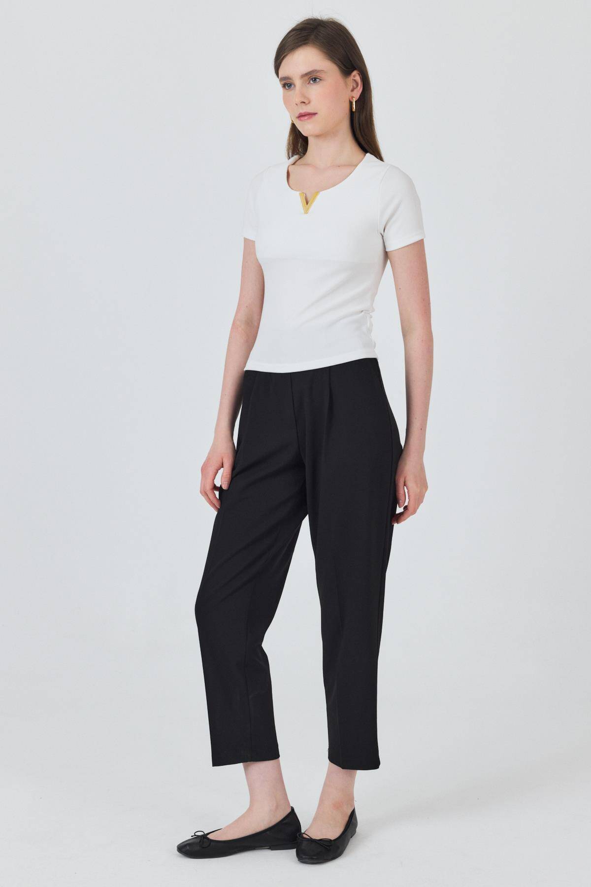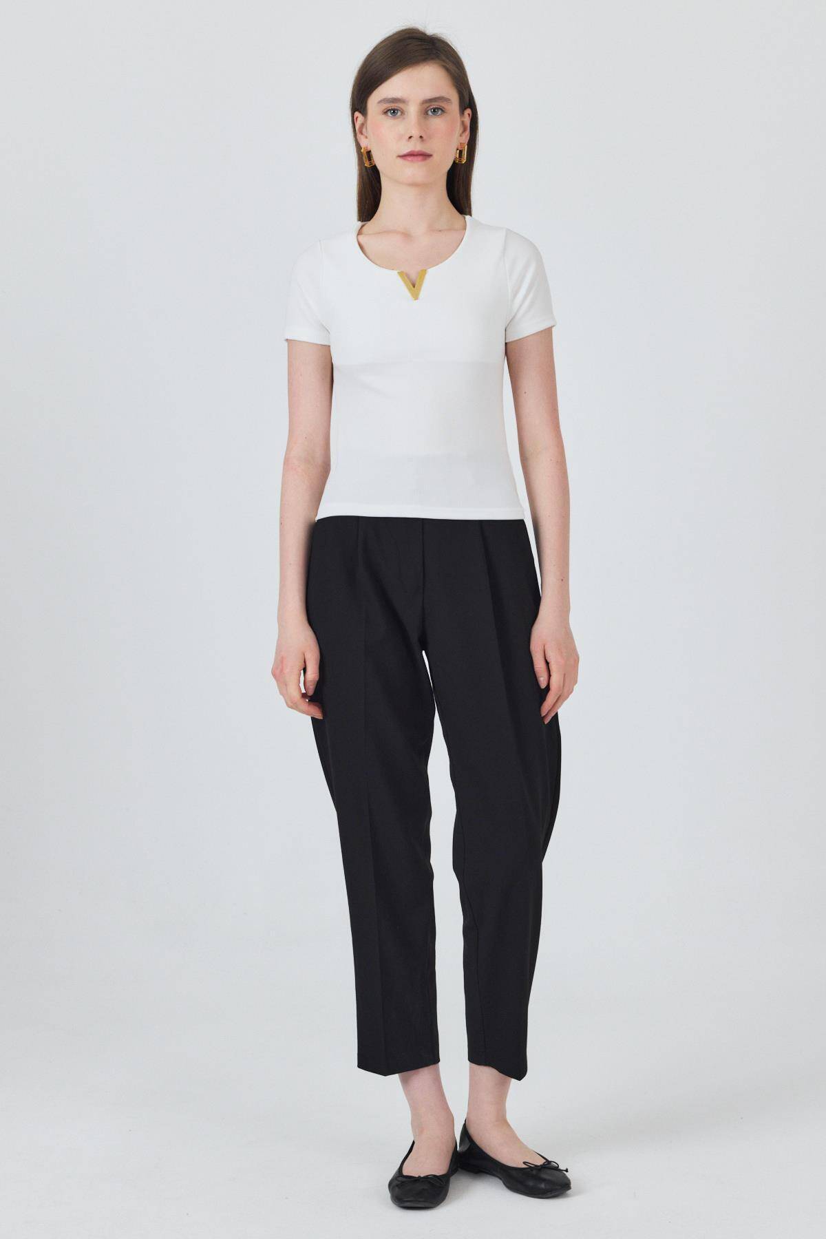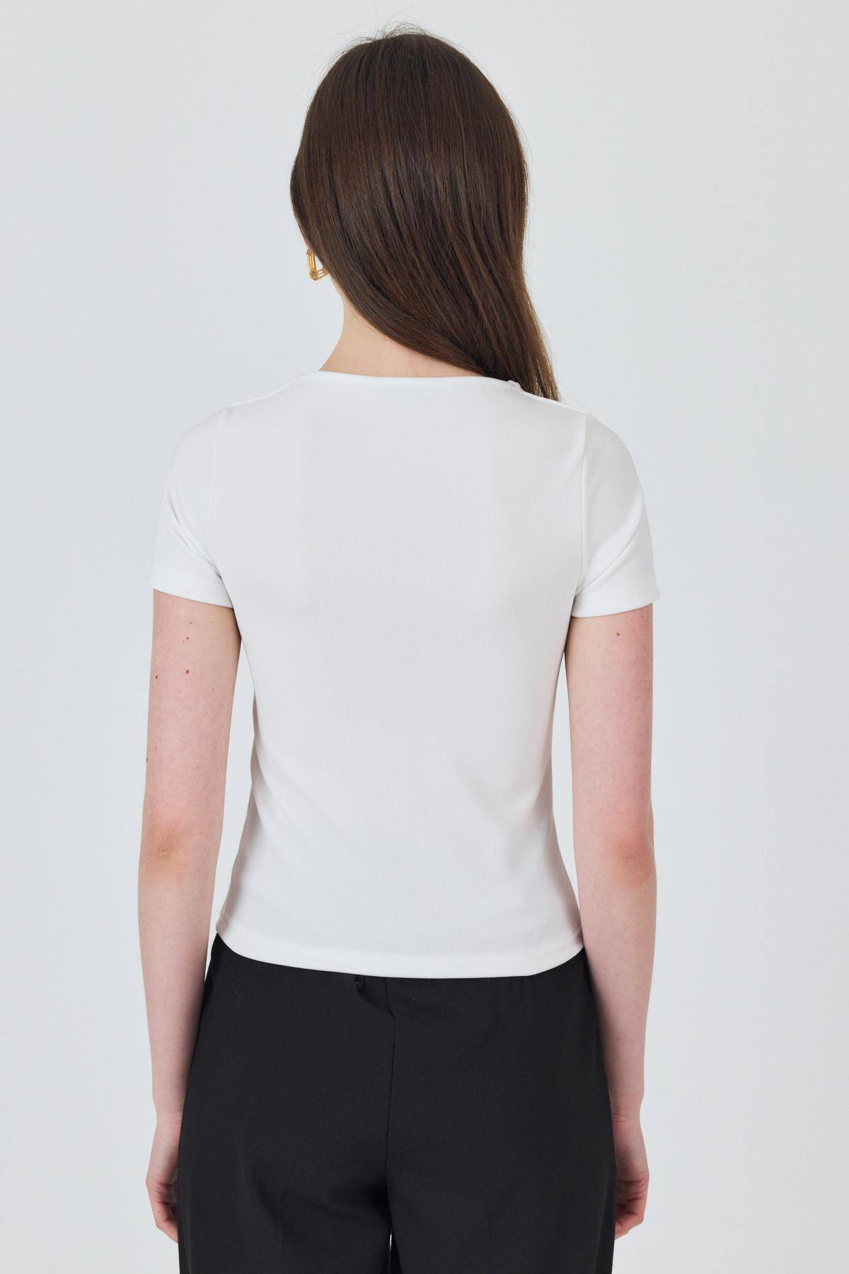 Beyaz Yaka Aksesuar Detaylı Örme Tişört 2224