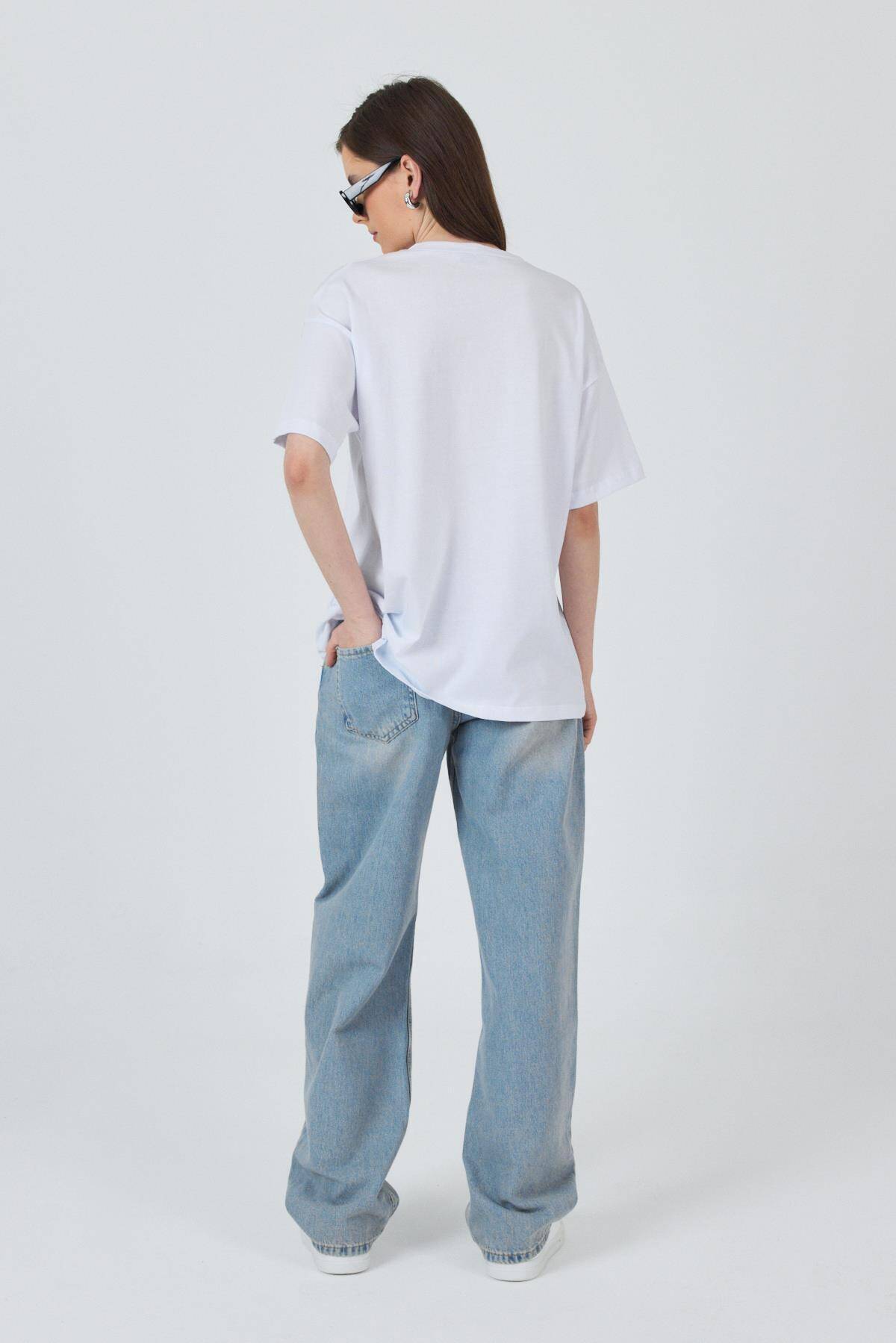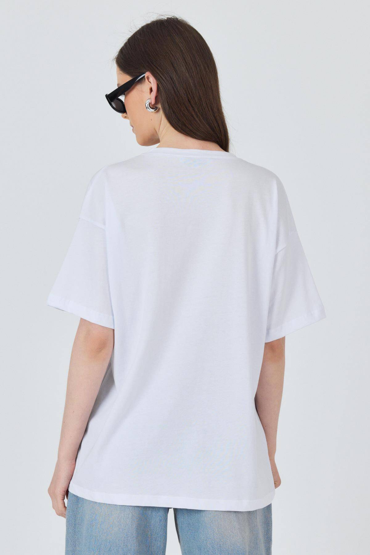 Beyaz Yaka Yazı Baskılı Oversize Pamuklu Tişört 2150-34M