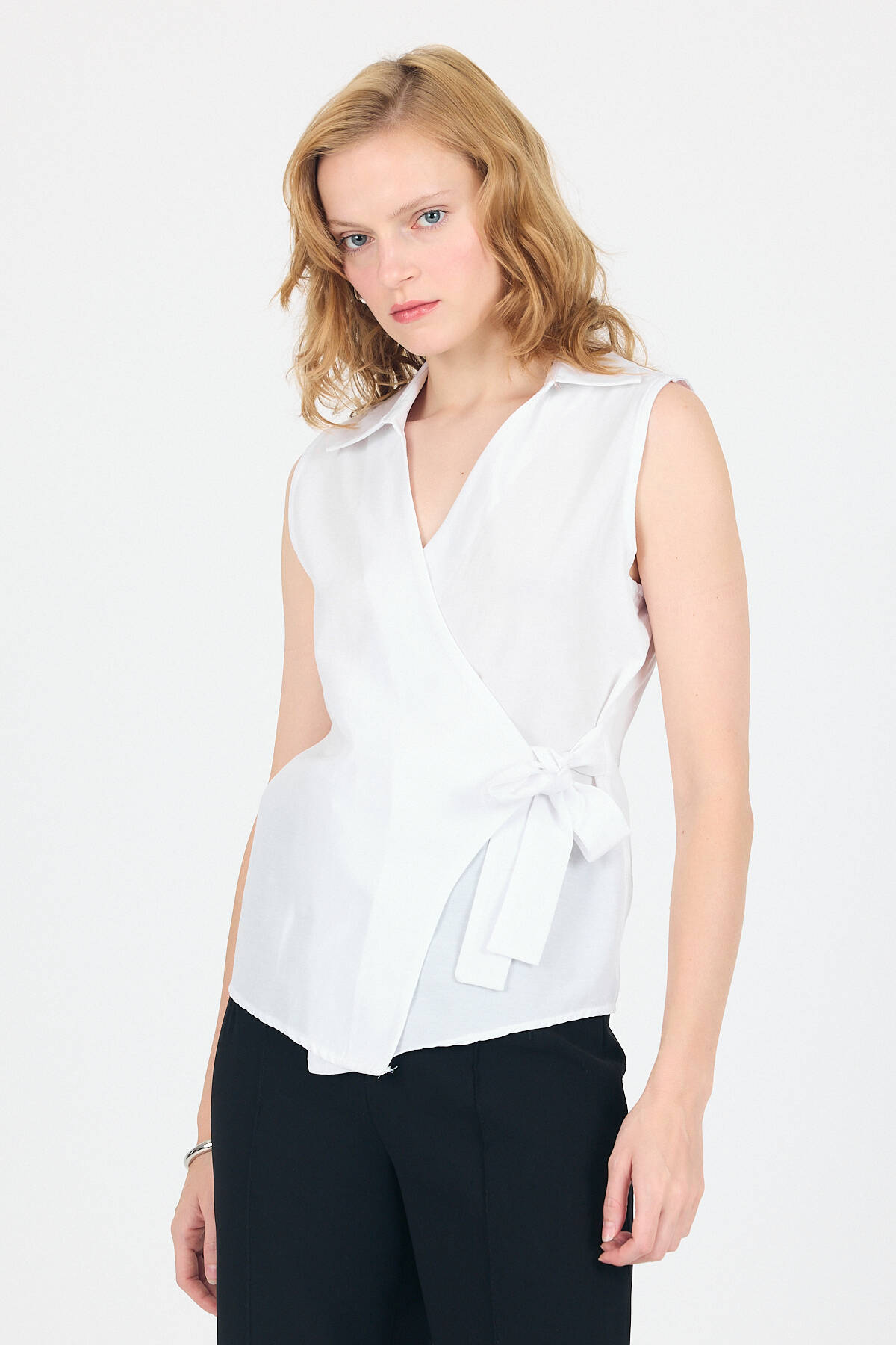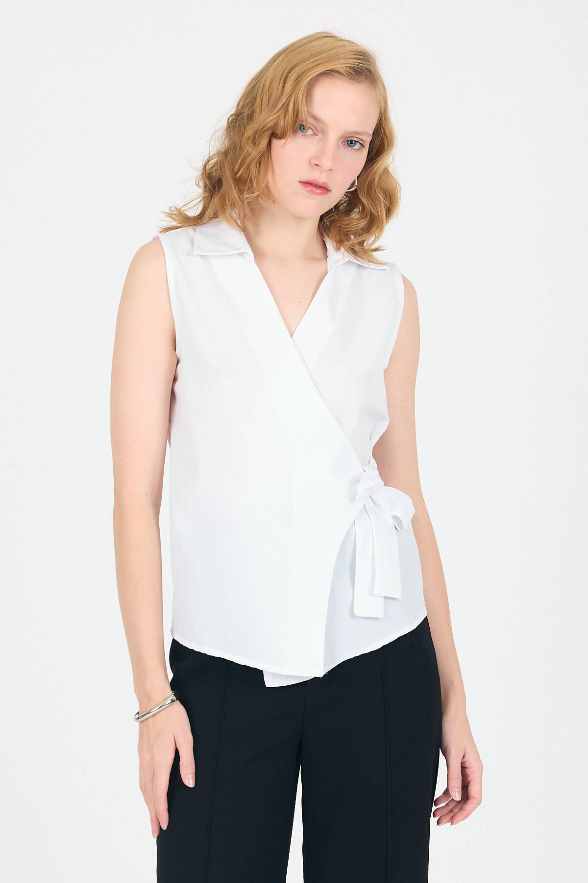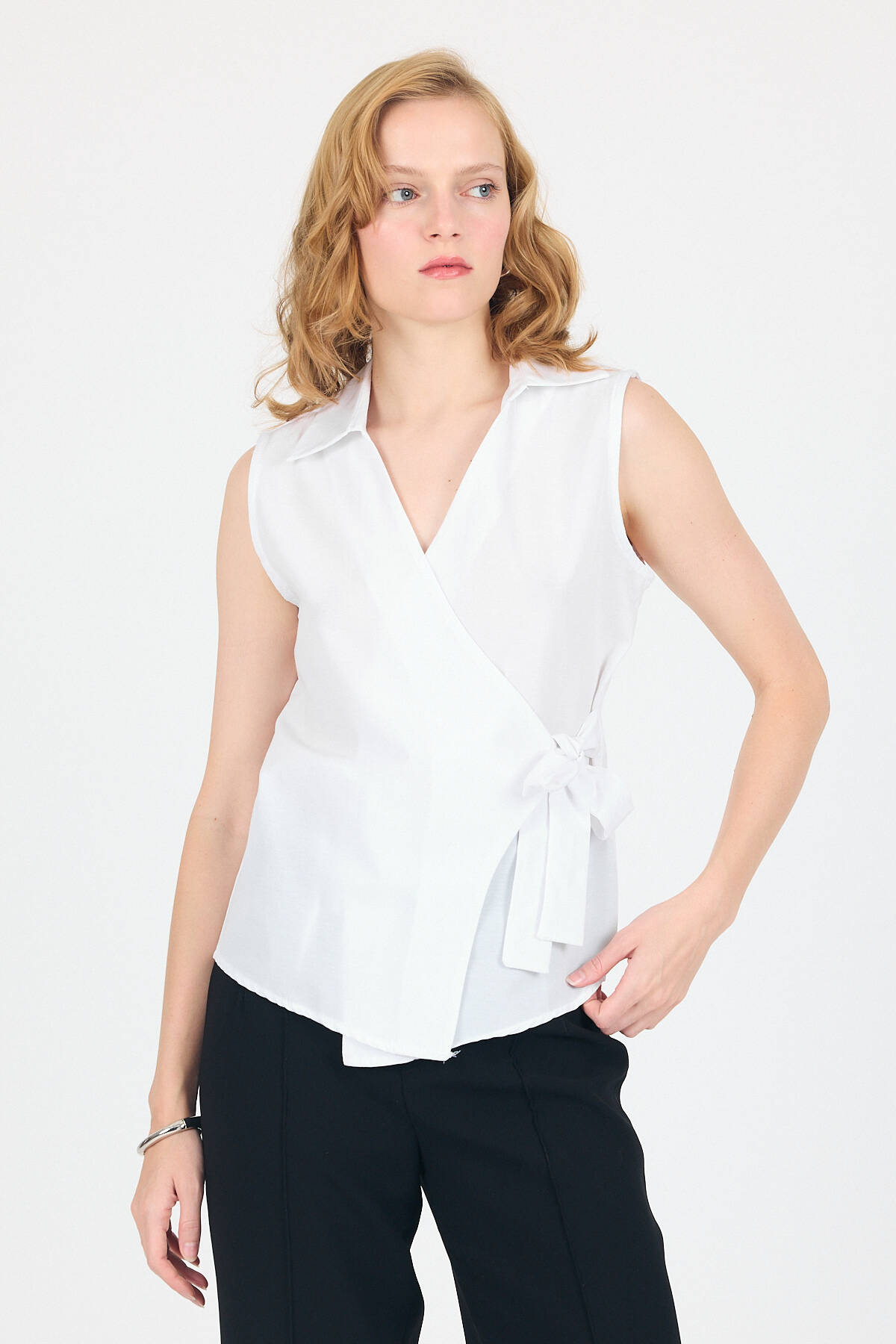 Beyaz Yan Bağlama Detaylı Kolsuz Kruvaze Bluz 8047