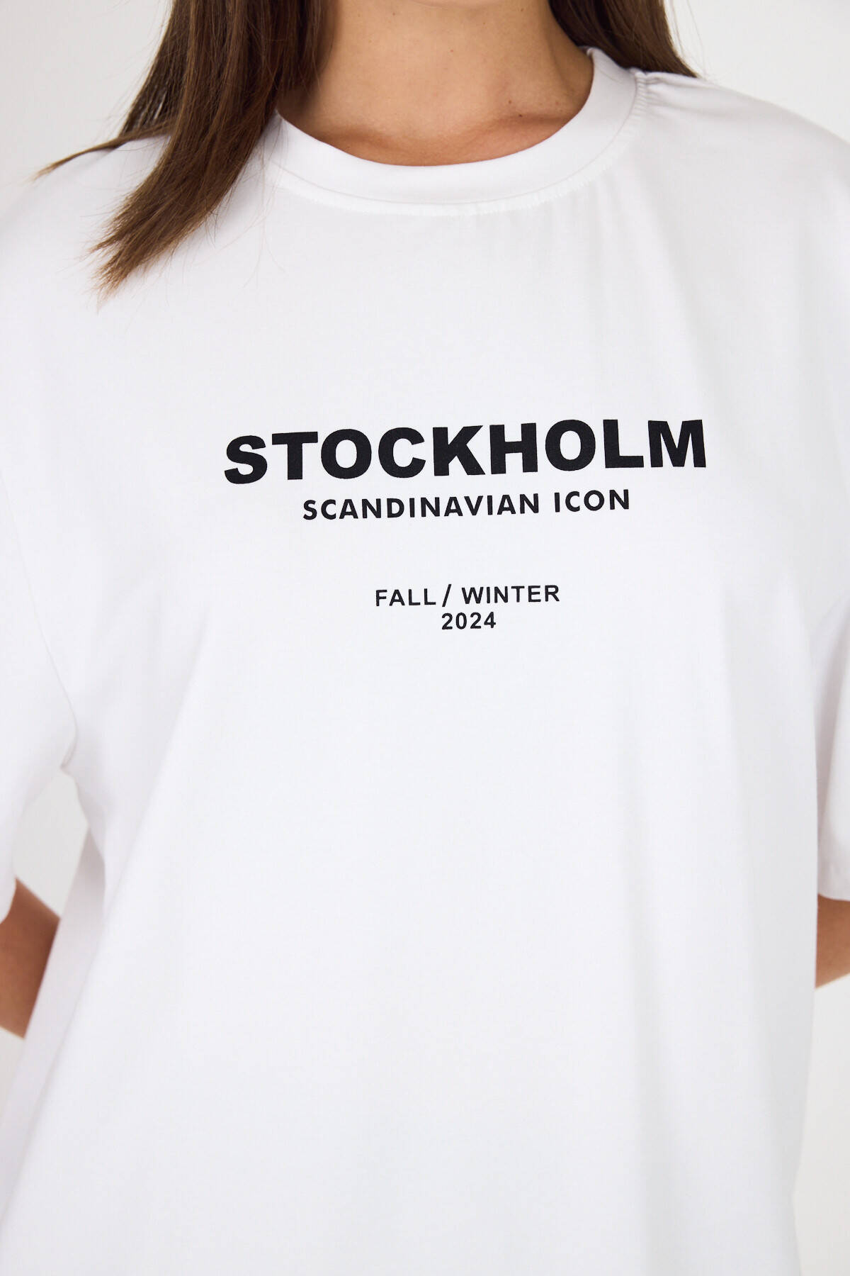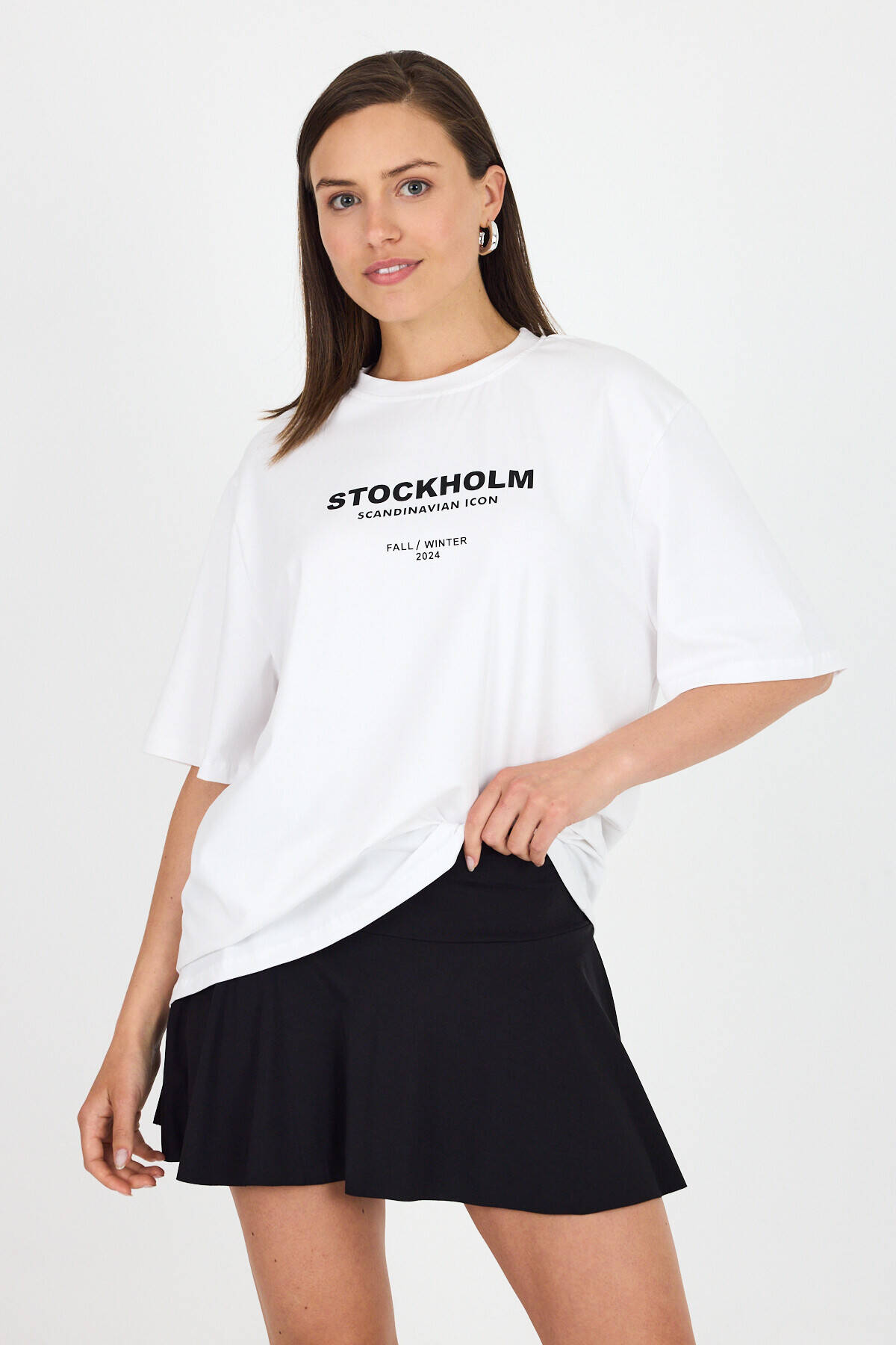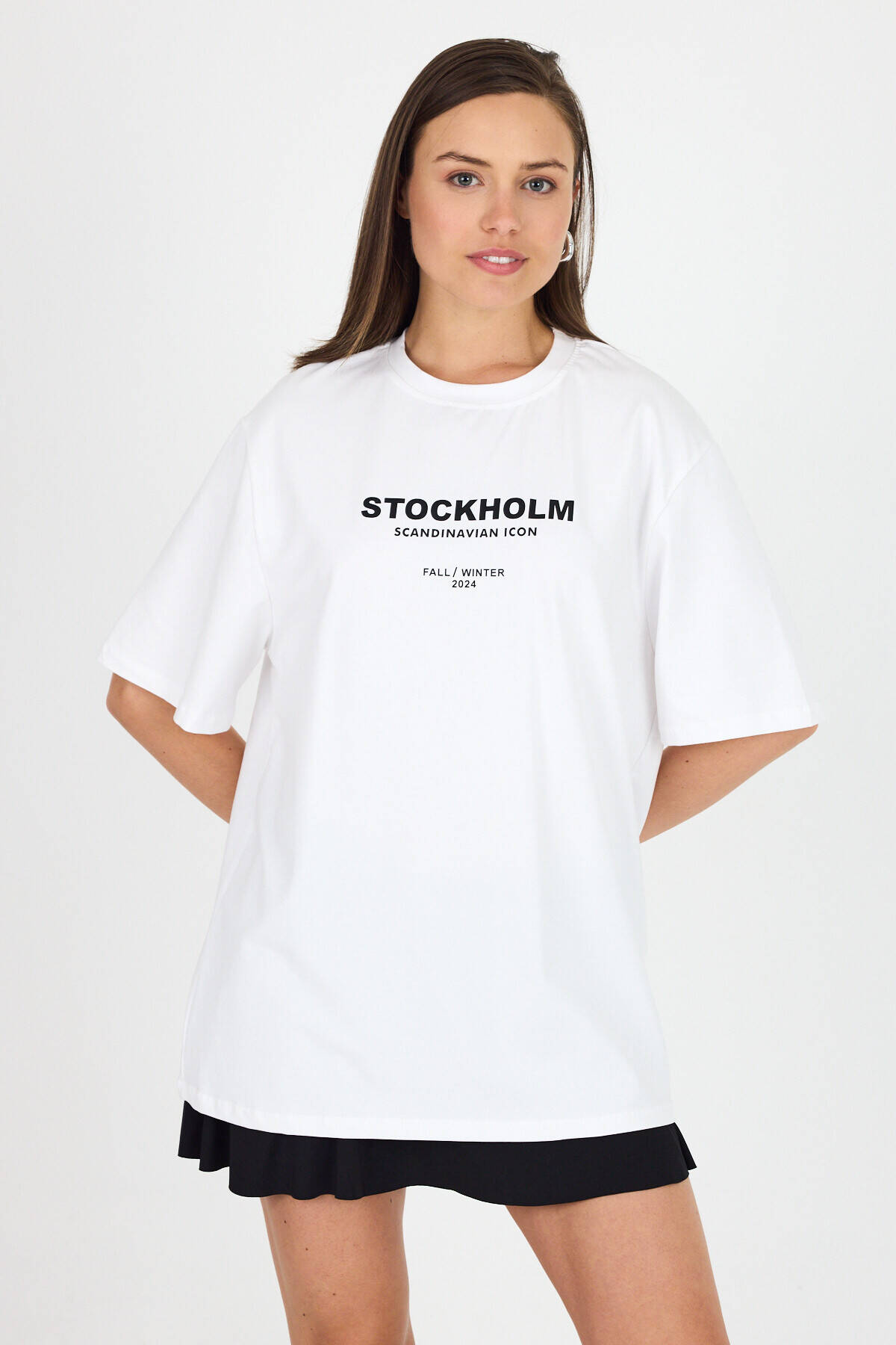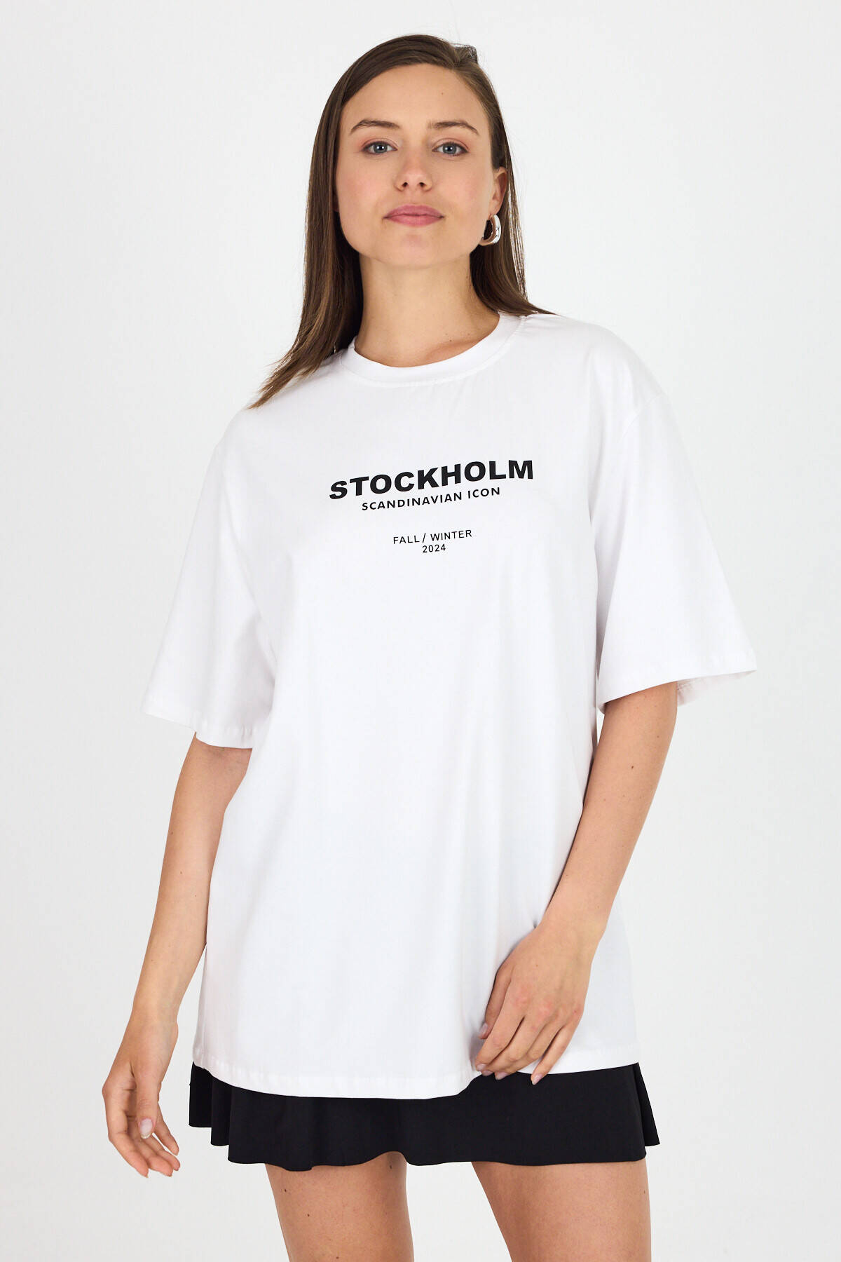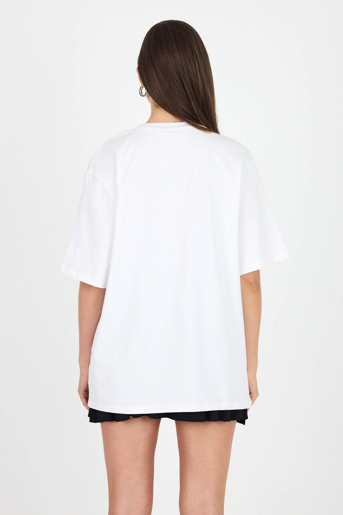 Beyaz Yazı Baskılı Bisiiklet Yaka Oversize Tişört 6056