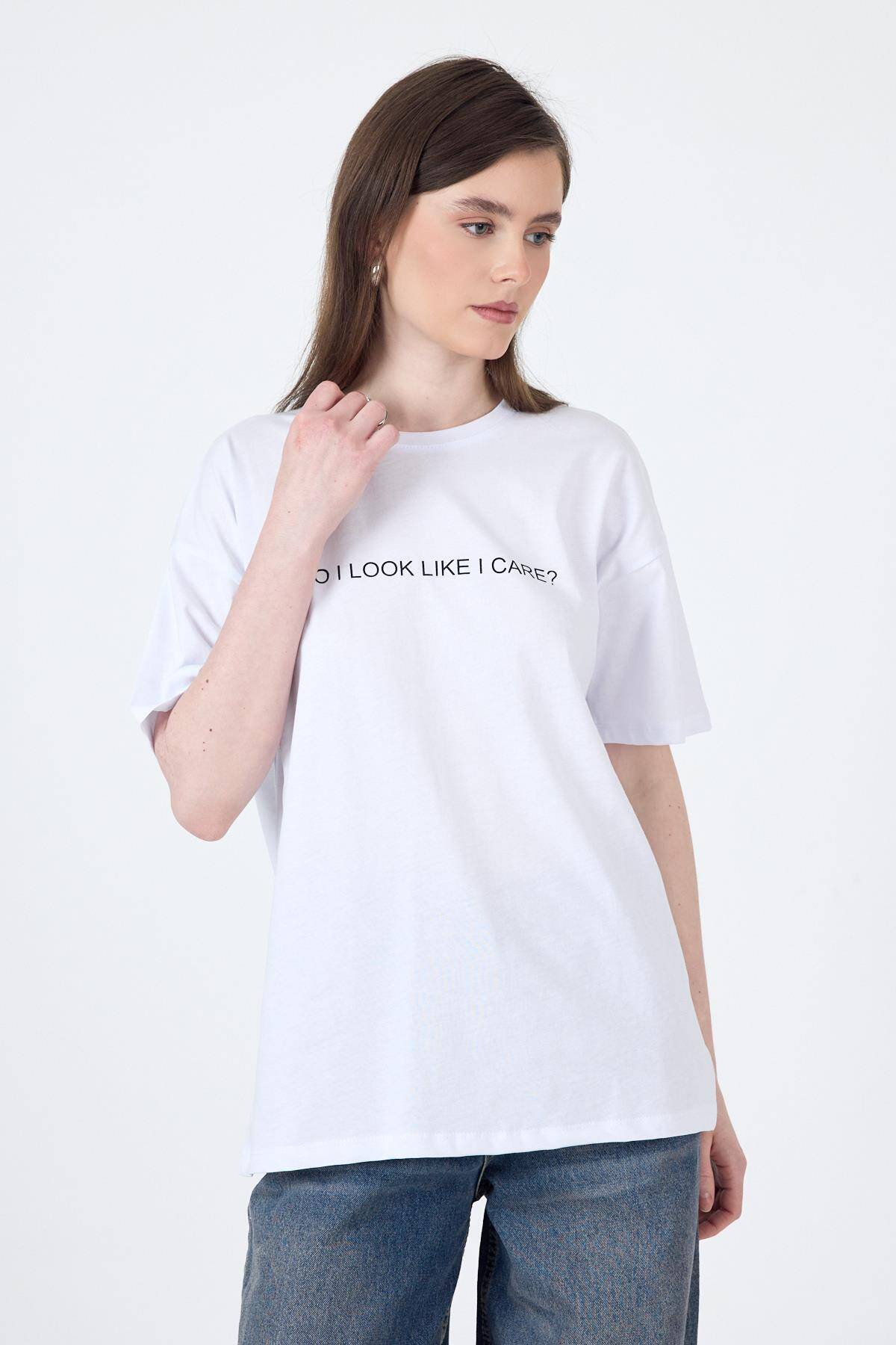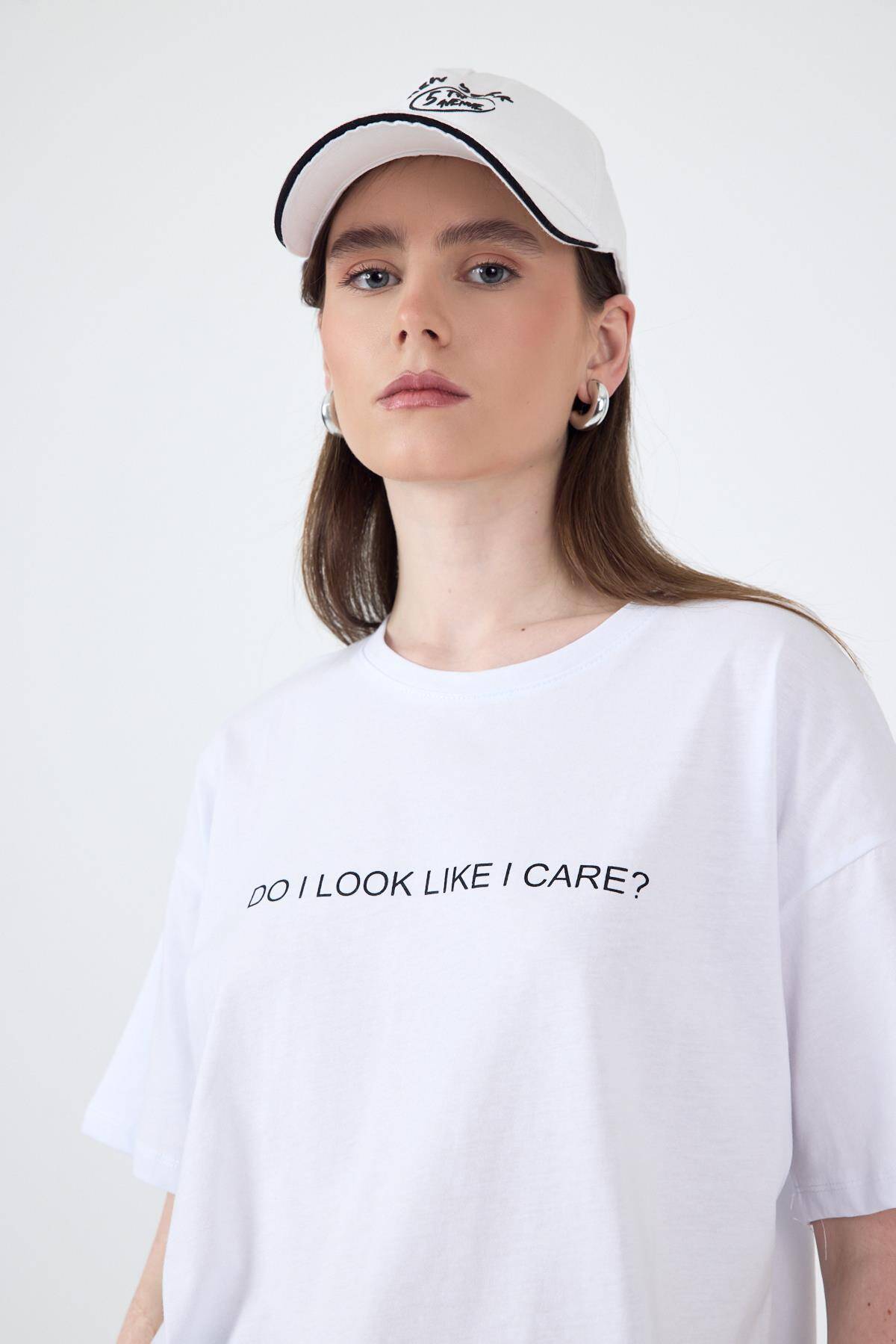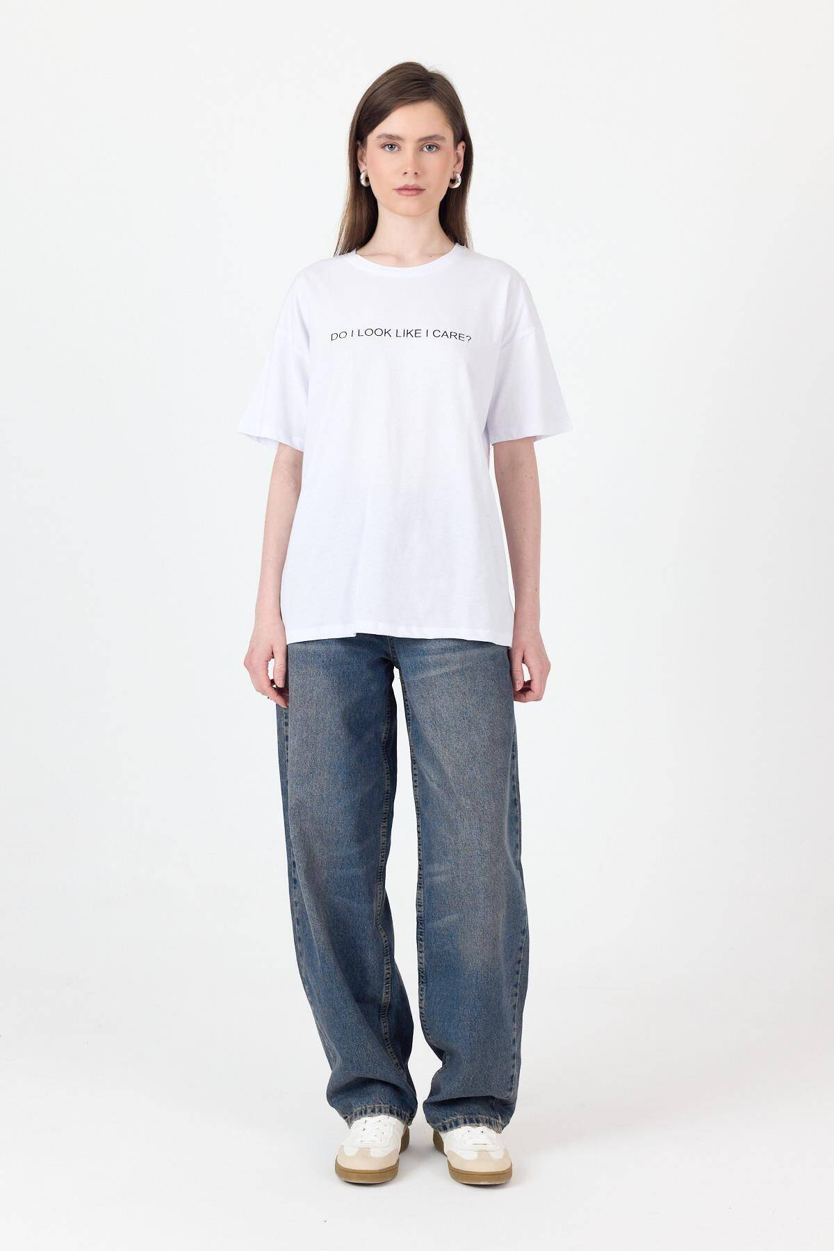 Beyaz Yazı Baskılı Oversize Pamuklu Tişört 2150-5M