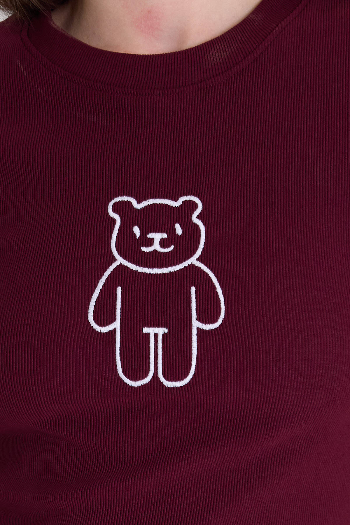 Bordo Ayıcık İşlemeli Slim Fit Crop Tişört 2217