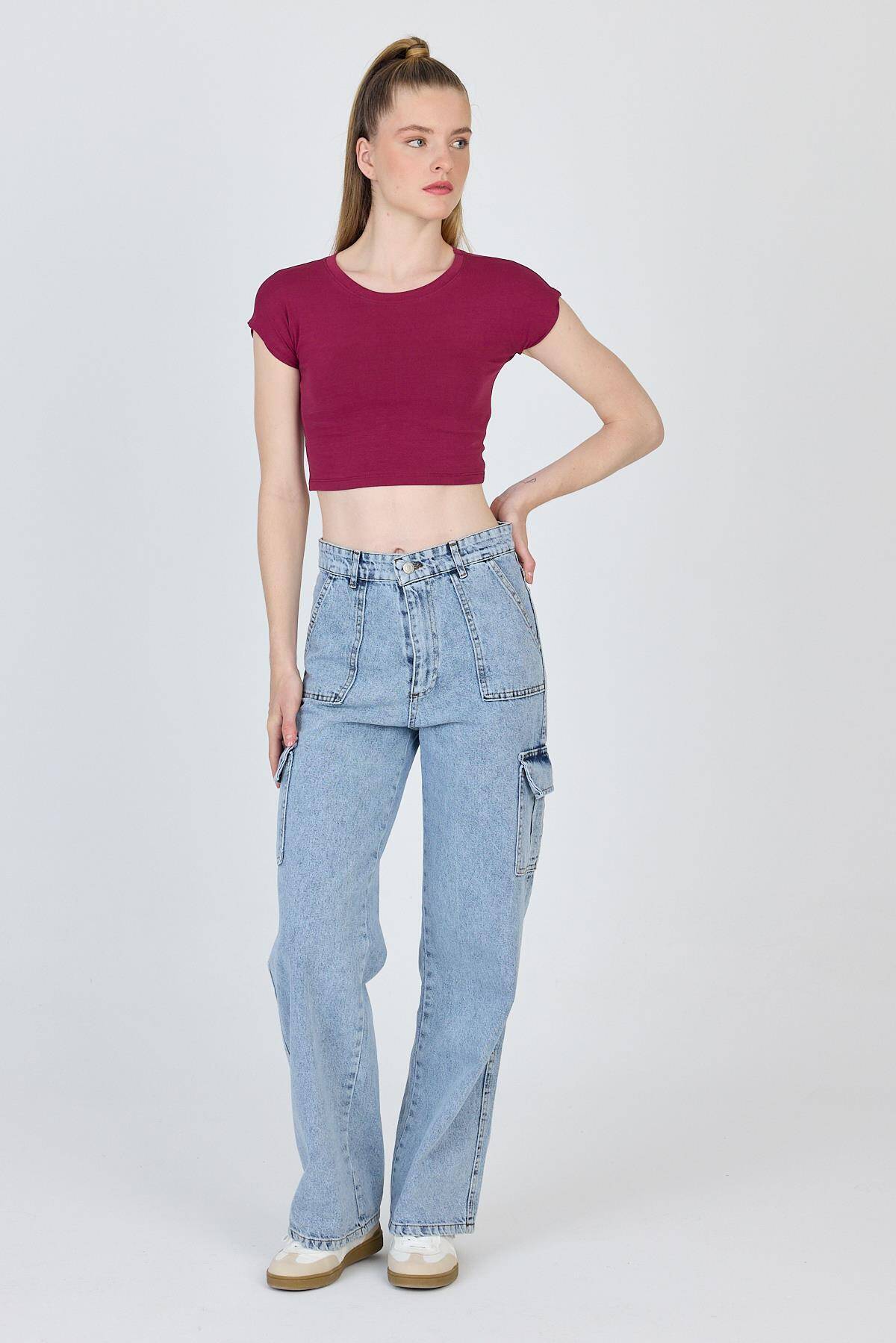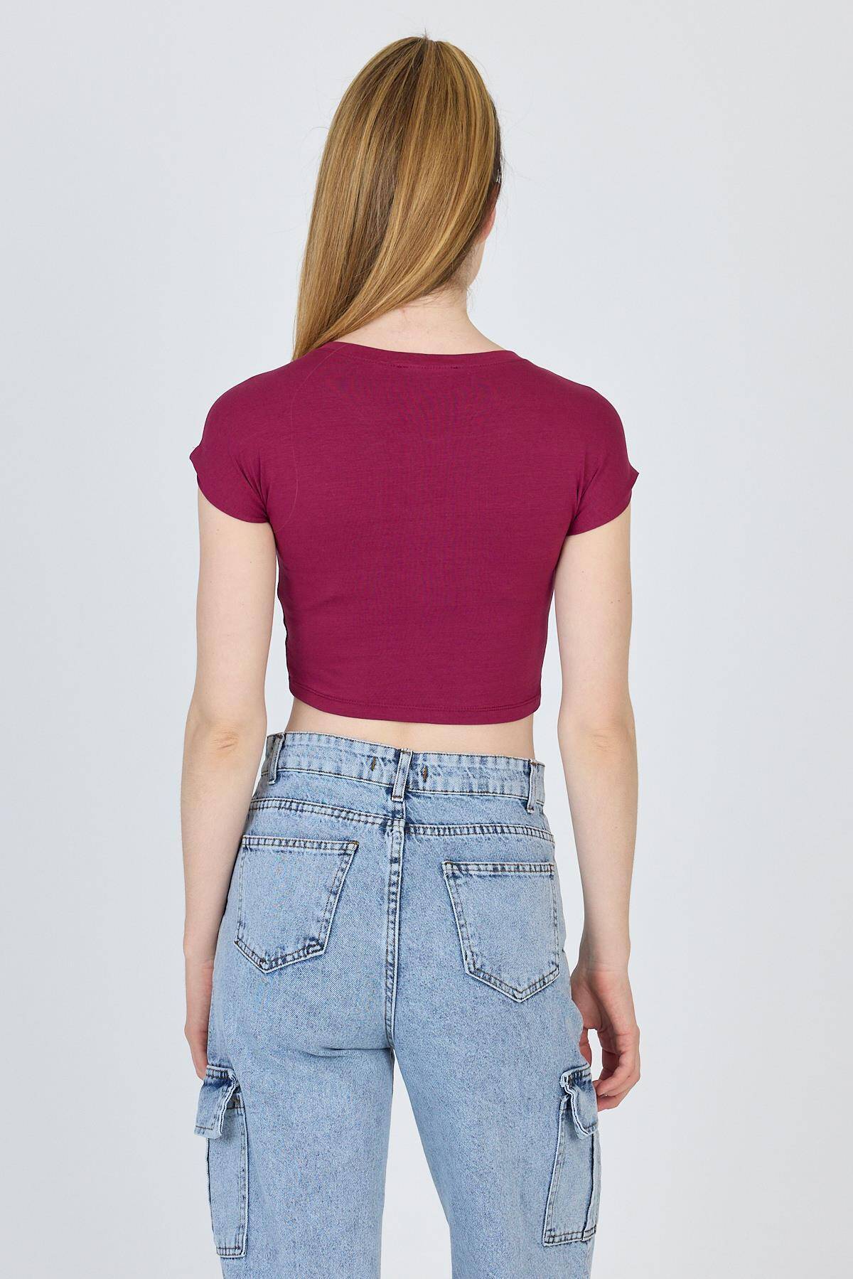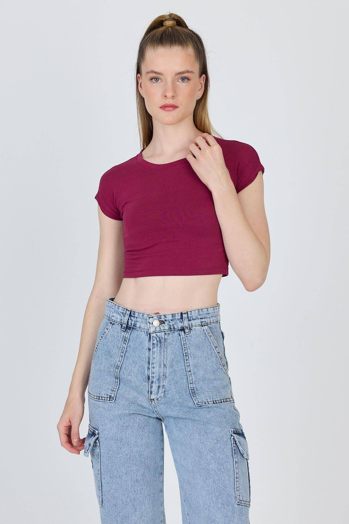 Bordo Bisiklet Yaka Pamuklu Slim Fit Crop Tişört 9199M