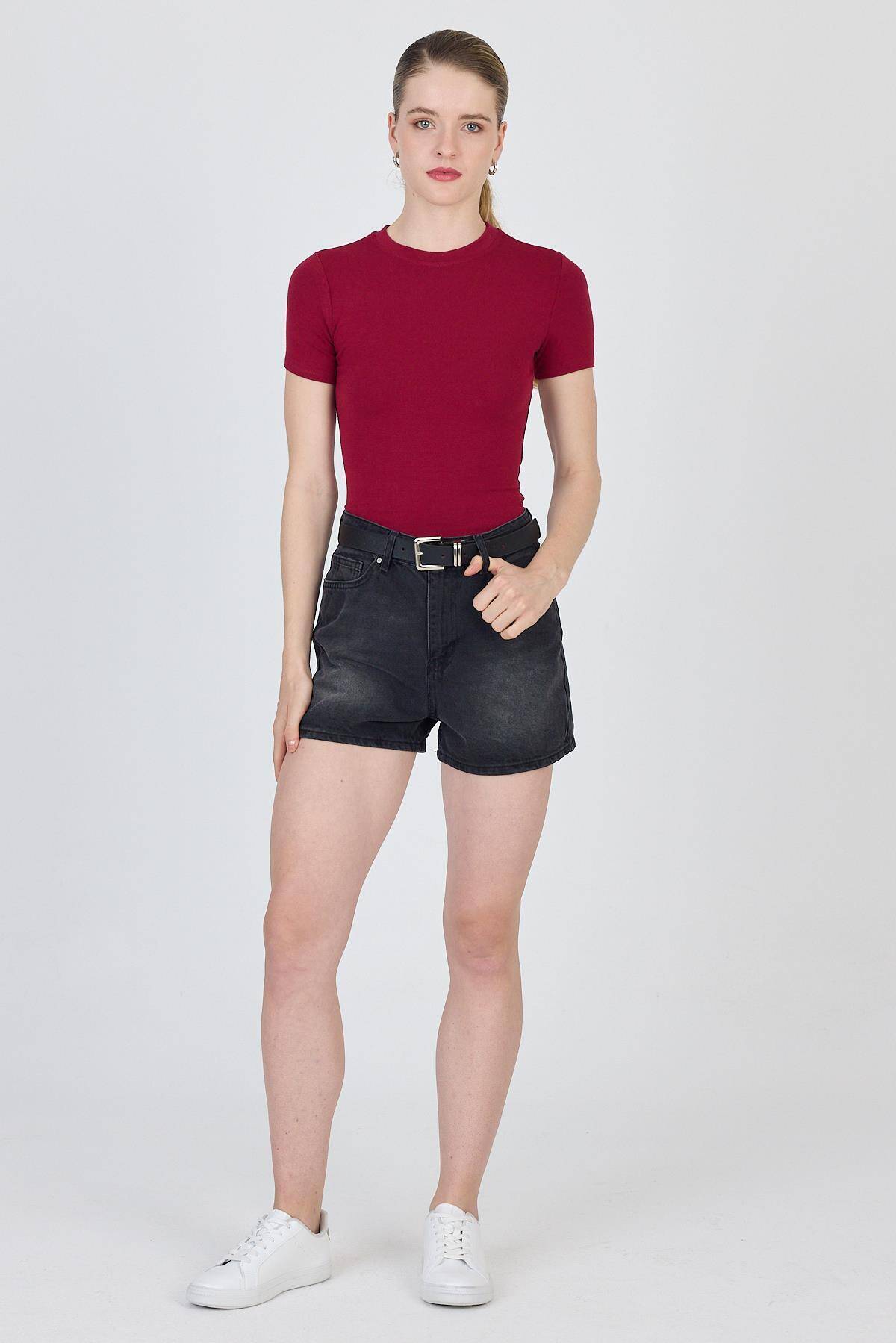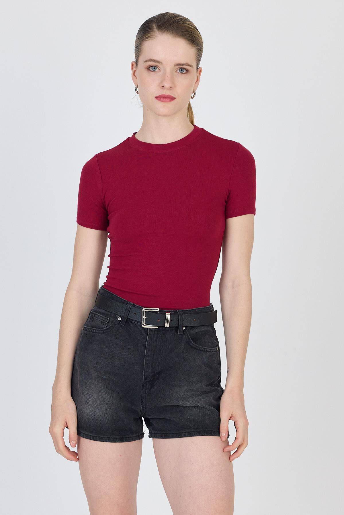Bordo Bisiklet Yaka Viskoz/Yumuşak Kumaş Slim Fit Tişört 1468