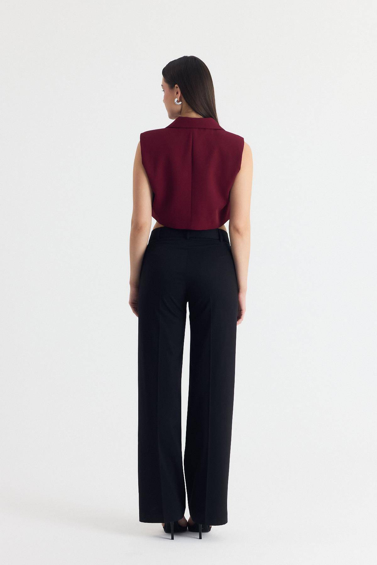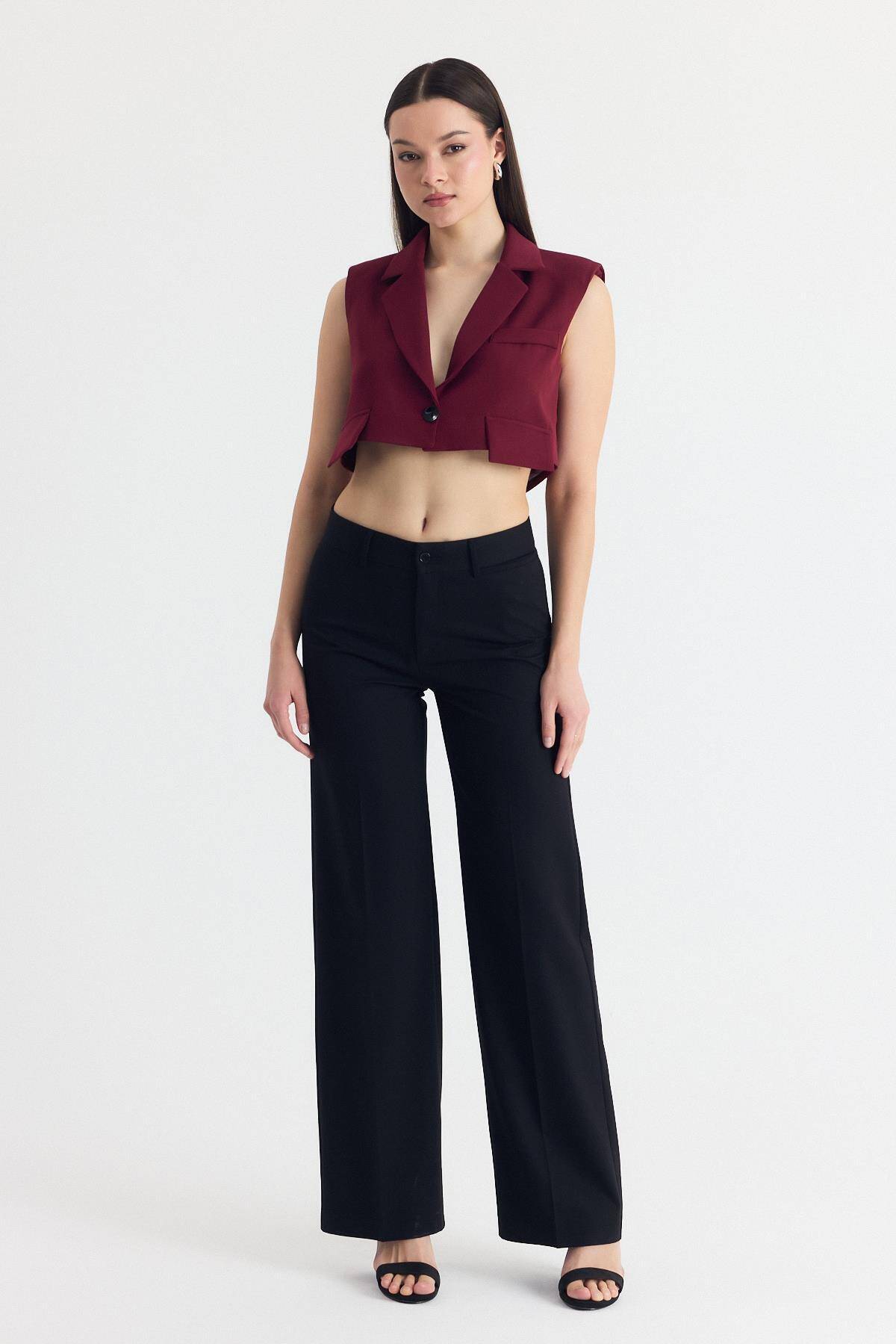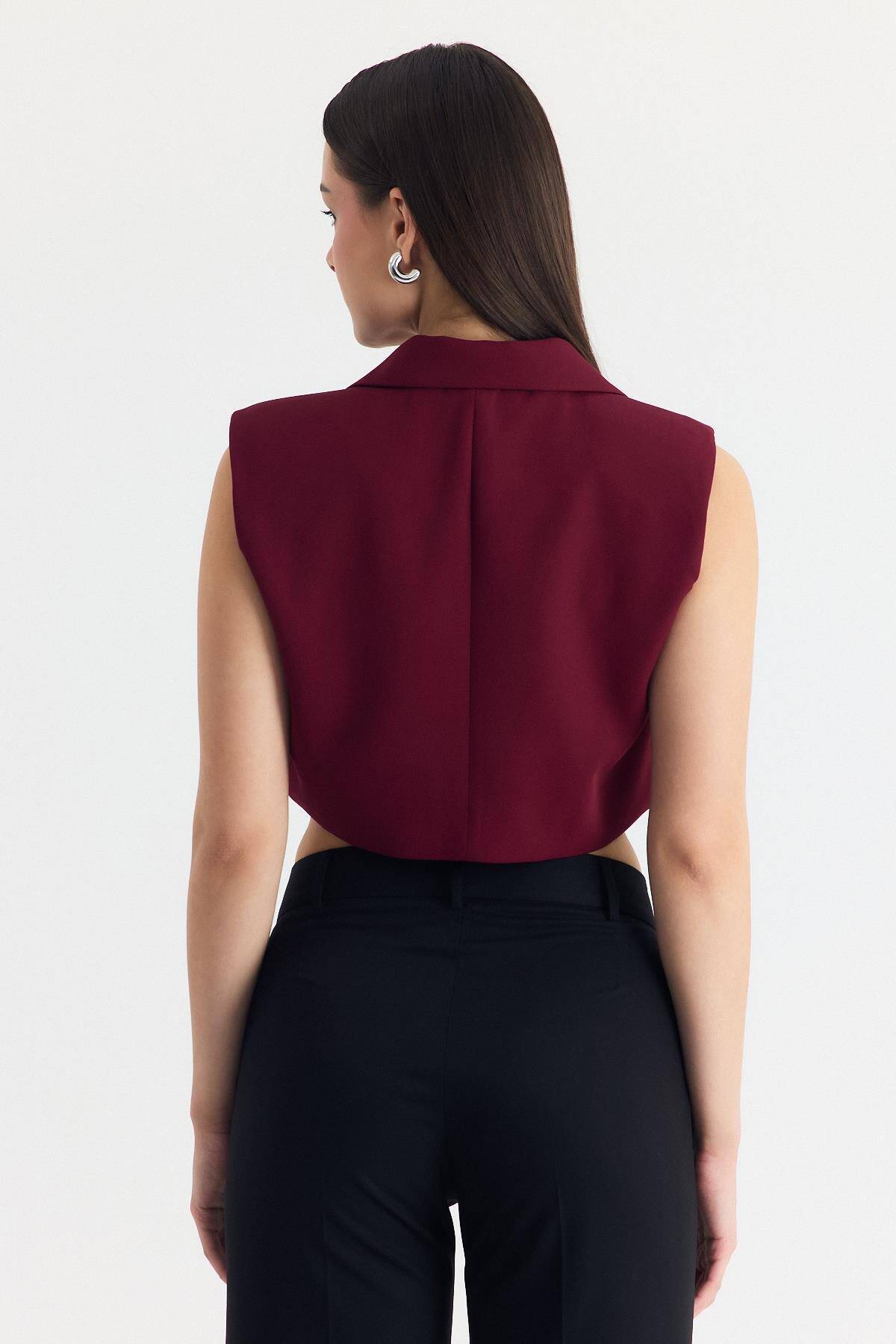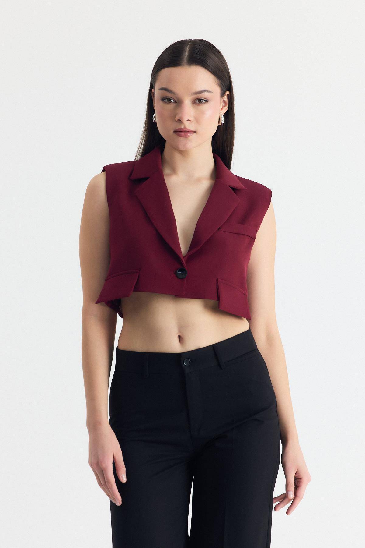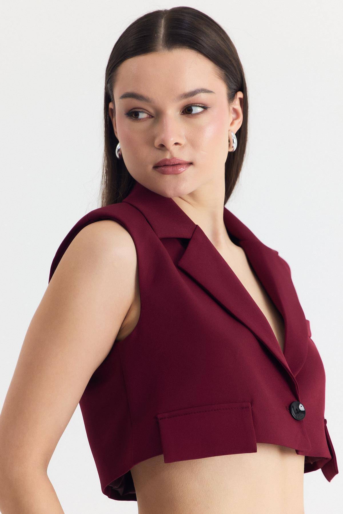 Bordo Crop Vatkalı Tek Düğme Cep Detay Yelek 6929