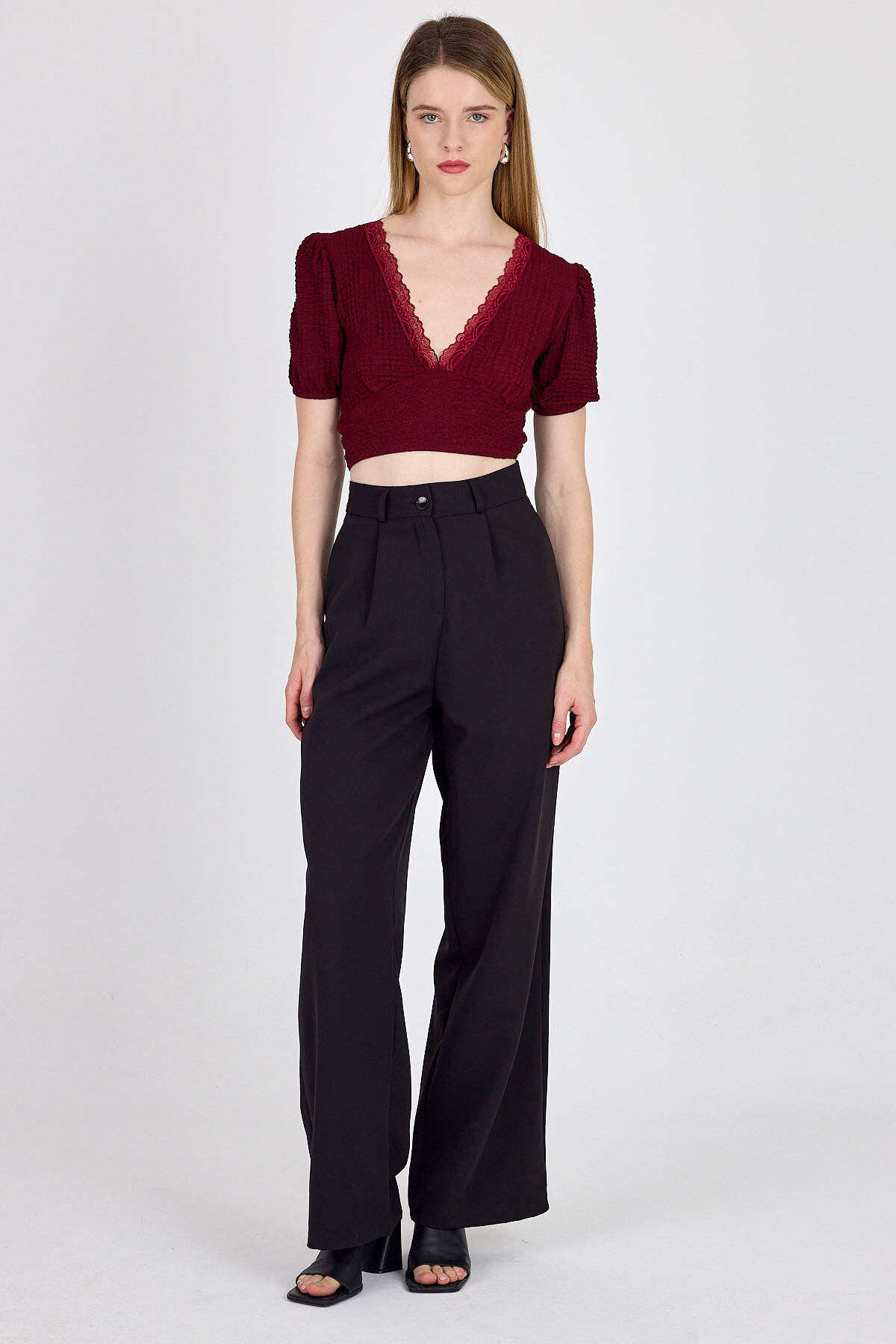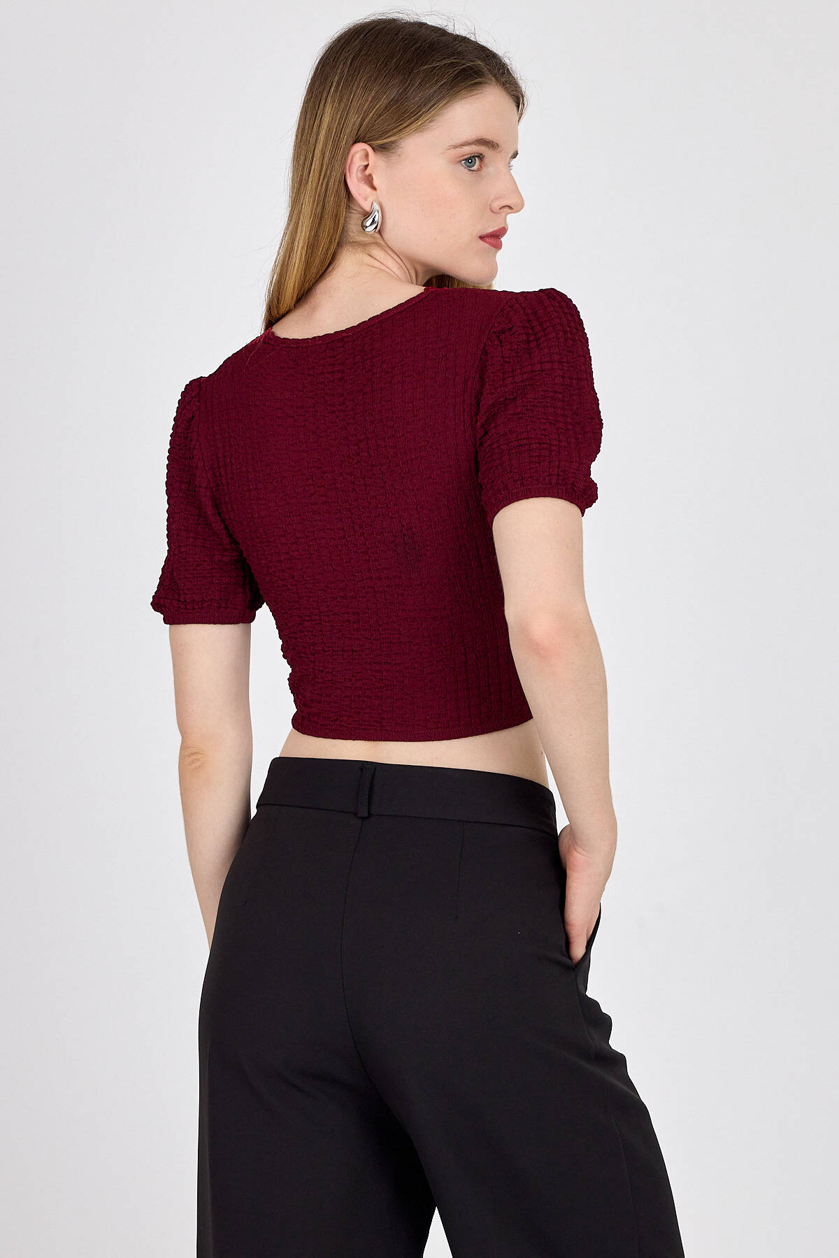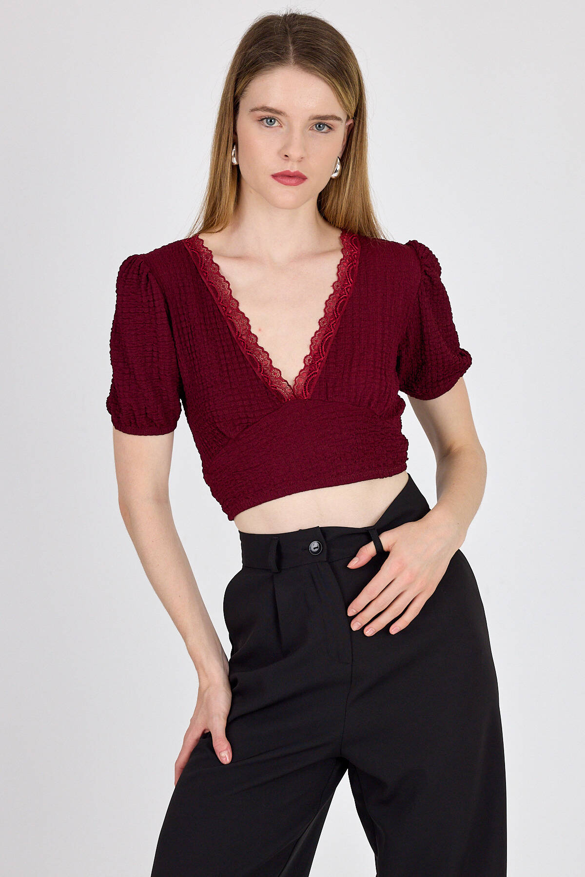 Bordo Dantel Detaylı Bürümcük Kumaş Crop Bluz 2231