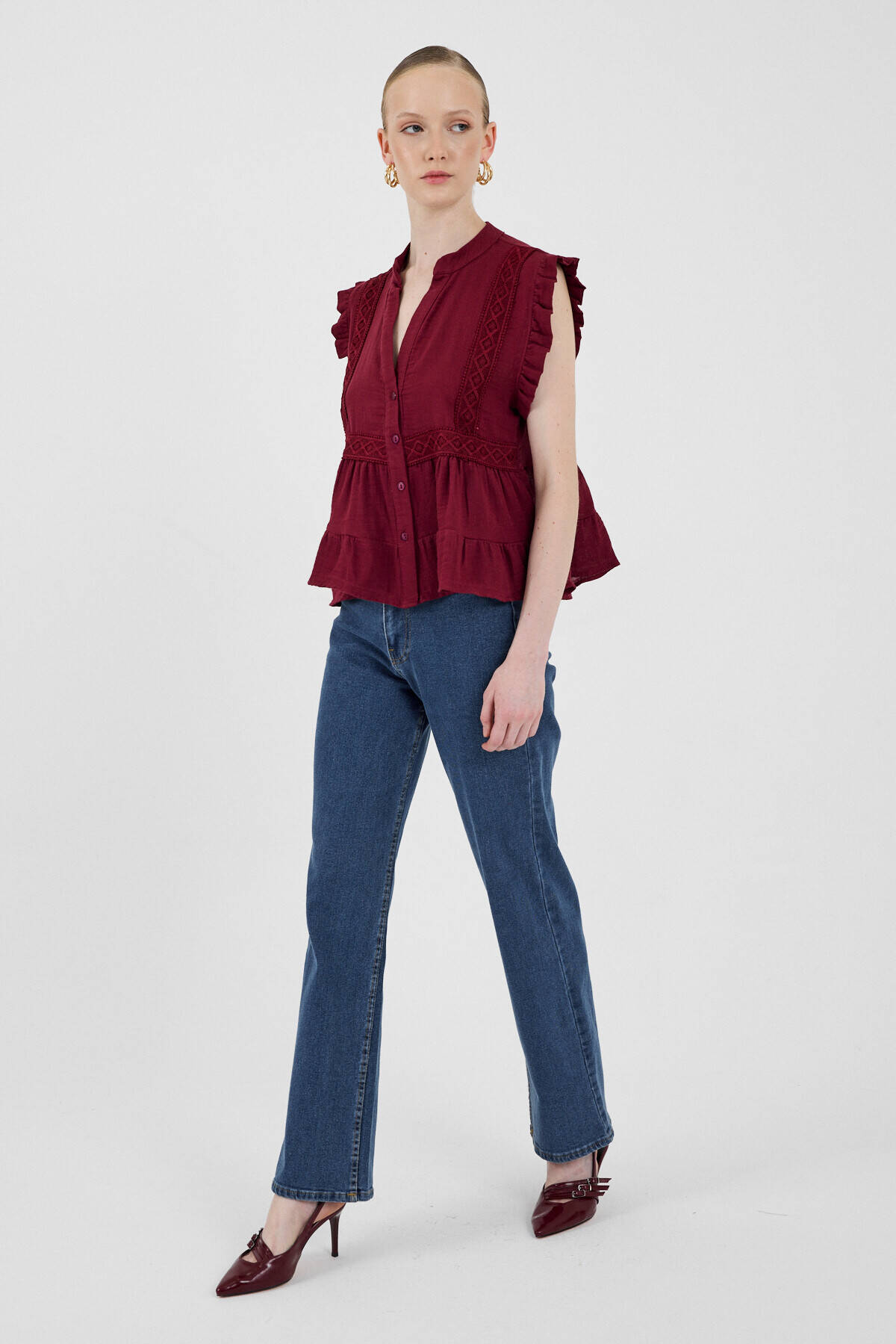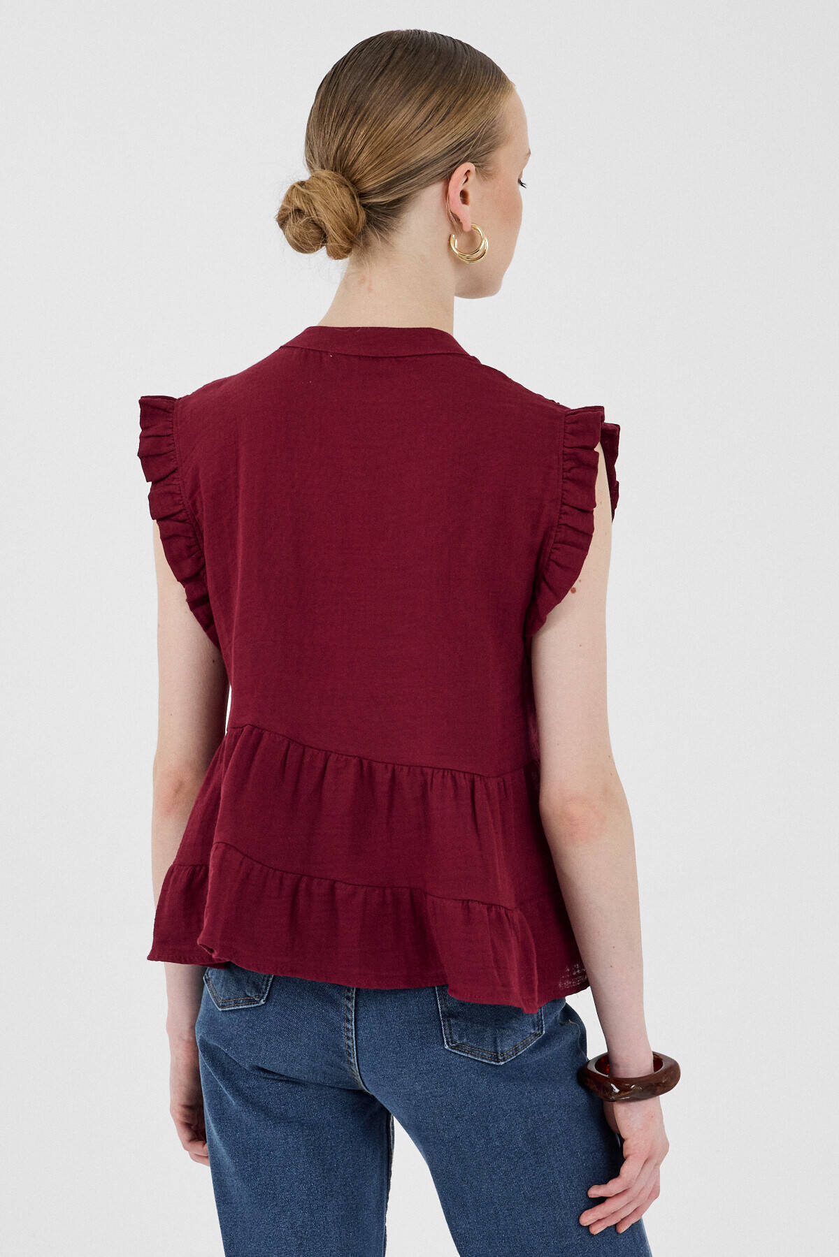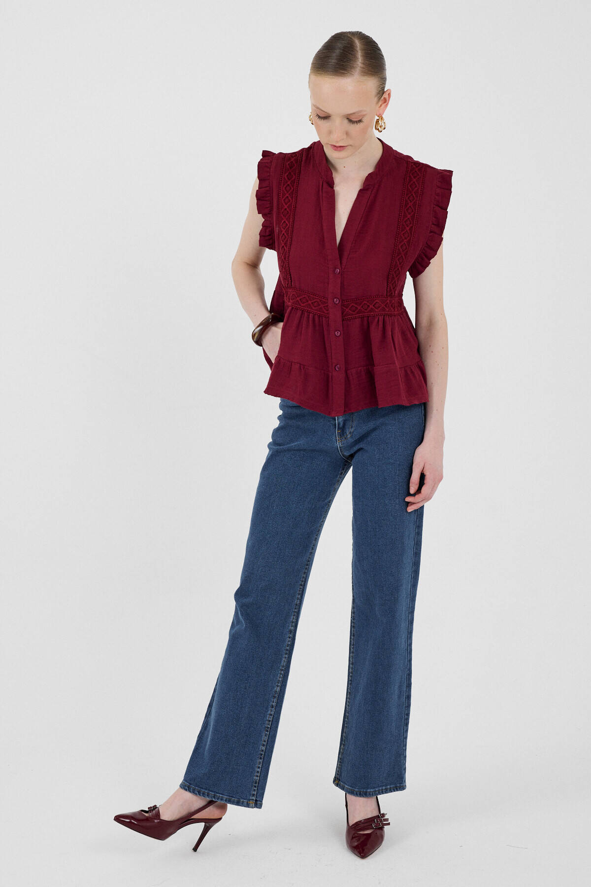 Bordo Fırfır Kollu Dantel Detaylı %100 Pamuk Müslin Bluz 8039A