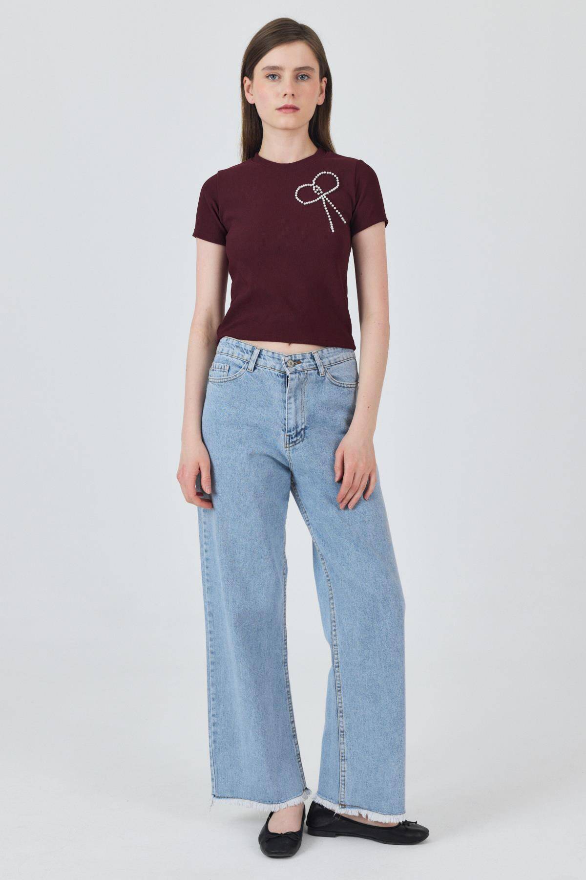Bordo İnci Kurdele İşlemeli Crop Slim Fit Tişört 2229