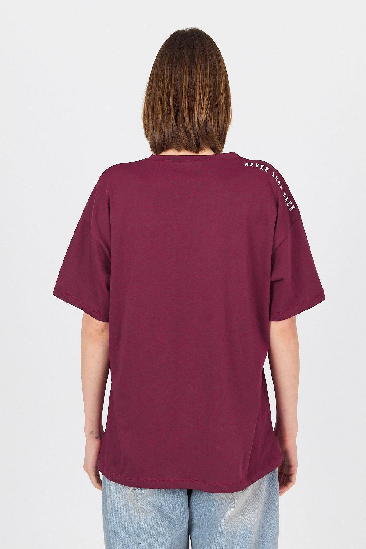 Bordo Omuz Yazı Baskılı %100 Pamuk Oversize Tişört 2150-30M