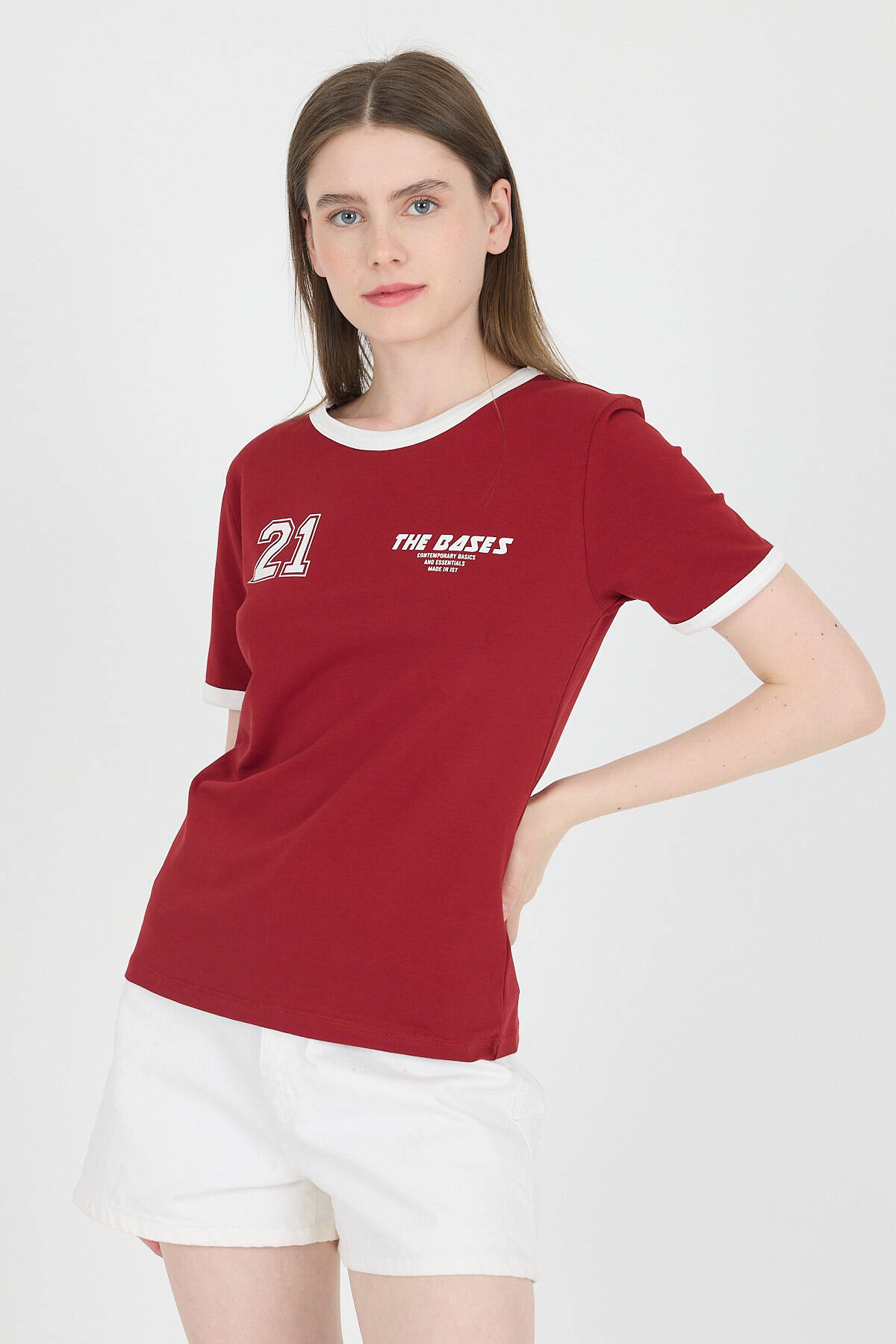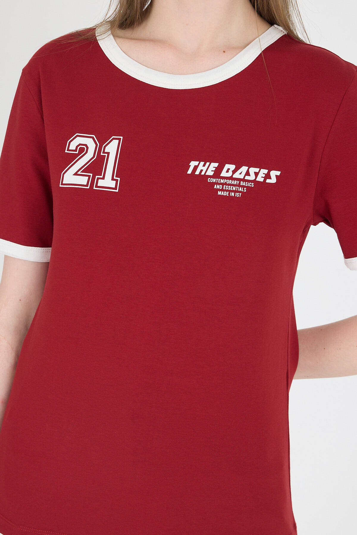 Bordo Ribanalı Yazı Baskılı Slim Fit Tişört 5981